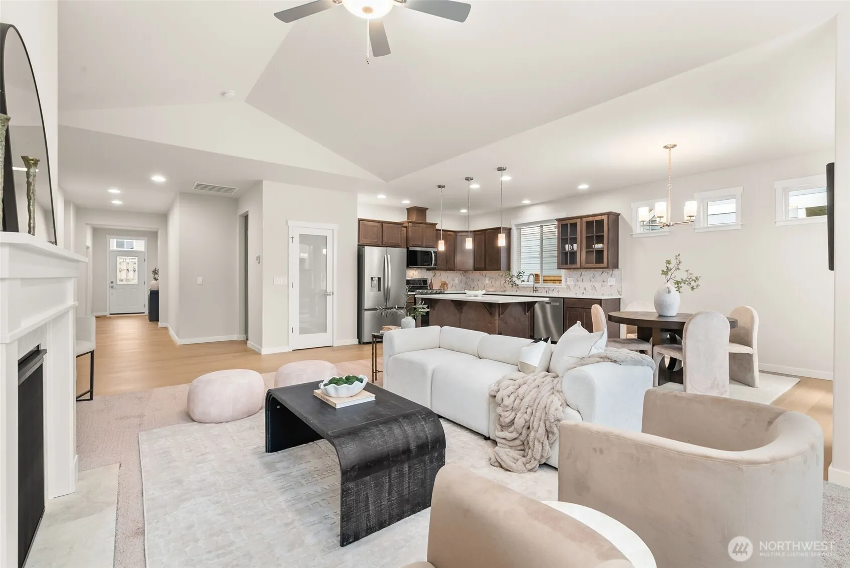 The Hemlock is a luxury rambler featuring 3 bedrooms and 2 bathrooms. The open great room flows into the kitchen, showcasing cocoa-stained maple cabinetry with soft-close drawers, full-extension guides, and an accent backsplash. Stainless steel appliances include a double gas oven, dishwasher, and microwave, plus the builder is including a refrigerator, washer/dryer, and blinds. Additional touches feature pendant lighting, hardwood floors, and clear glass French doors. The primary suite offers a 5-piece bath with tile flooring and tub surround, and quartz countertops are found throughout. The property is fully fenced, landscaped, and packed with energy-efficient features like a heat pump, solar panels, and an electric hybrid water heater. This MOVE-IN READY home is ideally located minutes from I-5 and shopping. Some photos are virtually staged.
