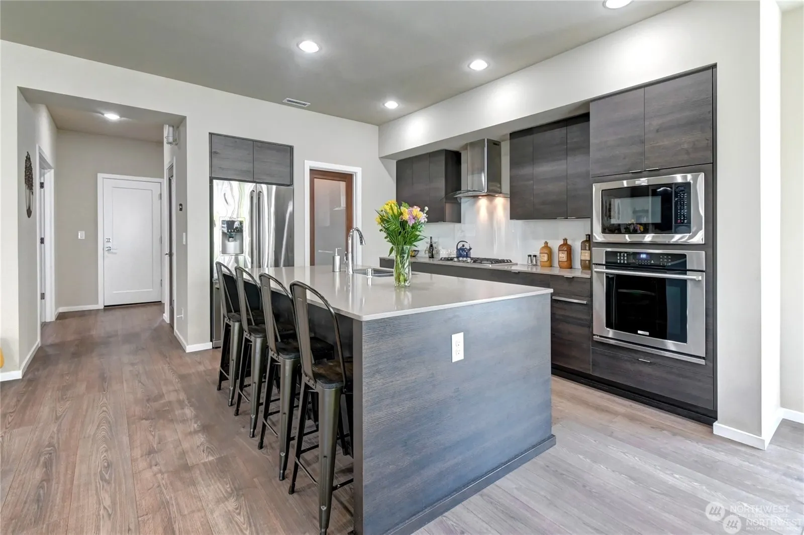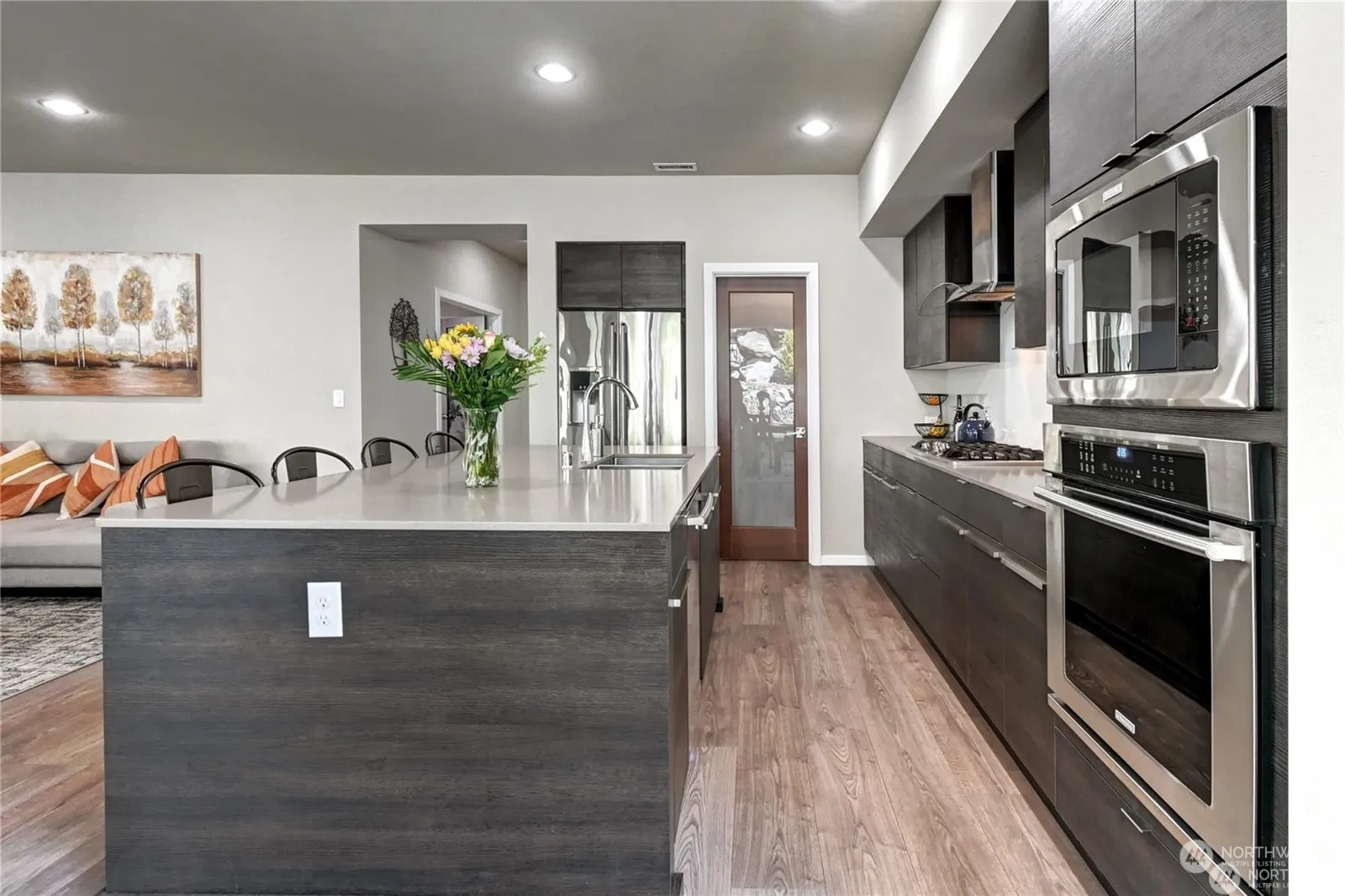 Luxury home built by MainVue is better than new w/lots of upgrades! Spacious rooms w/ 10’ tall ceilings. Main level entry w/luxurious laminate plank floors lead to open floor plan-living room, dining room, office & kitchen. Kitchen boasts expansive island, walk-in pantry, soft close drawers, quartz counters & Electrolux Appliances. Picturesque-wall of windows & sun filled rooms- slider opens to outdoor covered living space w/gas fireplace, perfect for entertaining. Other features: attractive tiered rock wall, powder on main, mature landscaping, fully fenced backyard, bonus room, large primary suite w/bath & 2 walk in closets, 3 addt’l good size bedrooms, with adjacent bath & laundry. Partial views of Monroe, Mountains, & Skykomish valley.