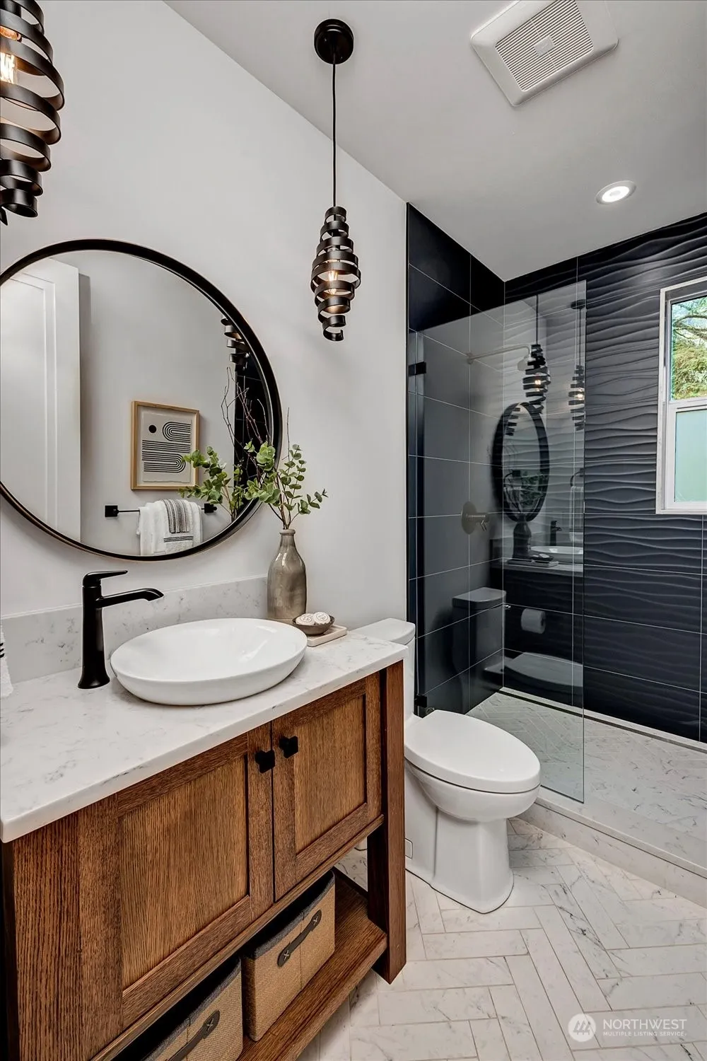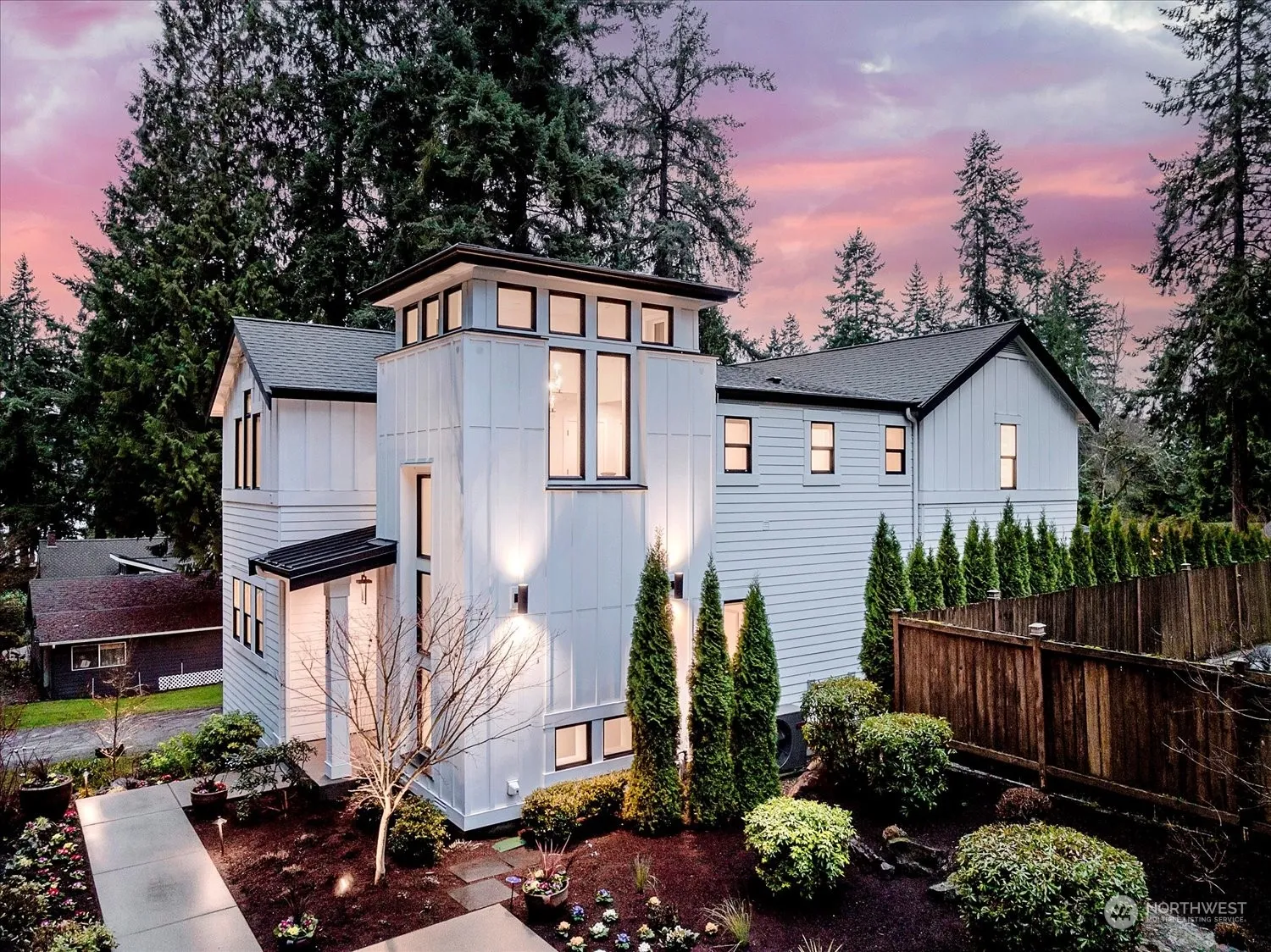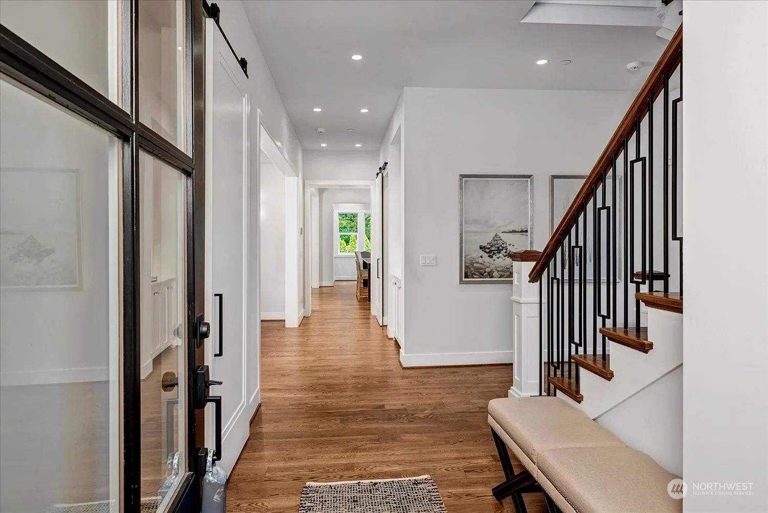 Exuding modern elegance with farmhouse charm, this home boasts a dramatic design and upscale features including hardwood floors, barn doors, and a gourmet kitchen with Subzero & Wolf appliances. Enjoy the cozy fireplace and beamed ceilings in the great room, and year-round outdoor living on the covered/heated deck. The main floor offers a versatile bedroom or office, while the primary suite upstairs features vaulted ceilings and a luxurious spa-like bath. Additional highlights include generously sized bedrooms, a lower level with a huge rec room, and a large 3-car garage with an electric car charger.