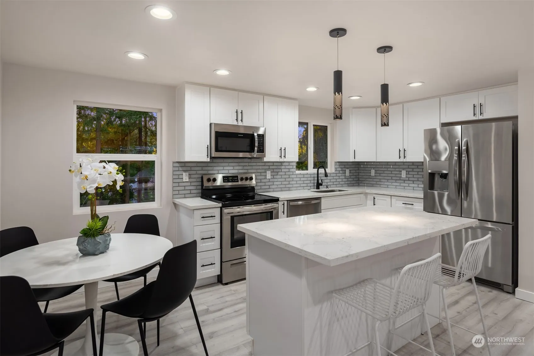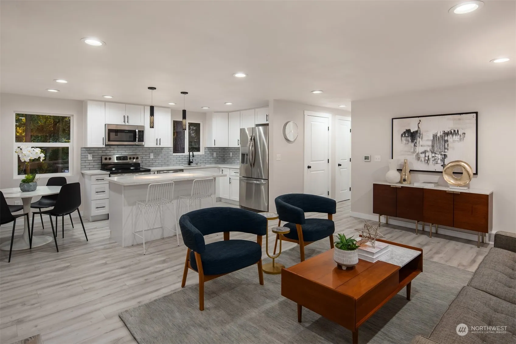 Charming mid-century home with open concept layout + exquisite renovations throughout. Interior spaces are bright with a stylish + modern color palette. Two living areas are accented by inviting fireplaces. Stunning kitchen features tasteful quartz counters, striking white cabinets + stainless appliances. Private primary bedroom with ensuite. Two full baths are expertly updated. Fantastic outdoor space with fenced + terraced backyard. Patio provides ideal spot for entertaining in warmer months. Towering trees create idyllic + secluded natural setting. Recent electrical, plumbing, roof + A/C. Located in highly regarded Shoreline School District, near major commuter routes, dining + parks.