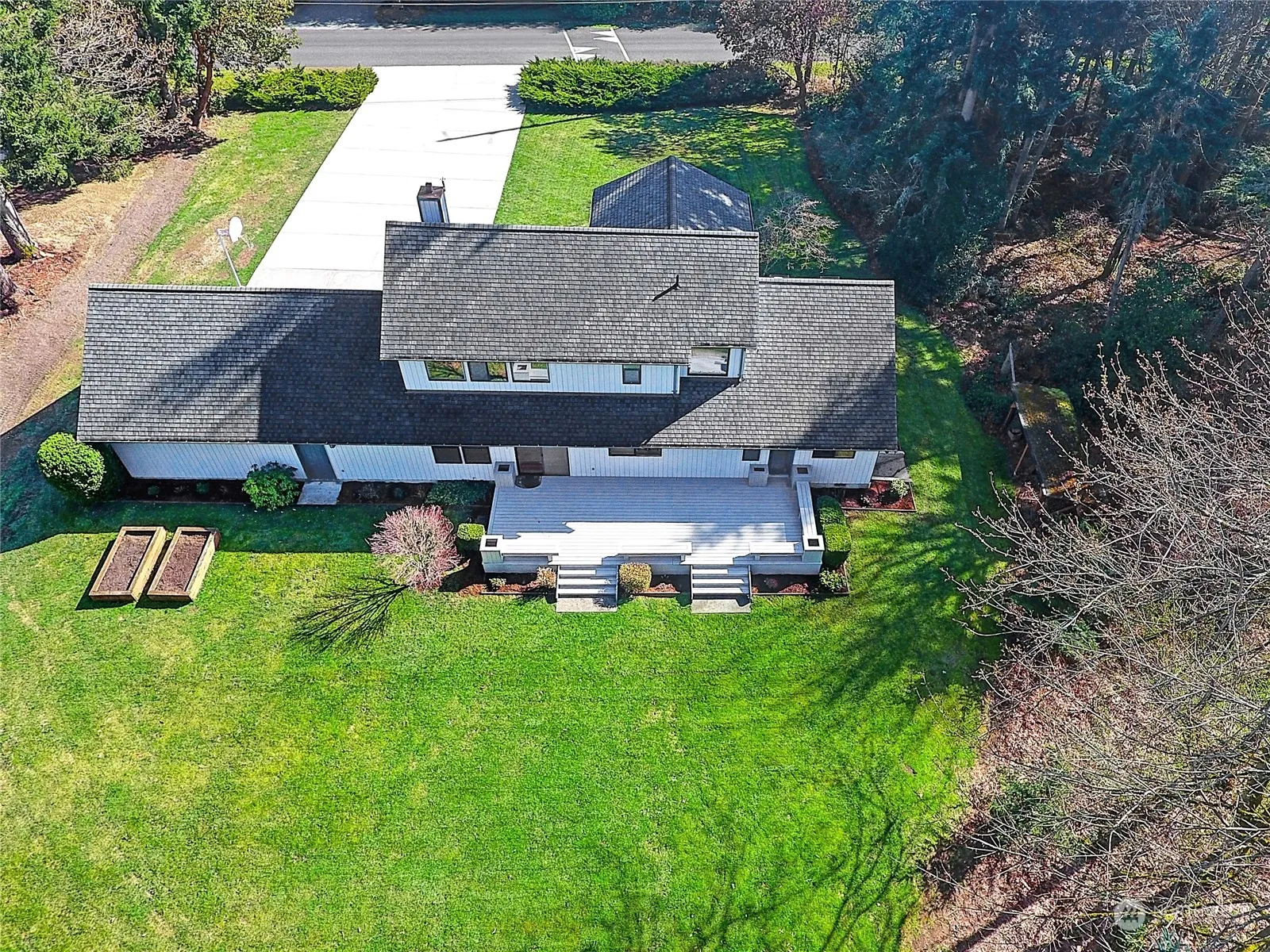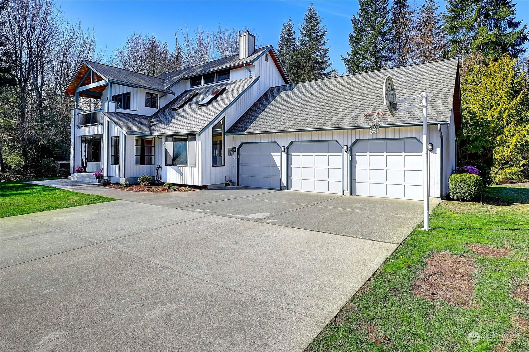 Beautiful Michael way home on 2.5+ wooded acres w/walking trails and large front and back yards. Huge cement driveway plus Rv/boat parking. large 3 bay garage w/freshly painted floor, shelving, and workbench. Grand entrance w/covered entry patio leads into living room w/vaulted ceilings, skylights, hardwood floors and wood freestanding stove. Kitchen features Corian counters, solid wood cabinets, new fridge, and sink w/view of backyard. Slider opens to large composite deck with built-in planters & steps to backyard. Master bed has private covered deck, large walk-in closet, jetted tub, and ensuite bath with tiled shower. 25k in recent updates; new carpet throughout bedrooms & bonus room, new skylights, fresh paint, landscaping & much more.