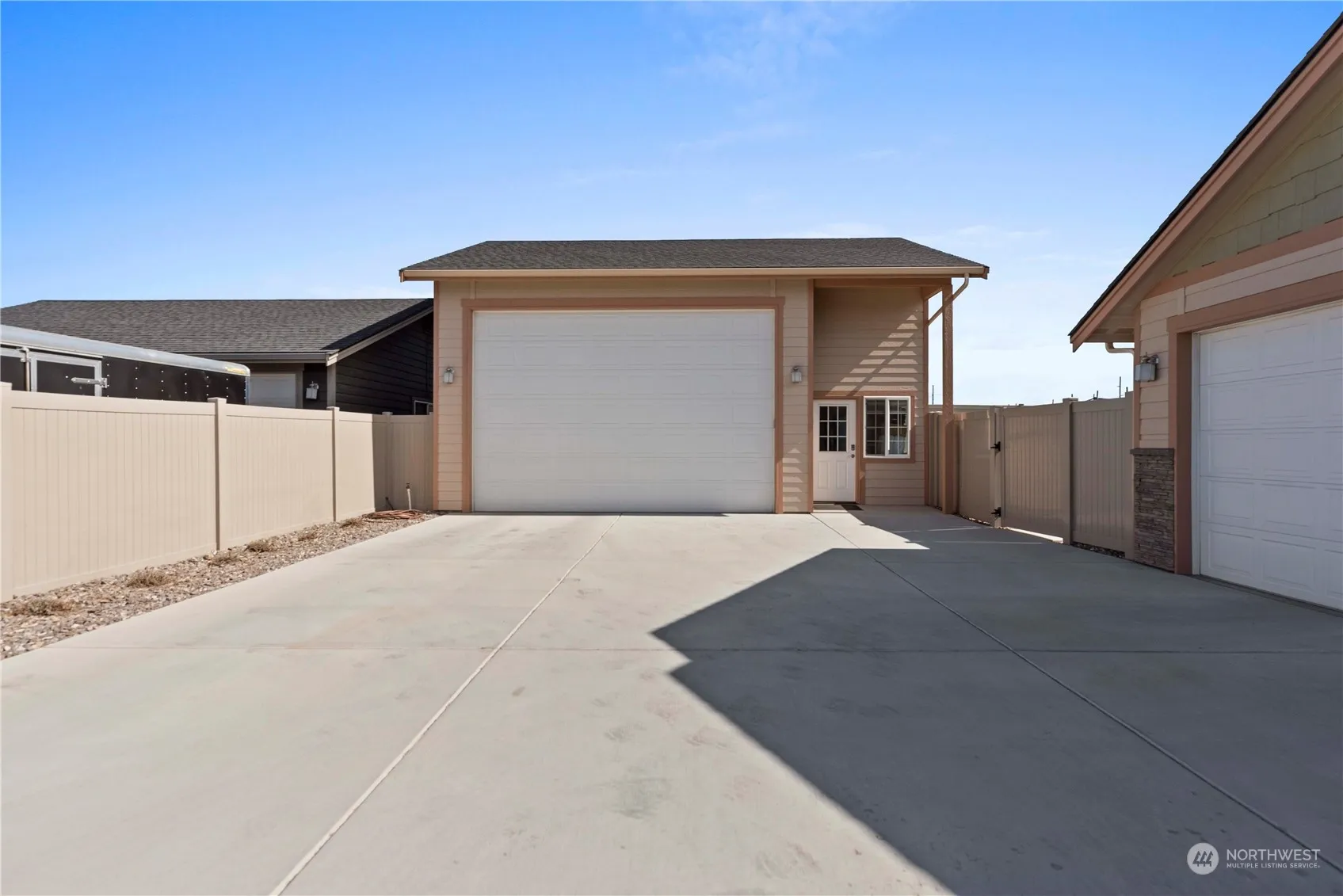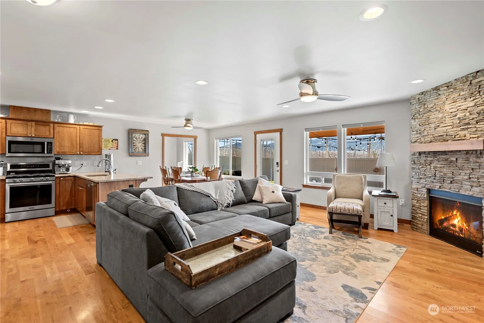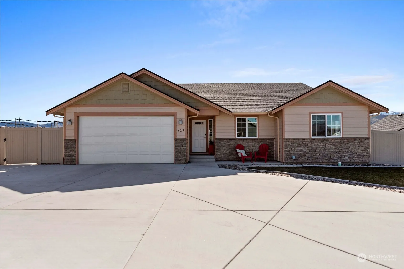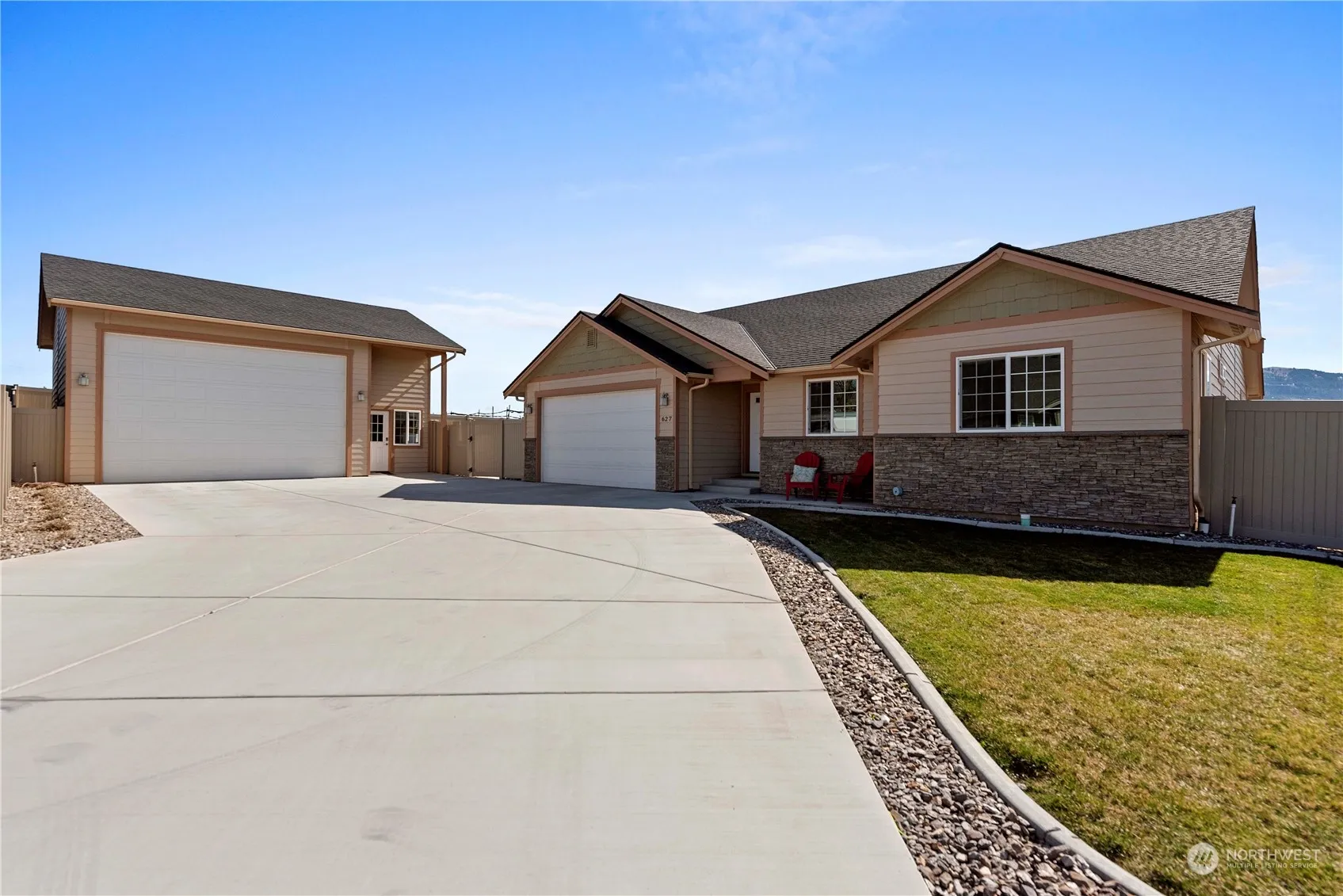 Gorgeous Hanson home 3 bed rambler with high-end finishes throughout. This large .29 acre corner lot is perfect for those looking for additional space for projects and toys. Both attached 2 car garage plus an additional 800+ sq ft detached garage/shop with extra tall ceilings & doors. Spacious great room features stone fireplace, kitchen w/ stainless appliances, granite counters, breakfast bar & recessed lighting. Stunning hardwood floors are showcased throughout. Easily work from home with spacious office/den. Master suite offers attached bath with dual granite vanity, walk-in closet and skylight above. Relax and entertain outdoors with beautiful mountain views. Fully-fenced with patio, irrigation & sprinkler system.