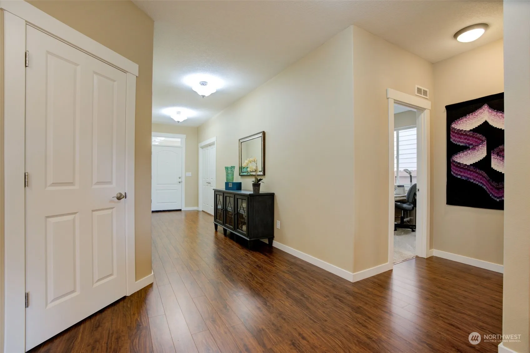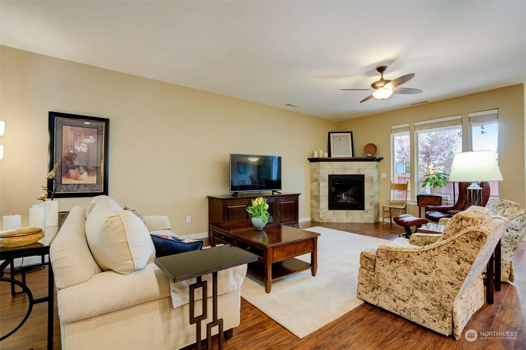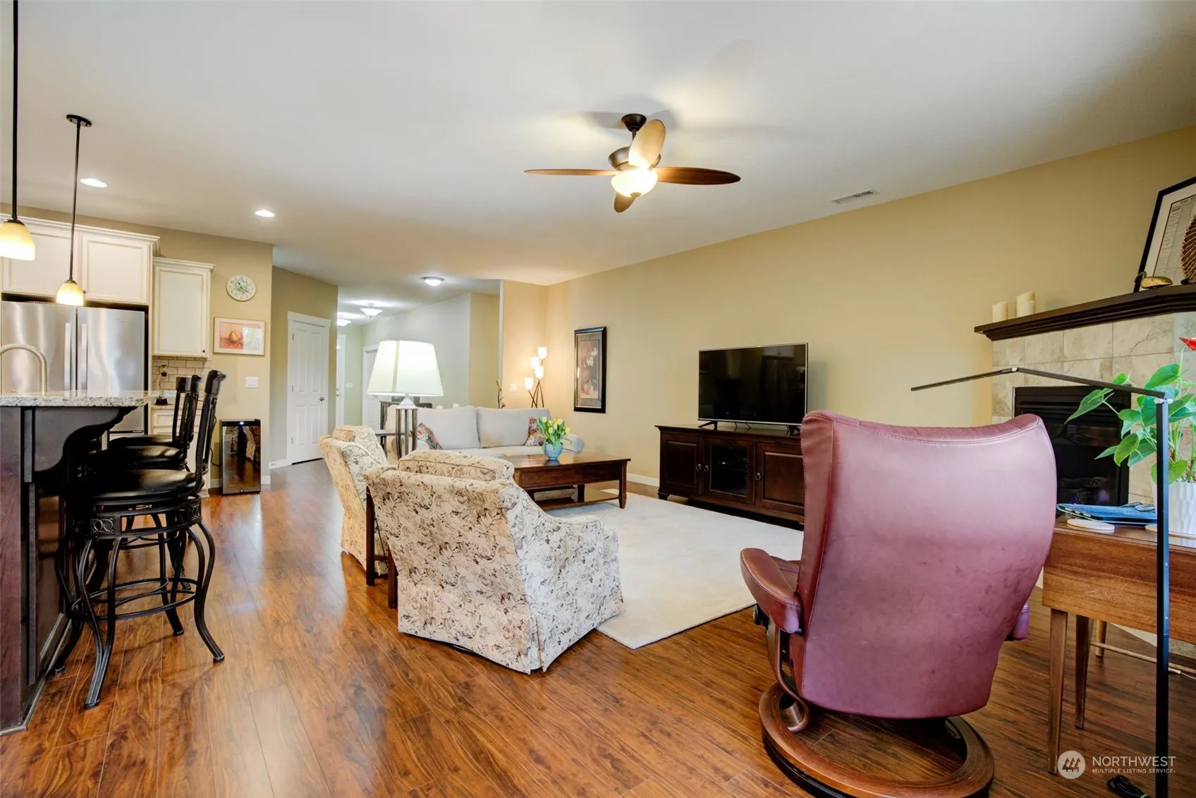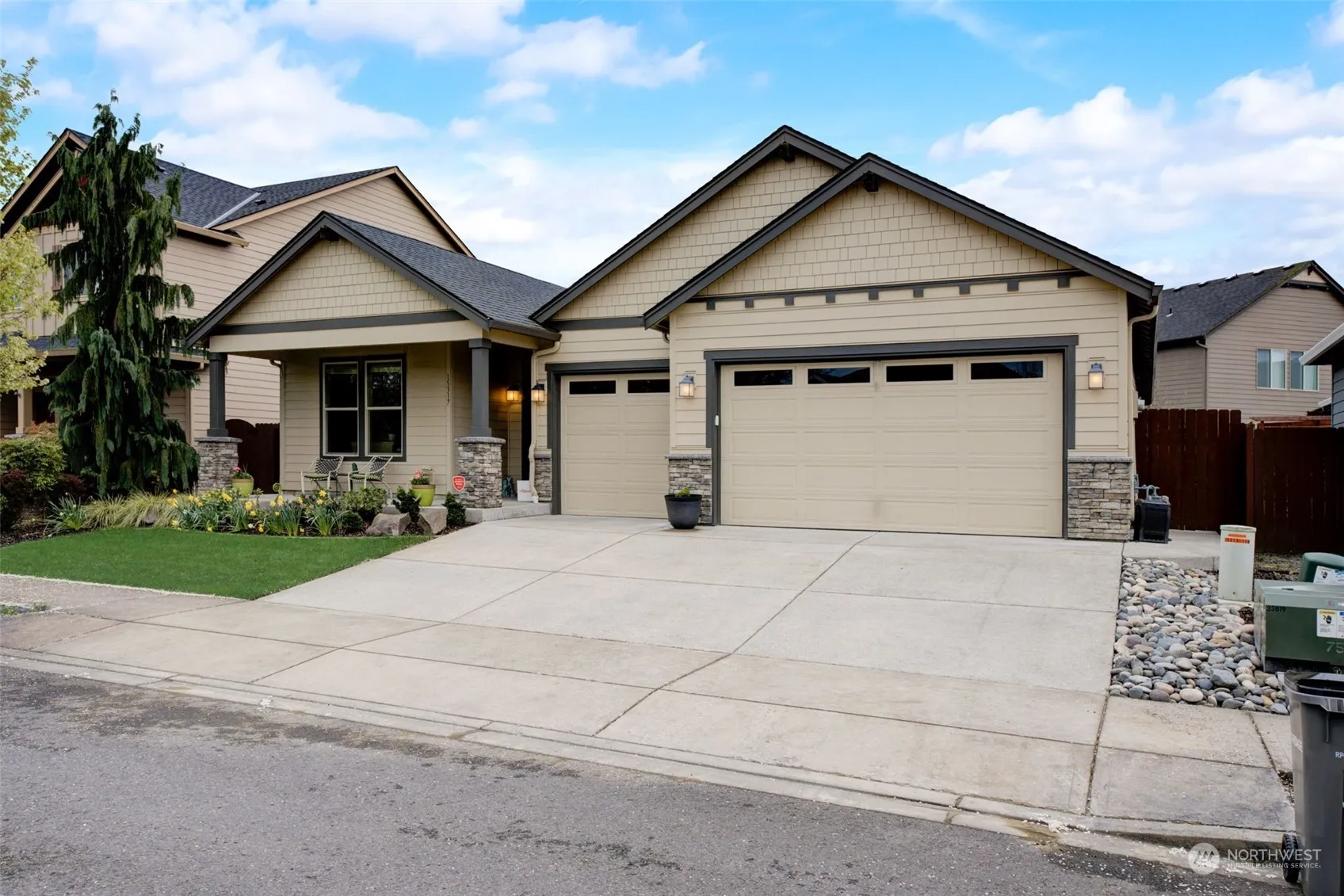 This charming home boasts a welcoming large covered front porch, leading into a spacious interior. The open great room concept features a cozy family room with a gas fireplace and ceiling fan, alongside a gourmet island/breakfast bar kitchen equipped with stainless appliances, granite countertops, custom cabinetry, and walk-in pantry. The separate kitchen dining area opens to a covered patio and backyard. The primary en-suite offers a walk-in closet and bathroom with dual sink tile vanity and shower tiled to ceiling. Two additional bedrooms, a den/office and a well-equipped laundry room complement the split bedroom design. Outside, enjoy the large covered back patio and landscaped yard with a 3-car garage including free-standing cabinetry.