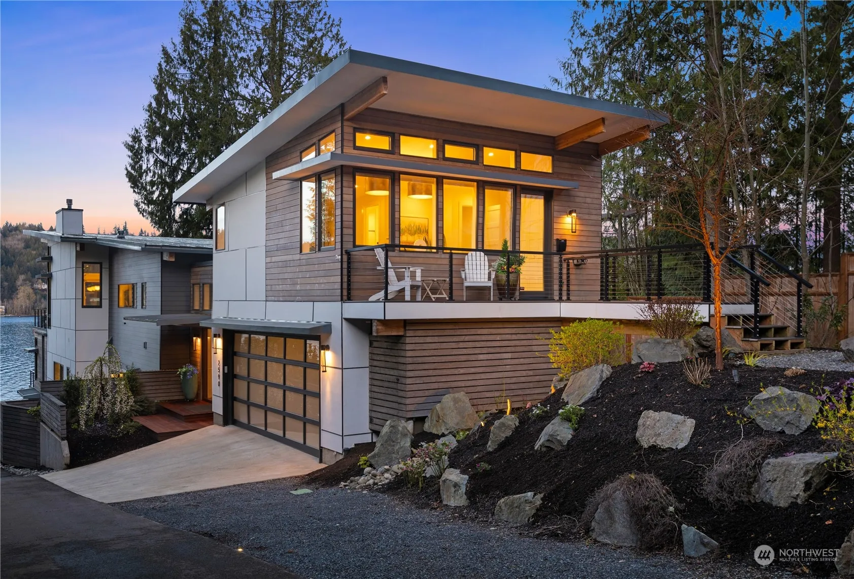 Nestled amongst the evergreens, a contemporary sanctuary awaits overlooking Lake Sammamish. Meticulously crafted to seamlessly merge modern luxury with the beauty of the natural setting. Step inside to find clean lines and curated finishes throughout. Designed for entertaining, the expansive chef’s kitchen with scullery kitchen and statement lighting connects to sprawling partially covered lakeside deck. Retreat to spa-like primary ensuite, with heated floors, expansive walk-in closet, and own W/D. Lower level lends versatility with mini kitchen, living space with fireplace and bedroom. Utilize separate office with private entrance, kitchen, and bath for guests or remote work. Outdoor features a manicured lawn, garden, firepit, and hot tub.