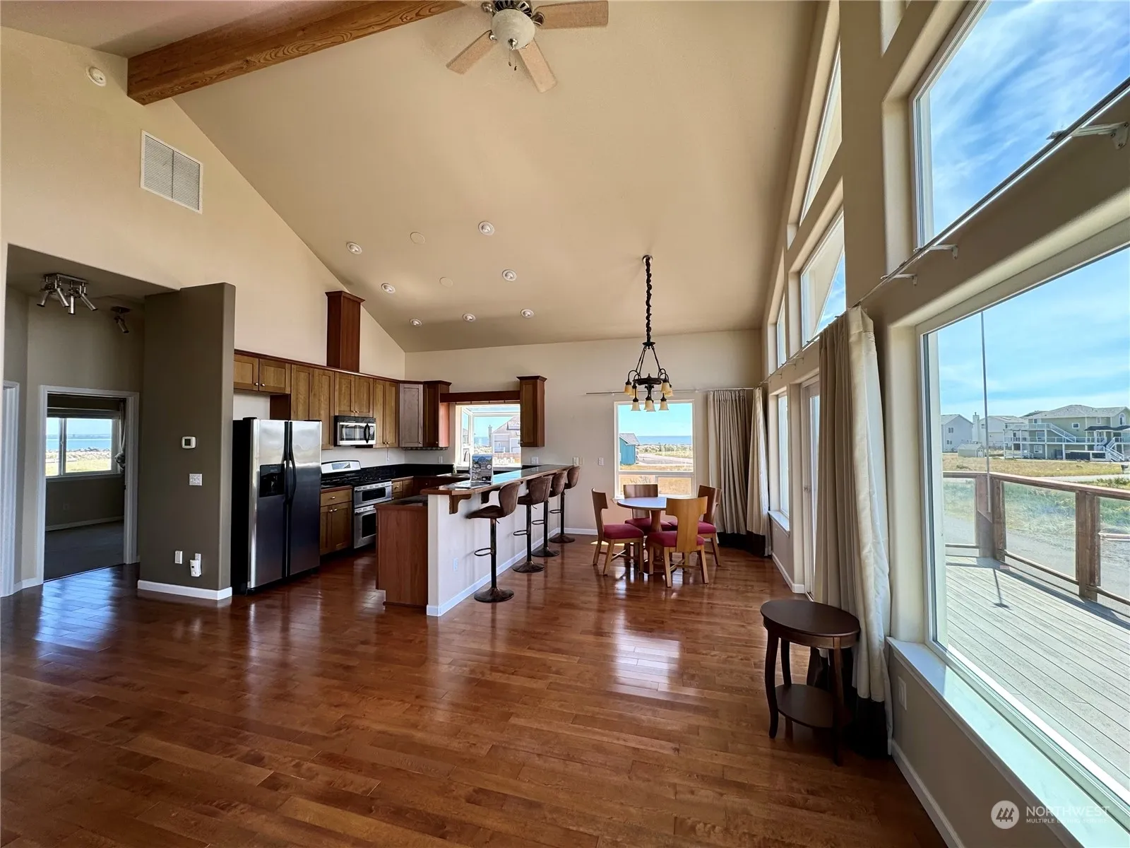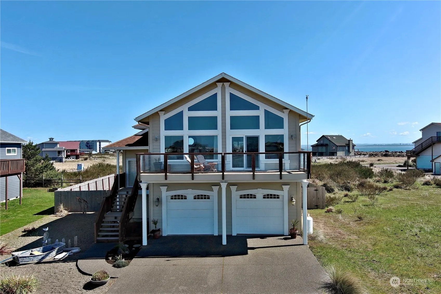 Sunrises, Sunsets, Mountain, Ocean/Bay & Jetty Views! Abundance of space throughout w/10ft ceilings, exquisite custom river rock fireplace, hardwood flooring, vaulted ceilings on the upper level, stunning wall of windows framing panoramic views that stretch as far as the eye can see, 2 bedrooms/bathrooms up, 2 bedrooms/1 bath down. Oversized garage, central vac, heat pump, RV parking, new exterior paint. Generous front deck to take in the spectacular ocean/bay views & an addtl. covered deck off the primary bedroom w/sunrise views, glimpses of Mt Rainier & the bay, overlooking the fully fenced back yard centered around an extraordinary circular fire pit, perfect for gatherings & creating memories under the open sky. LID paid/member of OS CC.