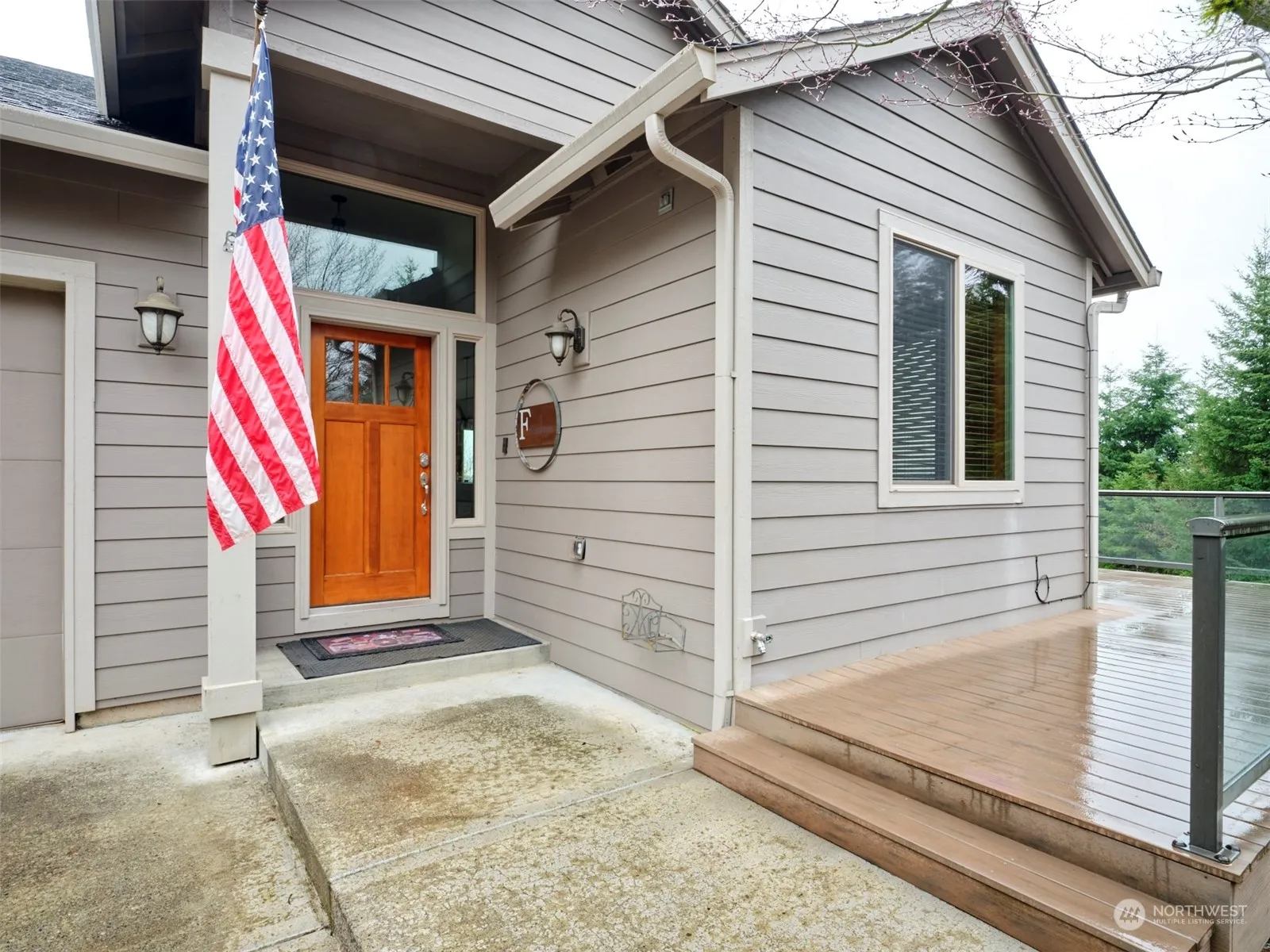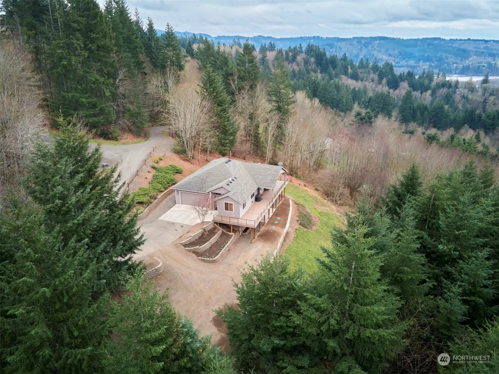 Attractively curated NorthWest style home nestled in the trees on a private road! Welcoming w/open living spaces & fabulous bank of windows. Large kitchen w/cook island that flows into the dining & living rm. Natural wood cabinetry, mill-work, built-ins & solid core doors throughout, make this home special. Hardwood floors & built in propane fireplace. Lower level offers addl living space, bedroom, bath & patio, offering sep. living qtr potential. Partially covered expansive 9.5′ x 70′ deck w/ hot tub. Lots of parking. Close-in country location. 2.25% VA ASSUMABLE loan!!! Don’t miss the video tour! Area rich w/recreation, w/Lewis River Golf Course close by, world-class fishing, mountains to ski and trails galore. Life is really good here!