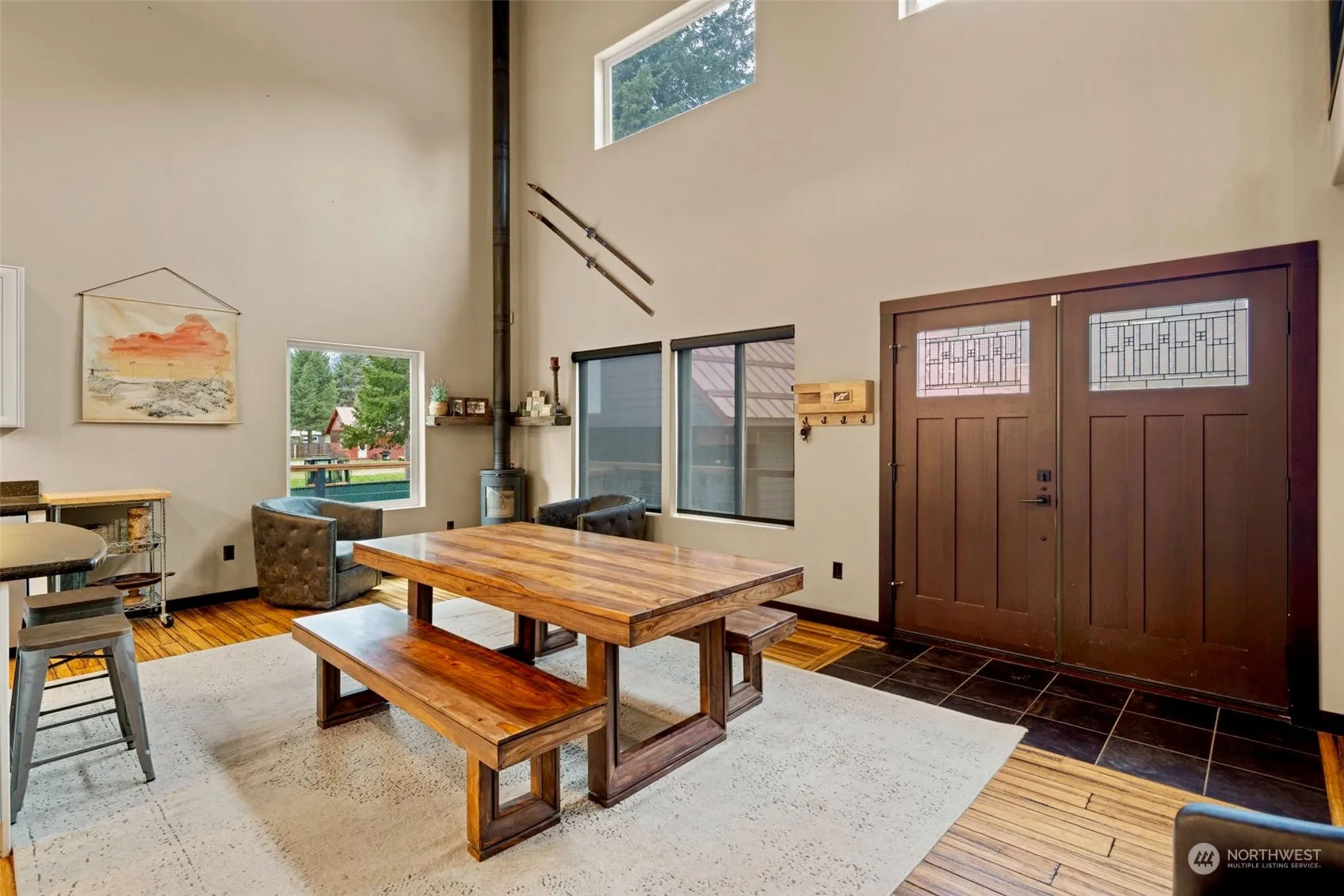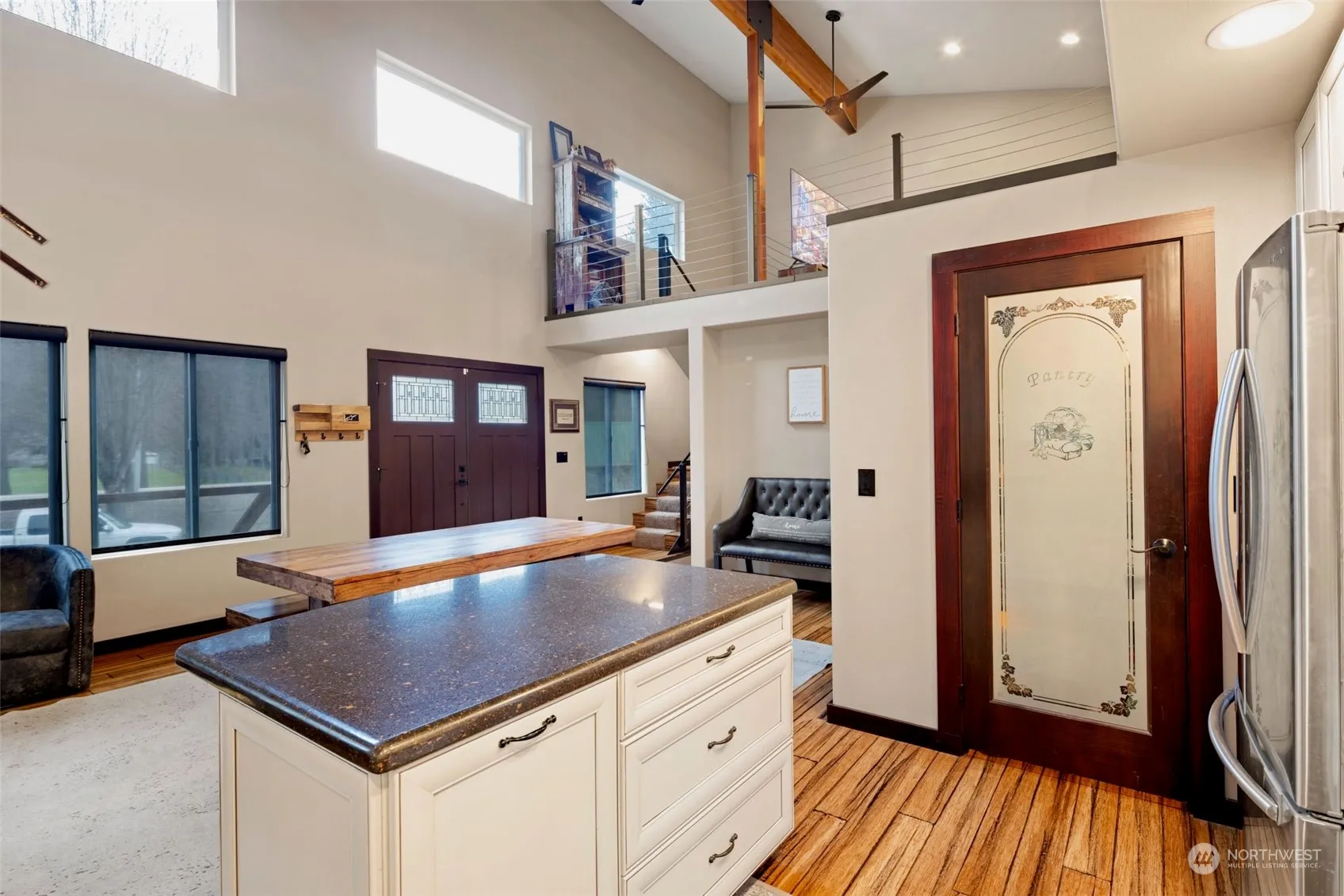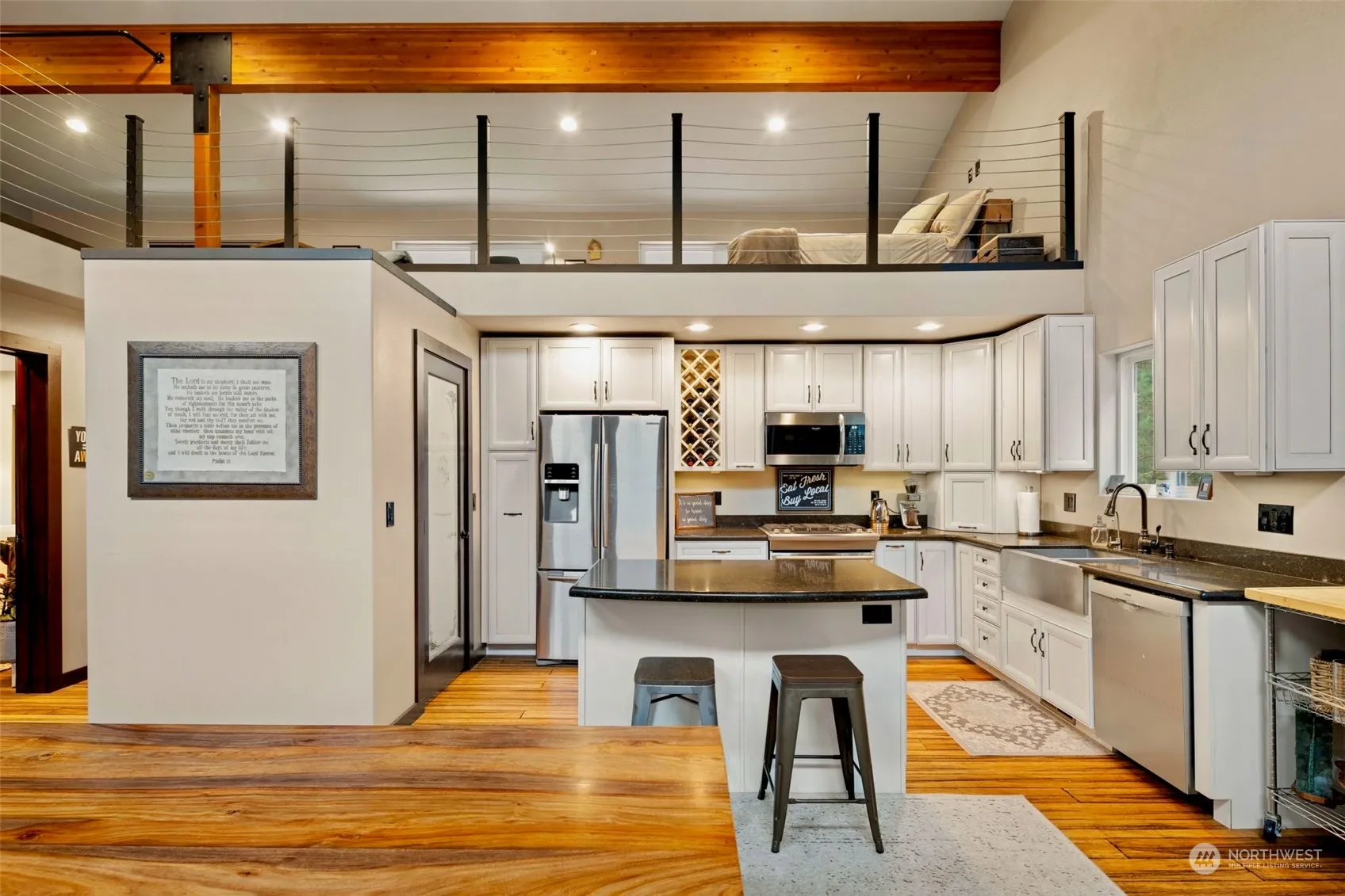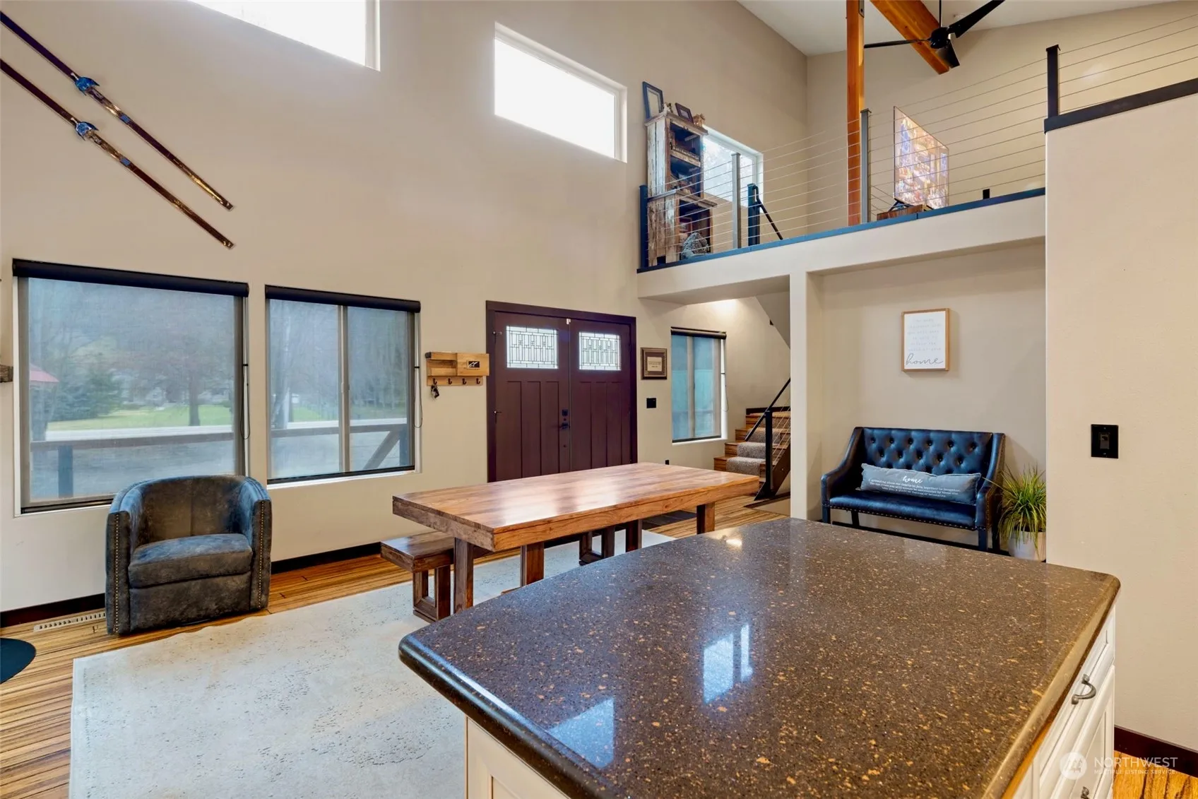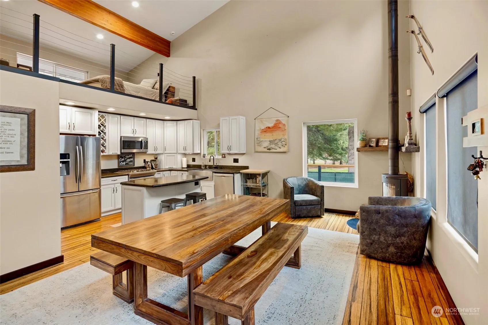 Experience contemporary luxury in this 3-level home on a half-acre off East Leavenworth Road with new trex decking. French doors greet you into an inviting main floor offering a custom kitchen, primary bedroom & bath & a living/dining room with wood stove. An additional 1/2 bath & laundry/mud room are on the main floor. The lower-level features radiant heat, a spacious family room, & and second primary suite. Rich tile, granite, wood, & metal accents adorn the home. An open loft & media space give versatility for office/exercise or guests. Outside, indulge in the large hot tub & Sauna. A large 3 bay garage includes an 800′ ADU. Minutes from town but a country feel on a half acre off East Leavenworth Road just across the road from the River.