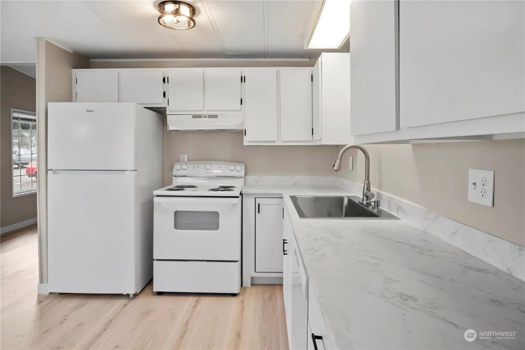 Bright and airy updated 3 bedroom and 1 bathroom home with 1,008 sq/ft! This 1981 home has been beautifully remodeled with brand new paint, light fixtures, flooring and carpet throughout. Kitchen has new appliances, countertop, sink and faucet. Bathroom has brand new toilet, vanity, medicine cabinet, mirror and fixtures. Park rent includes garbage service and 2 parking spots. 2 pets up to 35 lbs allowed.