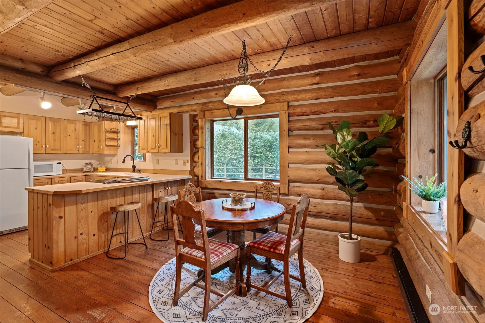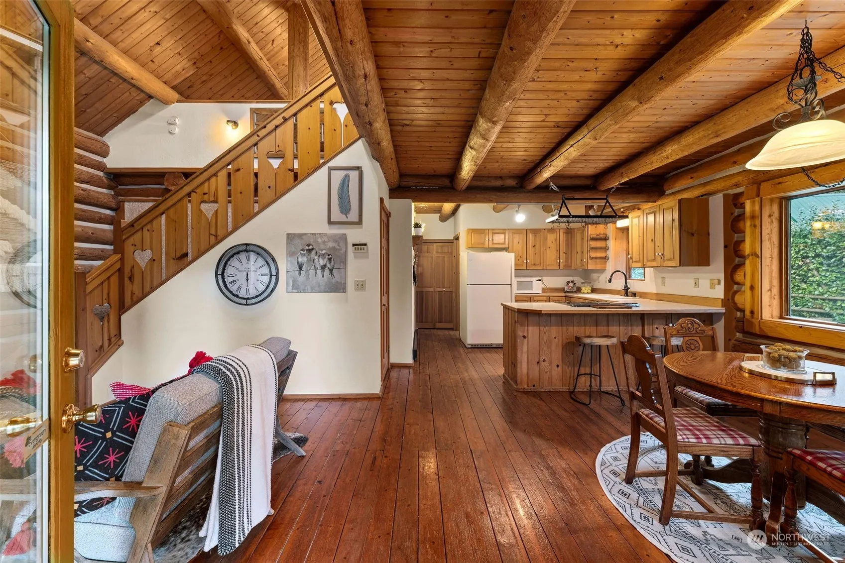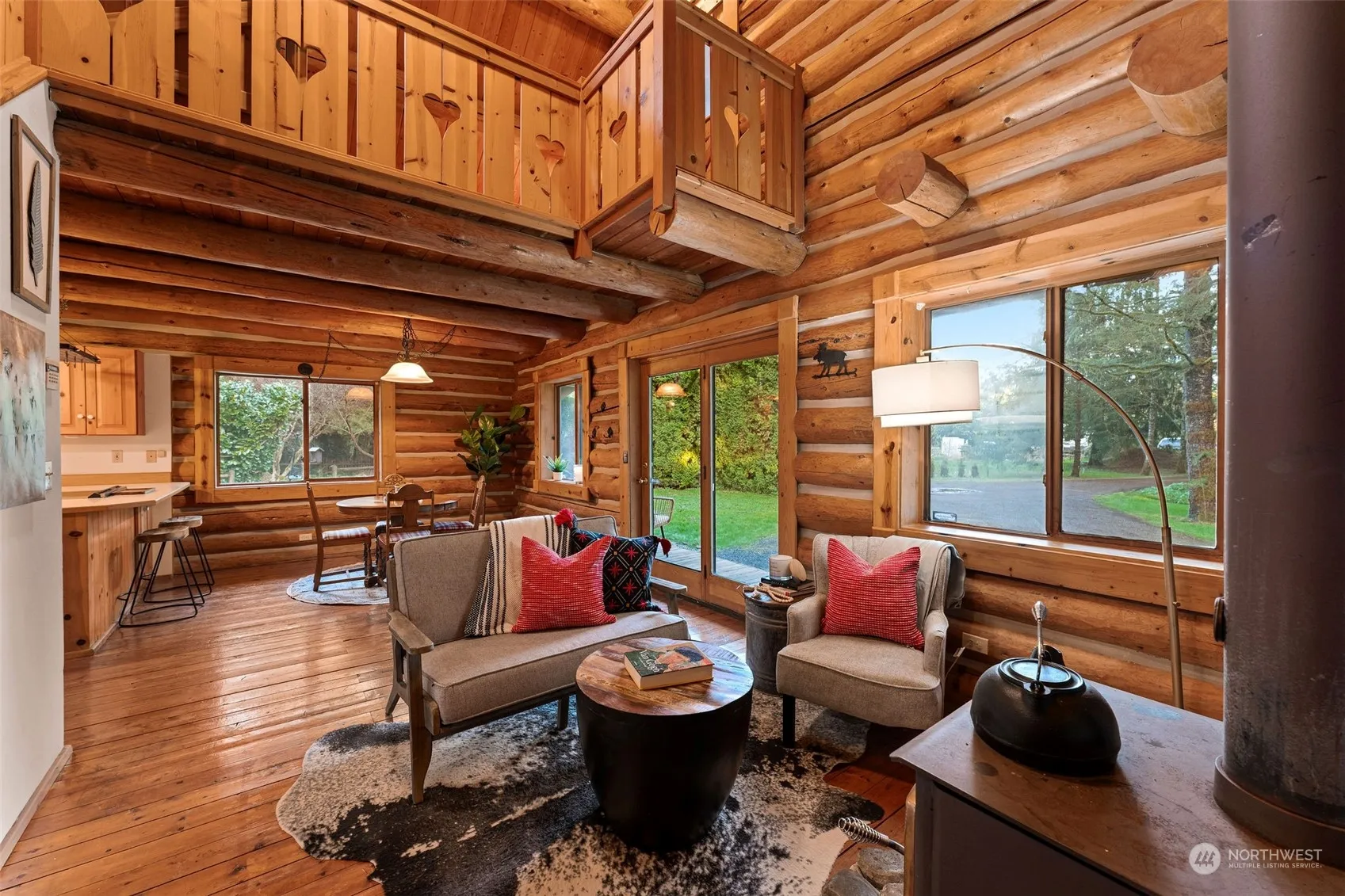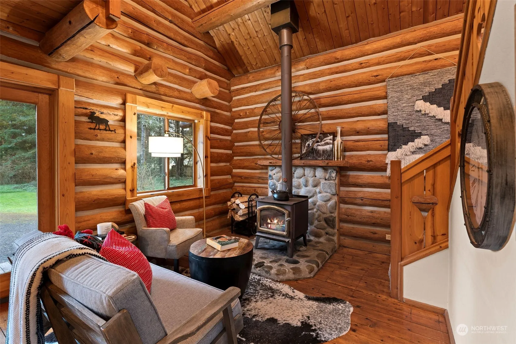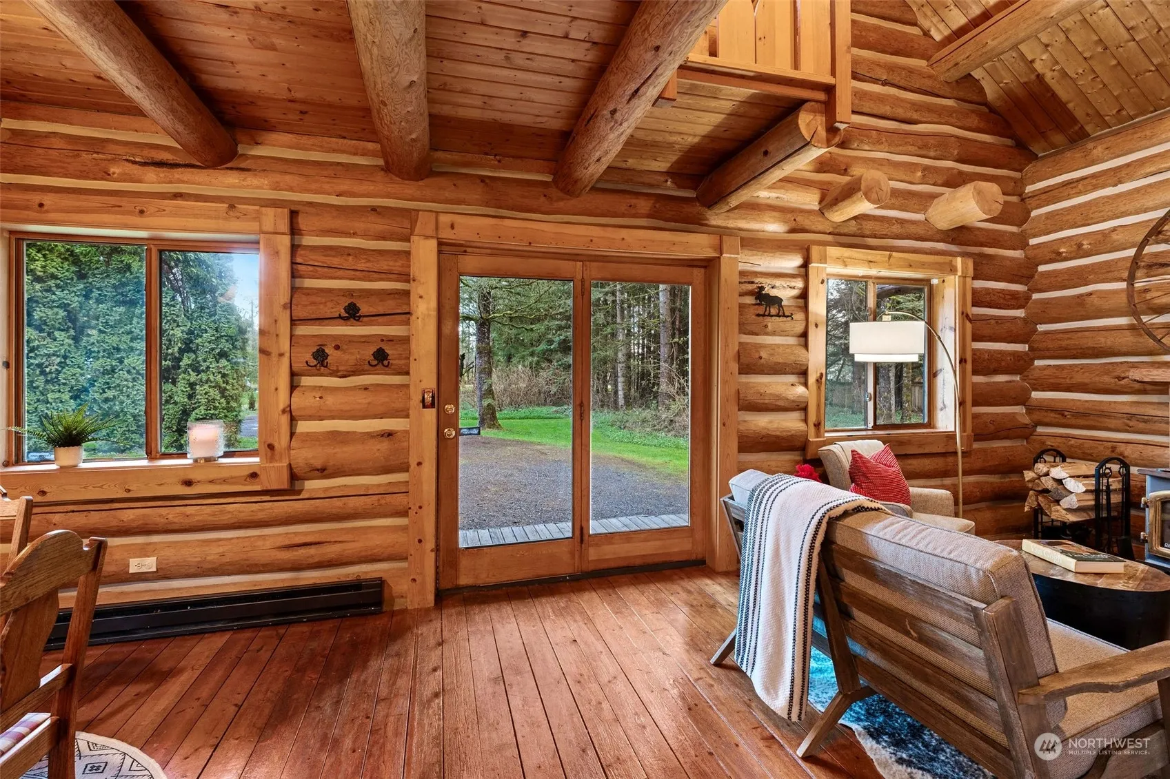 Discover your woodland retreat with this charming log home and guest cottage nestled on nearly 5 acres of lush forest. Explore winding trails that extend into adjoining acreage, offering access to 160 acres of DNR forest. The 1,320 sq ft Bavarian-style log home boasts a cozy wood-burning stove, Douglas fir floors, and a second-story veranda. Across the privacy hedge, the 788 sq ft guest cottage features a sleeping loft, antique wood stove, and kitchenette overlooking the flower garden. Entertain outdoors with a jetted hot tub, fire pits, and a bountiful berry patch and enjoy this tranquil oasis surrounded by a thriving forest ecosystem teeming with wildlife. Just over 1 mile to amenities. Total Bed and Bath include Log home and ADU.