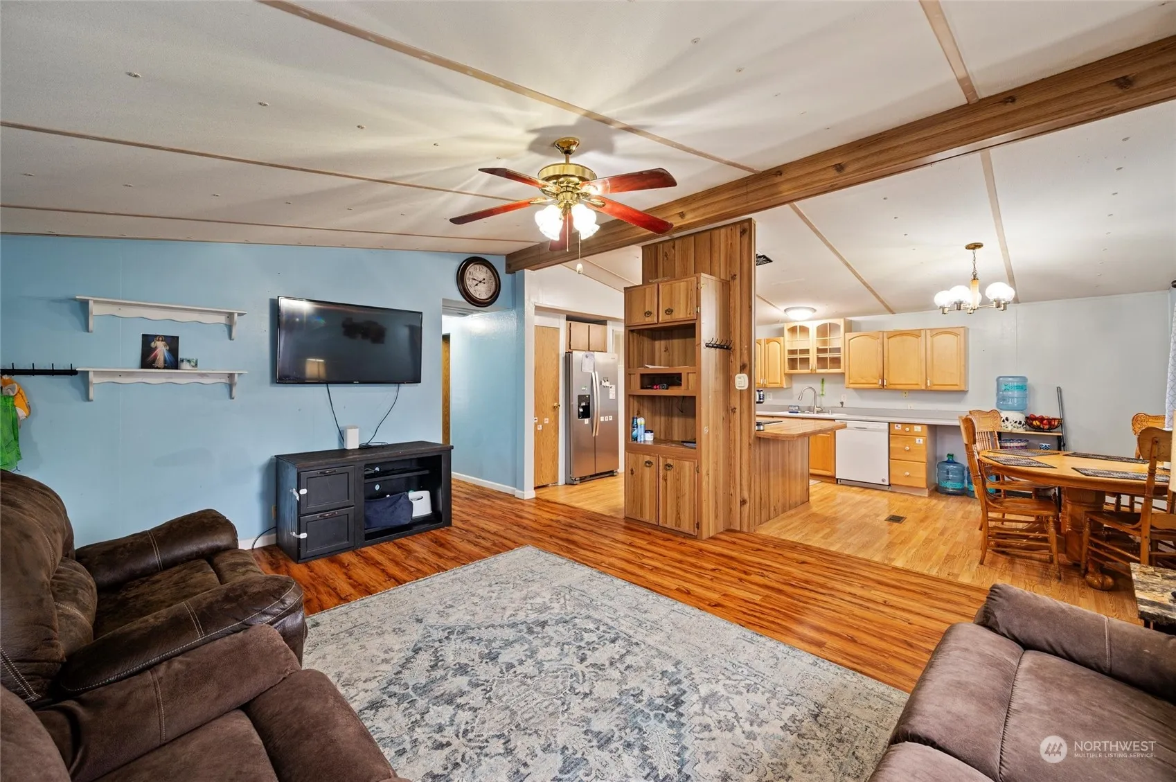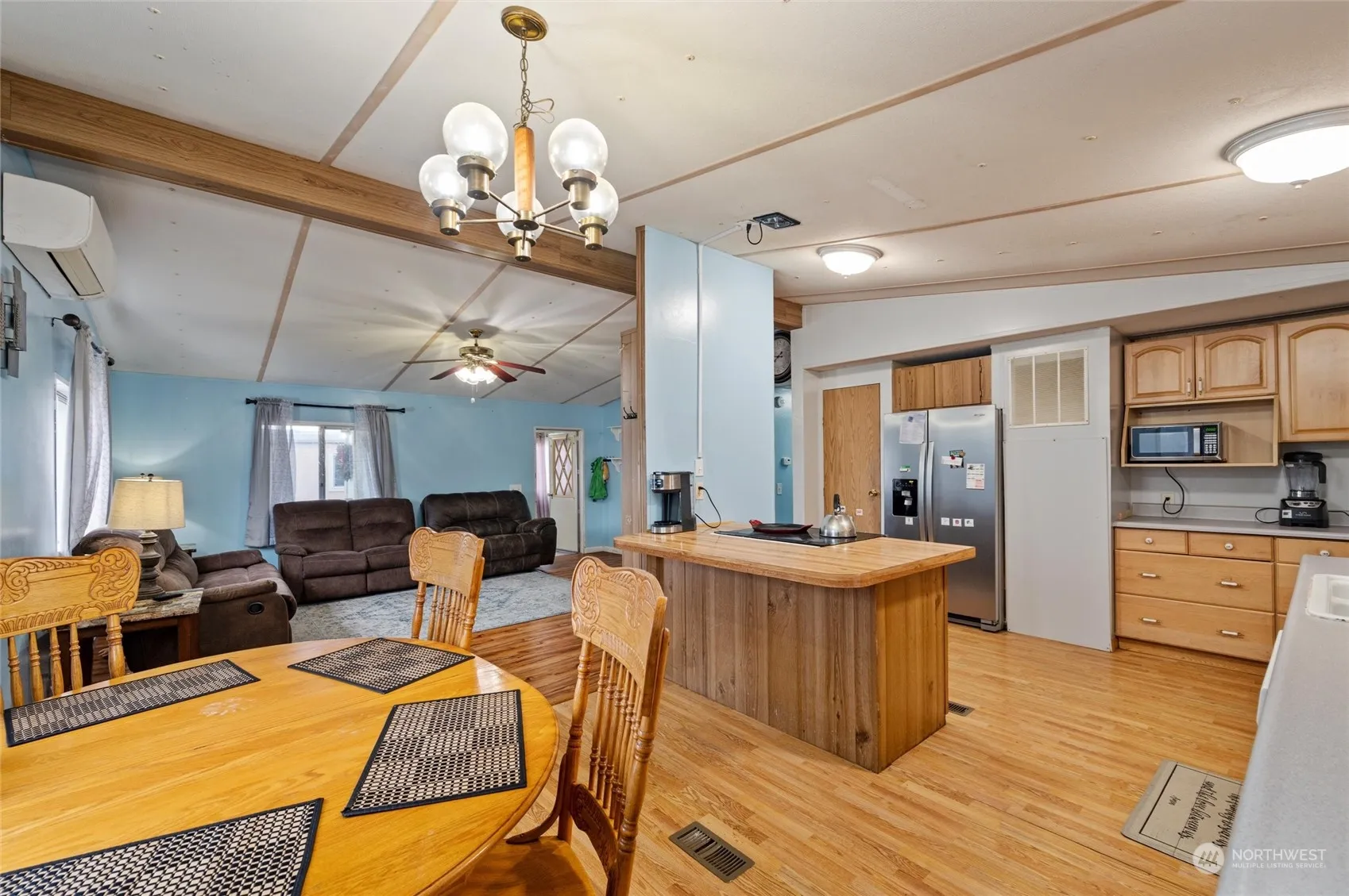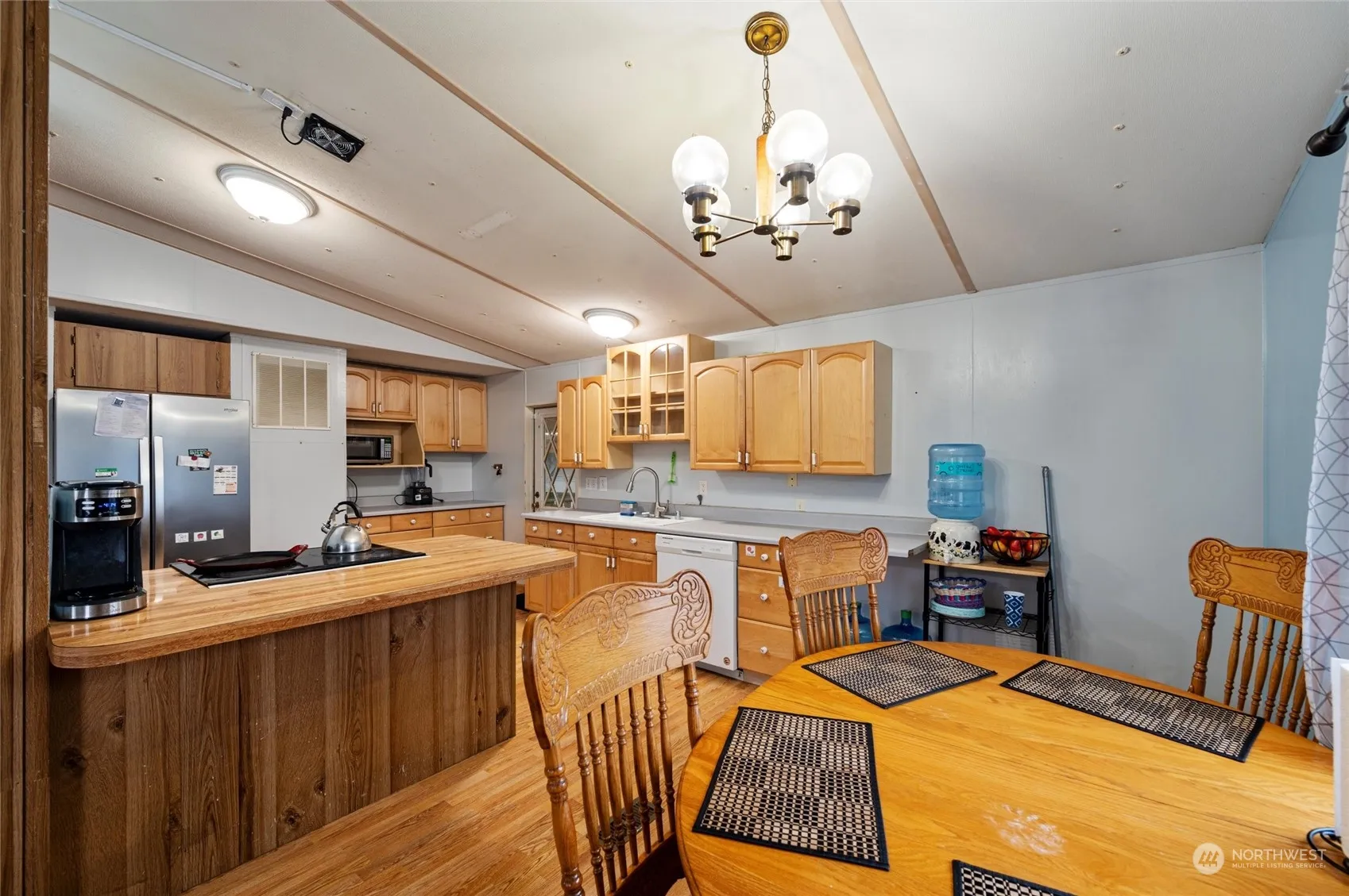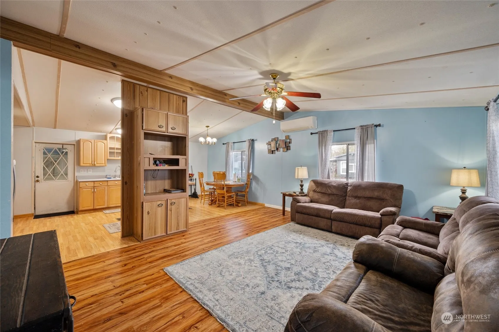 Affordable opportunity to own a doublewide with an attached garage. The garage is extra deep which provides extra storage or makes a great workspace. Fenced back yard and garden shed too! Built in ramp into home for easy access. Open concept living area with vaulted ceilings. 2 bedrooms and 1 1/2 baths plus an office space. electric mini split for heat and AC Quiet community close to parks, library, shopping and restaurants.