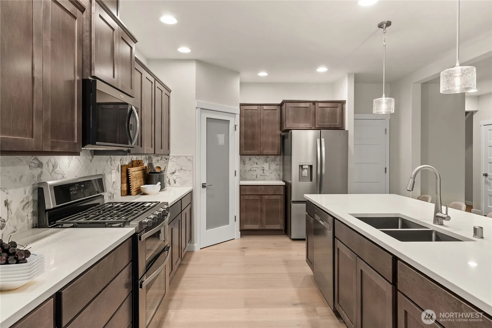 Celebrate the Season with Move-In Ready Comfort! Washer, dryer, refrigerator & blinds now included on all completed homes! The Birch offers 2,432 sq. ft. of comfortable two-story living. All bedrooms are located upstairs, including one that is oversized to serve as a bonus, guest suite, or office. The main level showcases an open kitchen w/quartz counters, walk-in pantry, Charcoal Maple cabinetry & gas range. Engineered hardwood enhances the entry, kitchen, and dining, while quartz surfaces and quality details are carried throughout. A covered patio, fully landscaped yard, and privacy fencing create a welcoming outdoor space. Sought-after Tumwater location near schools, major shopping, and quick freeway access. Some images virtually staged.