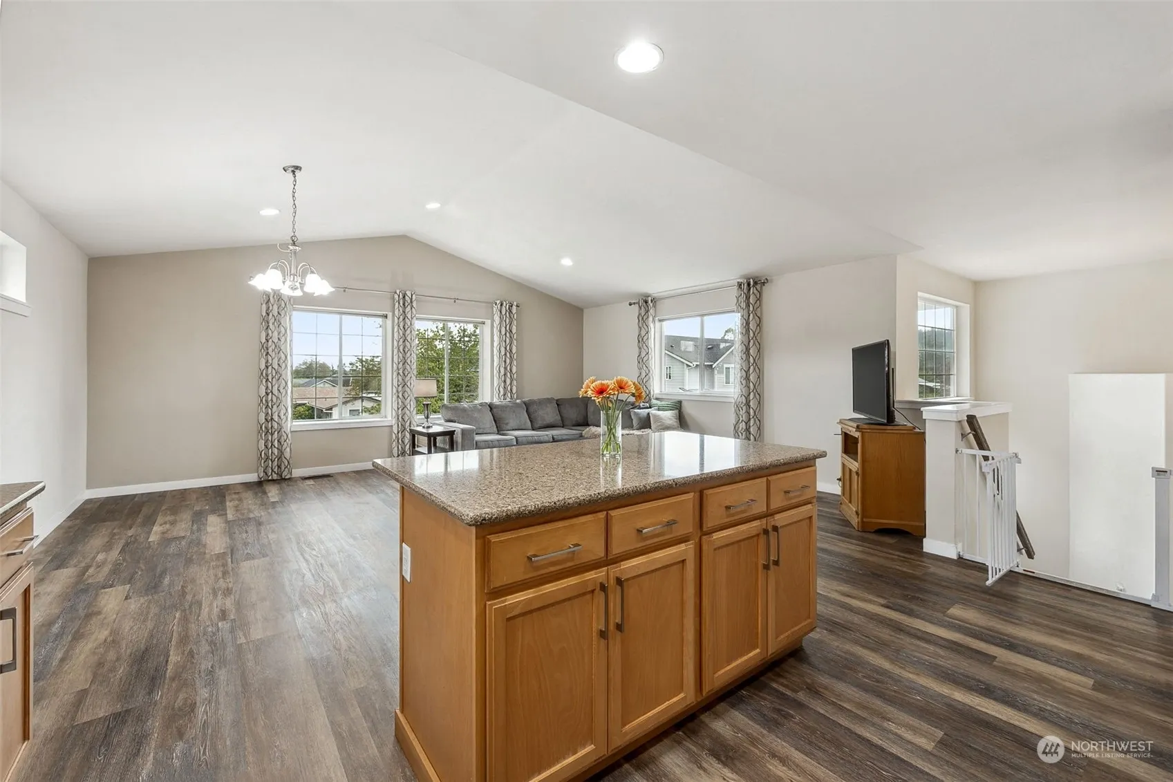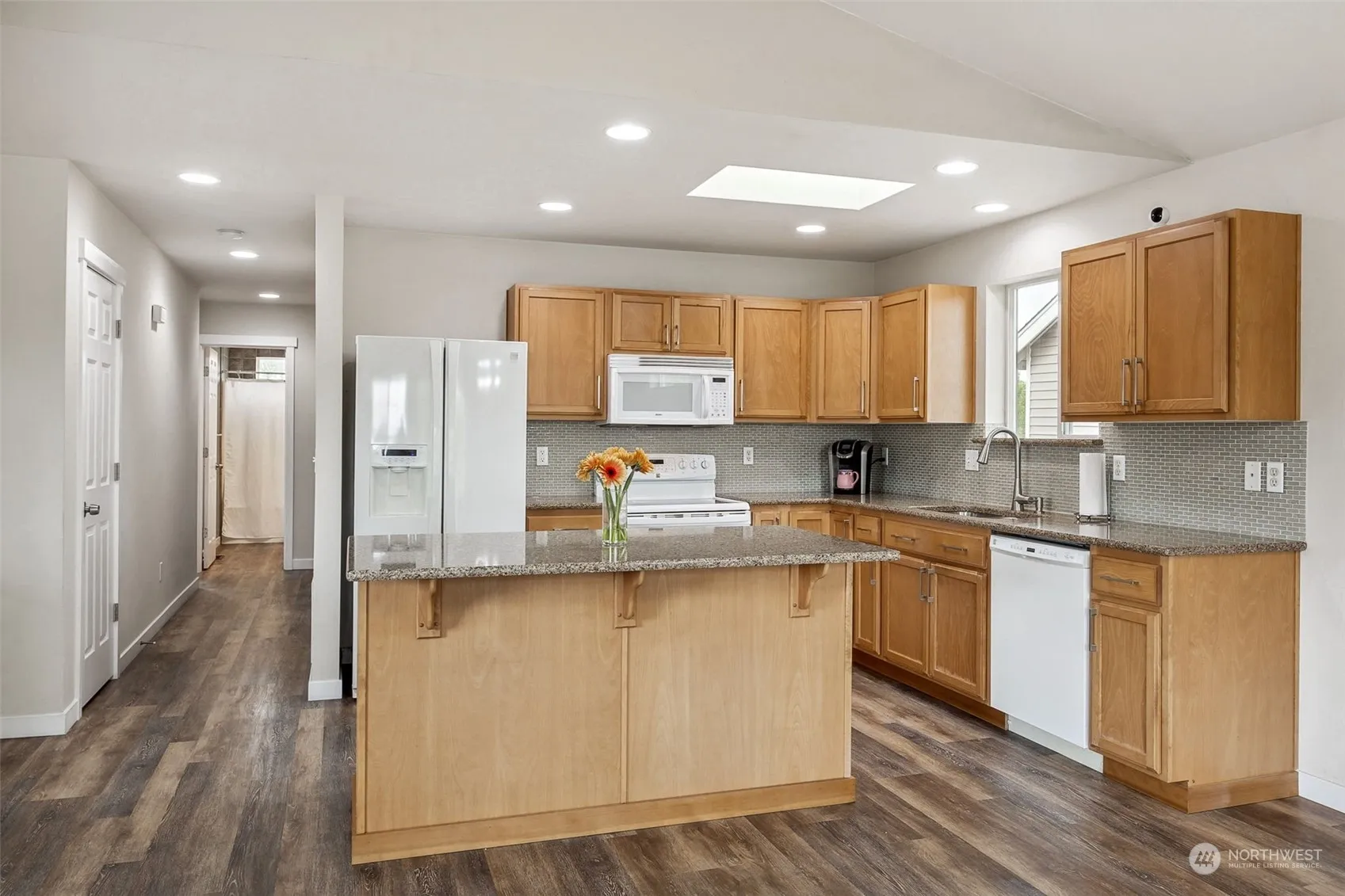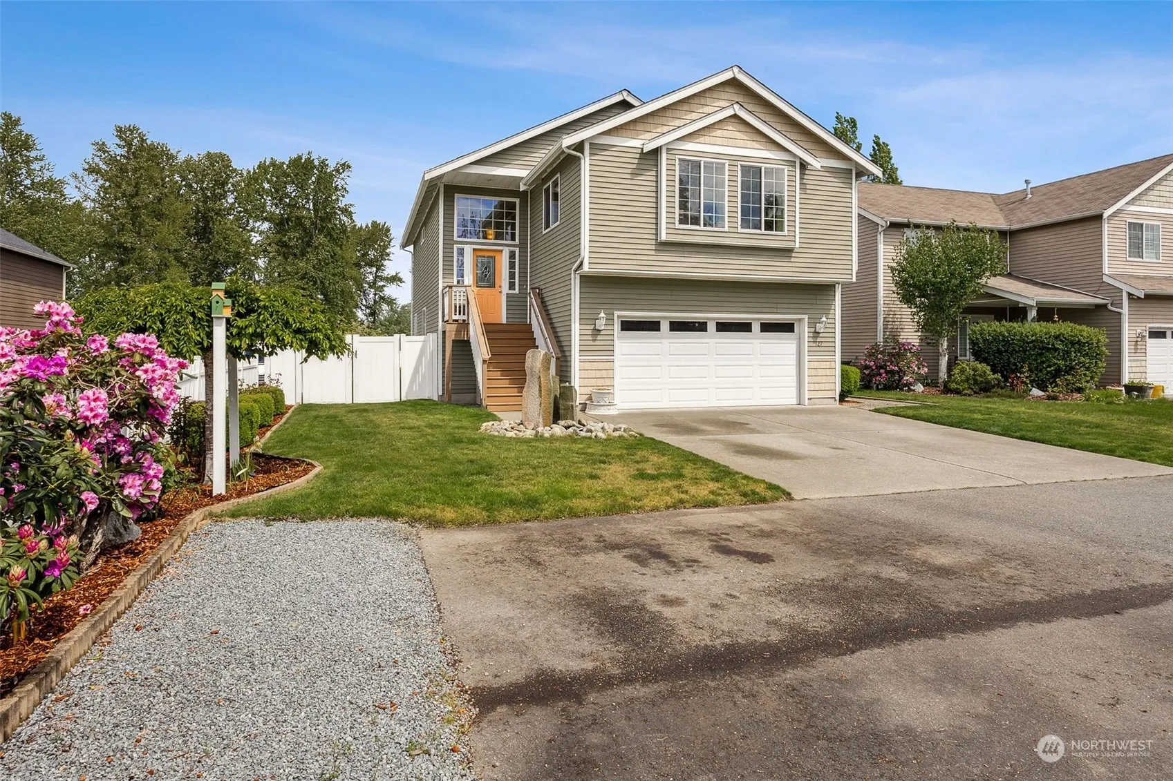Welcoming split-level home W/partial Mt Rainier views! This home has it all- New LVP floors, upgraded doors/millwork & NEW LED fixtures! Living room W/light & bright interior & vaulted ceilings! Kitchen boasts Quartz counters, full height glass tile backsplash, skylights, & appliances that STAY! Primary W/walk-in closet & 5-piece bath ft. soaker tub. 2 additional bedrooms & full bath up! Family room W/fireplace, 1-bedroom, 1 full bathroom & utility W/ W/D that STAY on lower. Front Trex decking. Private backyard oasis W/extended 16×30’ cedar deck, gazebo W/curtains, raised garden beds, & vinyl fencing backing to greenbelt! NO HOA/RV Parking! Easy access to HWY 167 & 18, centrally located near entertainment, restaurants & walking trails!