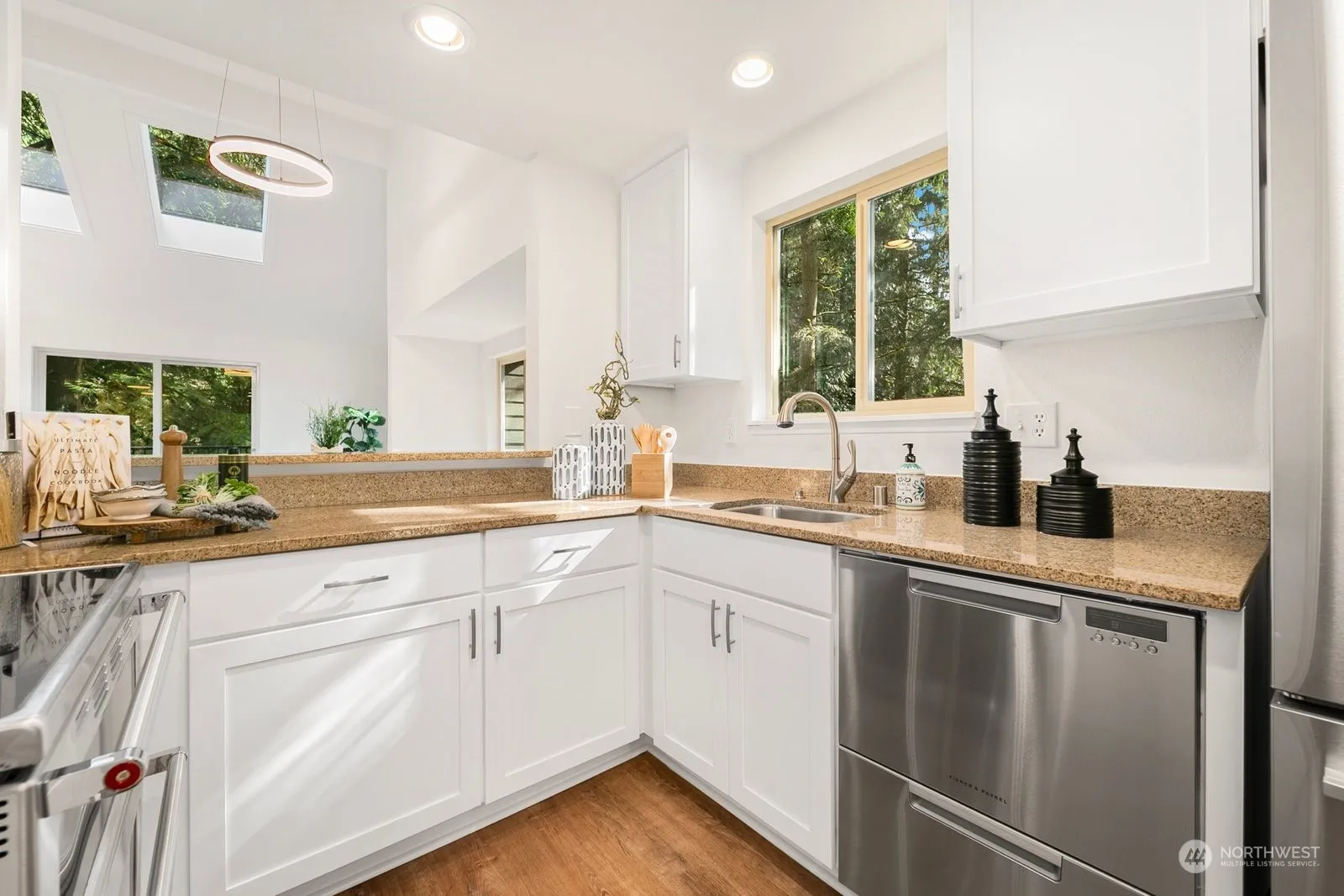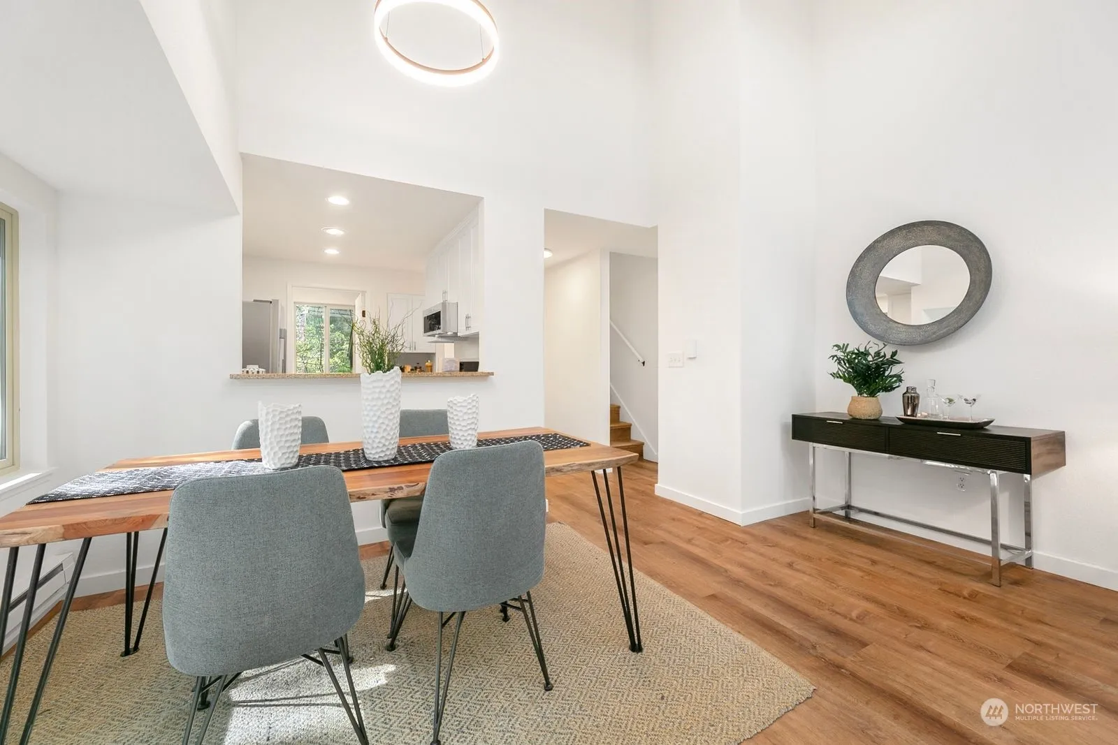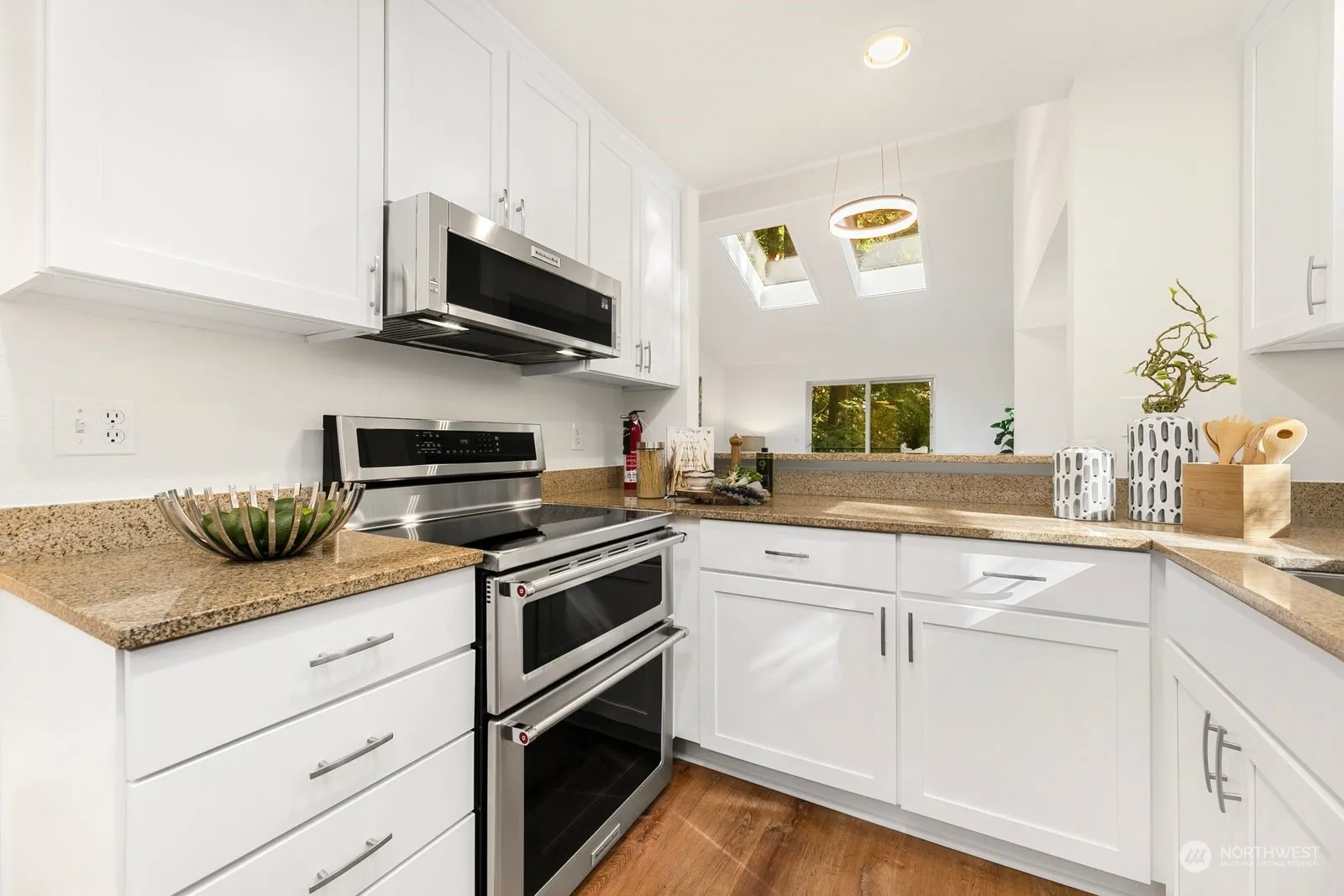 This newly refurbished 3 bedroom/1.75 bath, 1378 sq.ft. condominium town home has soaring, vaulted ceilings that enhance a bright, open floor plan offering fantastic personal & shared spaces. Plenty of windows, and 2 big skylights, let in a banquet of natural light. Life is easy with tons of storage & thoughtfully detailed surfaces, including fresh paint, slab granite kitchen counters and new flooring, feed the senses. New washer & dryer, new light fixtures and all newer appliances. This sophisticated, top floor unit enjoys luxurious privacy, a private deck and a peaceful treed outlook. Well-managed HOA w/good reserves & high owner occupancy, and just minutes to the Microsoft campus with light rail launching in Redmond on April 27th!