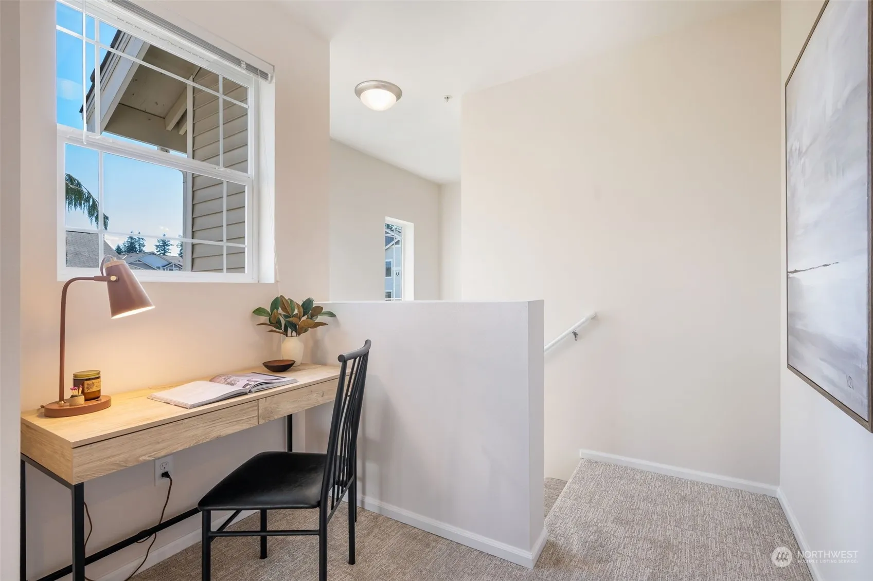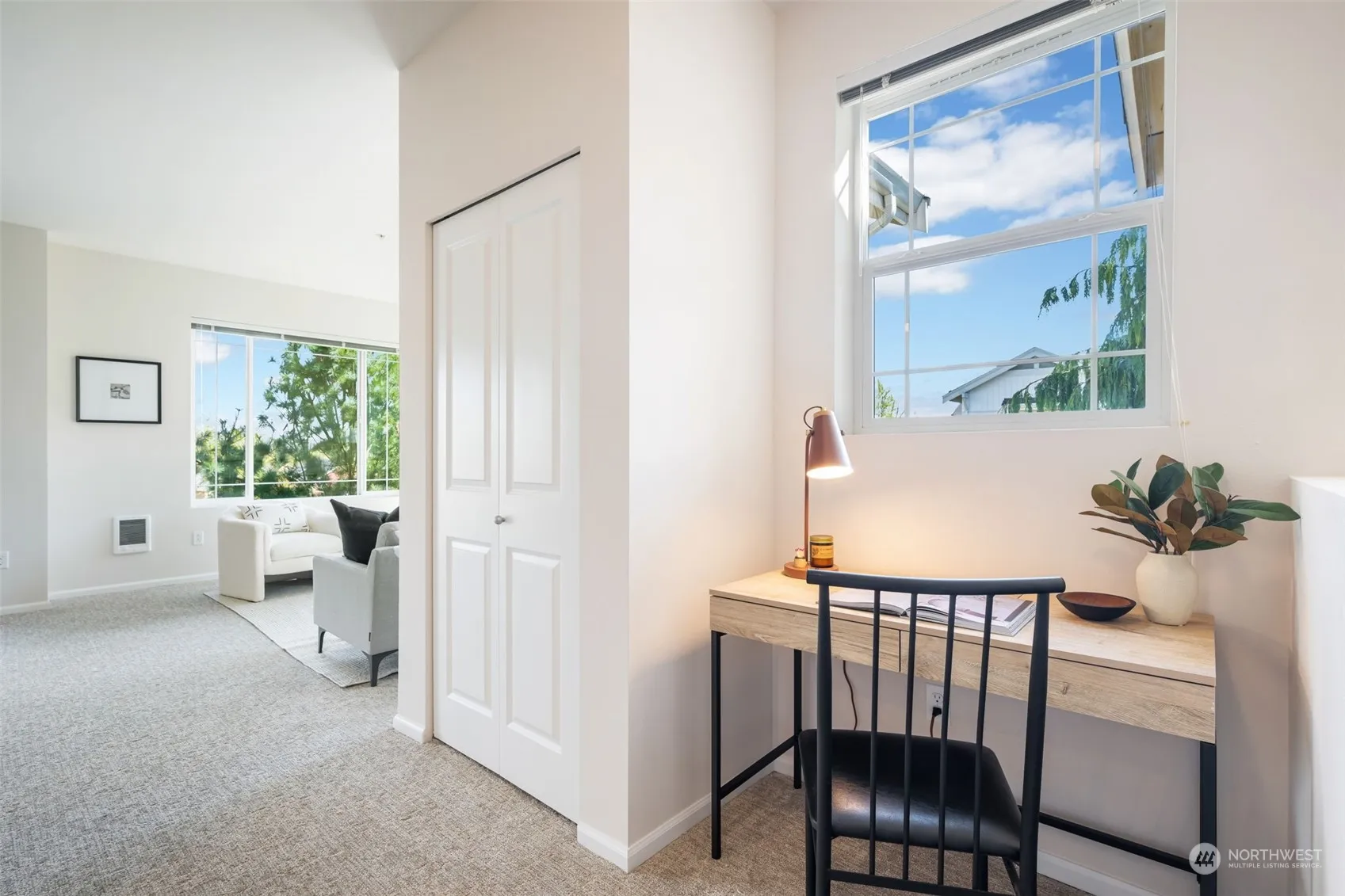 Experience the perfect blend of comfort & style in this top-floor corner unit at Dunhill Terrace. Sunlight streams through large east-facing windows, creating a bright, welcoming ambiance. The open layout seamlessly connects living & dining areas for modern living. Enjoy a well-appointed kitchen with stainless appliances & a private balcony for tranquility. Work efficiently from the dedicated office nook, then relax in the generous primary bedroom with an ensuite bath & walk-in closet. Spacious second bedroom & nearby full bath offer comfortable accommodations. Full-sized w/d included. Fresh paint, LVP floors & carpet enhance the home’s appeal. Attached one-car garage with storage space-easy access to shopping, dining, Boeing, I-5 & 405.