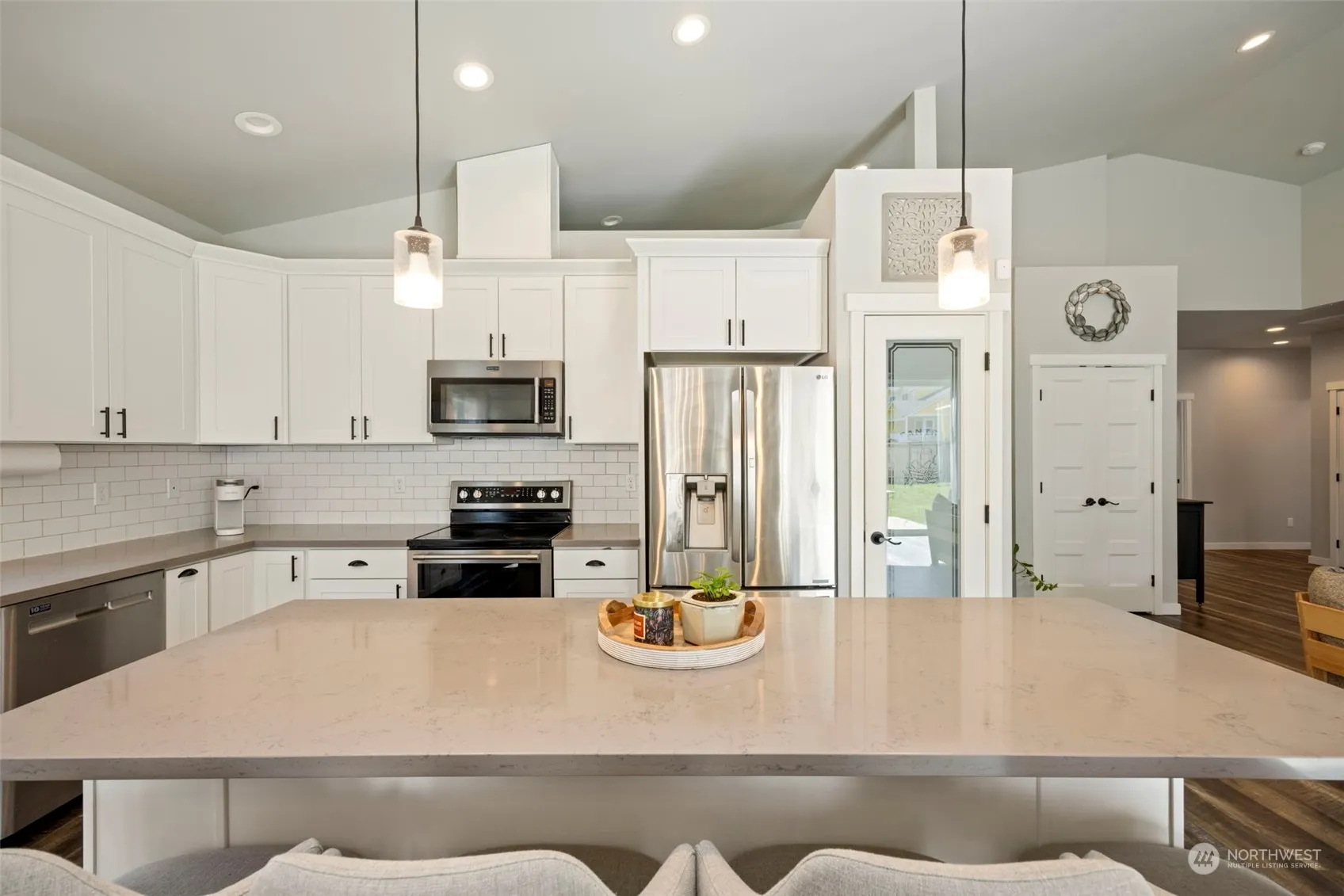 Newer 1-level home on corner lot w/ detached shop, mins to Warm Beach & walk to Lake Martha. Great rm concept w/ vaulted ceilings & extra wide doors/hallways. Tons of natural light. Custom upgrades & high end finishes. Expansive island kitchen w/ slab quartz, white cabinets & SS appliances + pantry. Inviting gas fp. Wood laminate flooring through main living areas. Primary suite w/ slider to back patio, ensuite 5-piece ba & walk-in closet. 2 additional bdrms, full bathroom & large laundry rm. Energy eff. heat pump & tankless H20. Attached 2 car garage + partially insulated detached 20×20 shop w/ power. Fully fenced yard + plenty of space for RV/boat parking. No HOA. Peaceful dead end street. 10 mins to Lakewood shopping or dwntwn Stanwood.