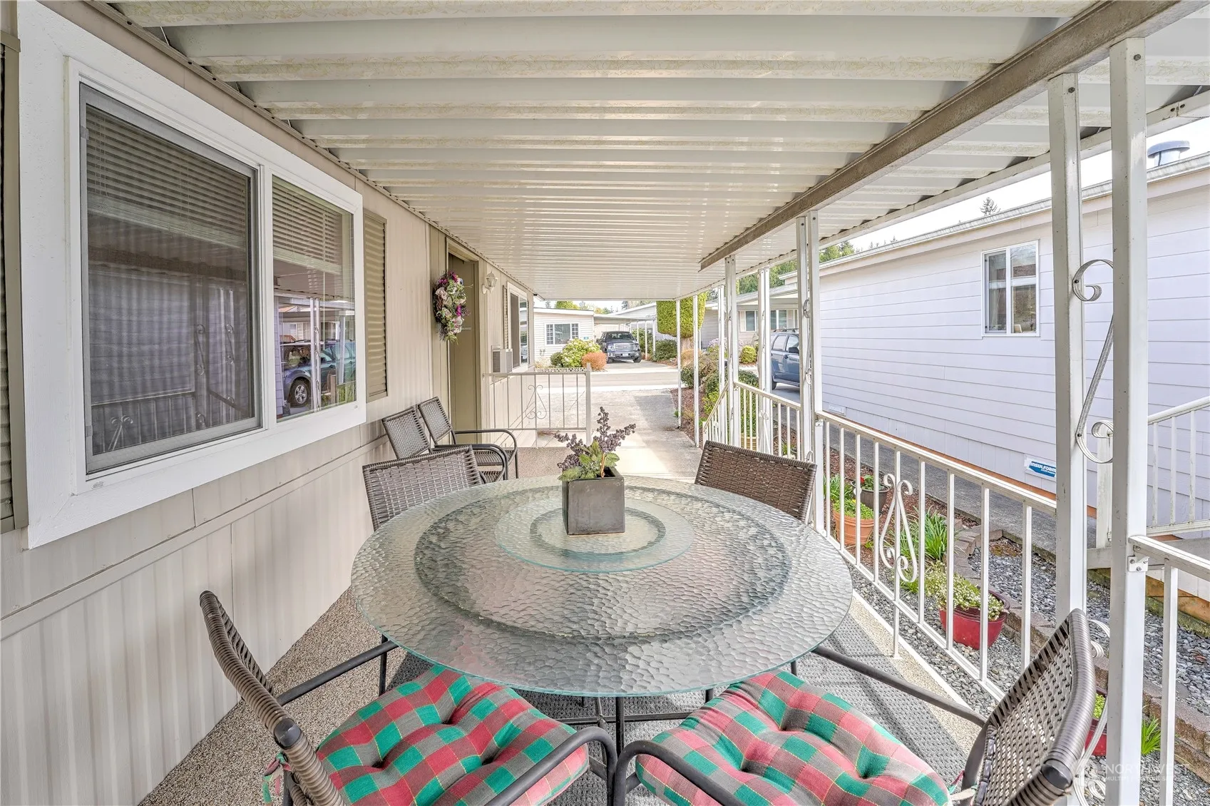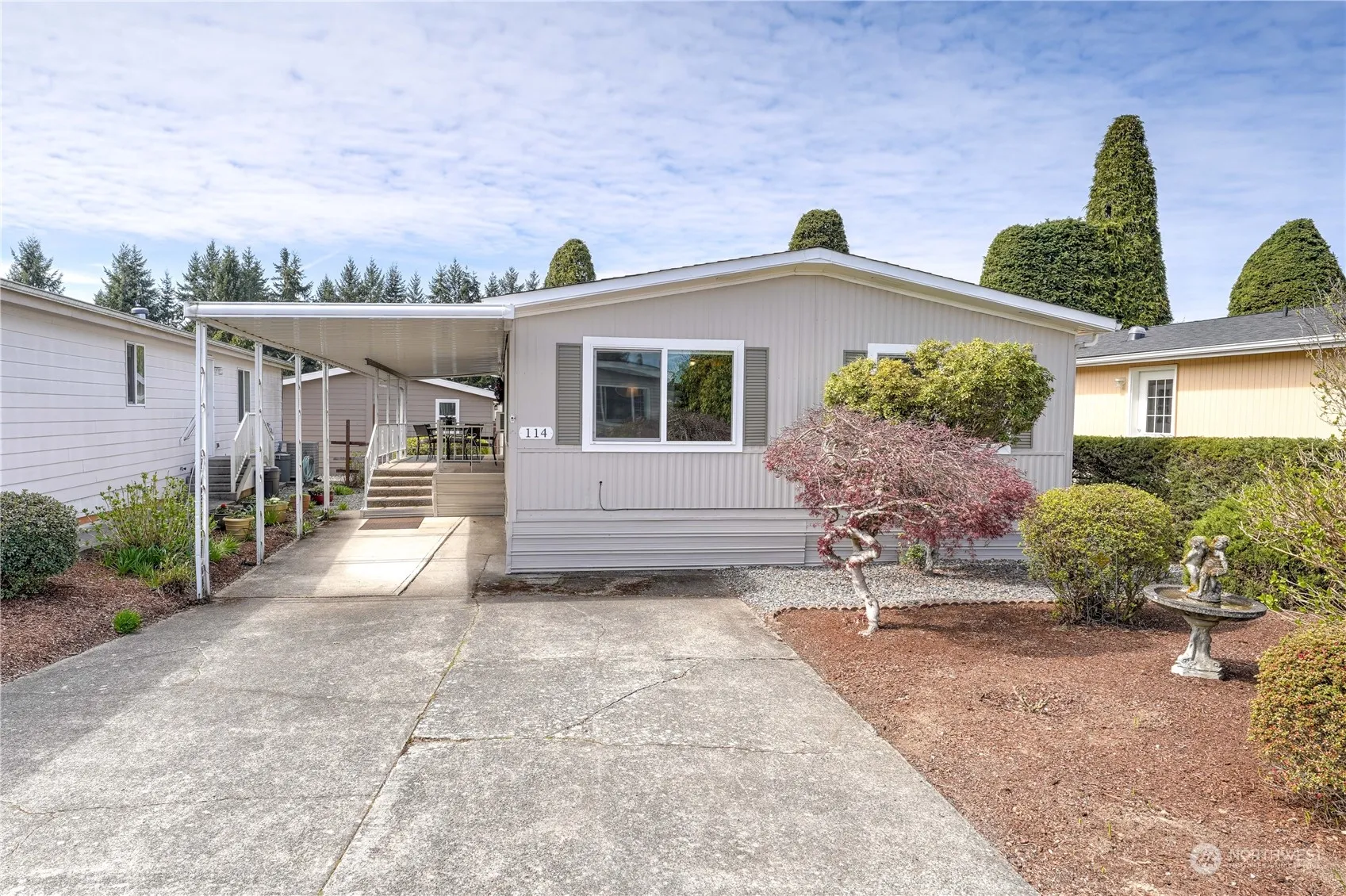 Welcome Home to the desirable 55+ community of Green Acres Park! Very well maintained, 2 bedroom, 2 bathroom, 1048 SQ FT Home. Charming low-maintenance residence ideal for discerning buyers. Lovely landscaped garden with manicured trees/flowers. Freshly painted interior/exterior, newer insulated windows. Bright living room, built-in dining hutch, inviting kitchen. Utility room with new washer/dryer. Spacious main bath, primary suite with private shower. Generously sized 2nd bedroom. Perfect for comfortable yet effortless living. Move-in ready! Nice size shed in the backyard for extra storage. Walking trails throughout park, community clubhouse and tons of additional guest parking! You will love this home and community.