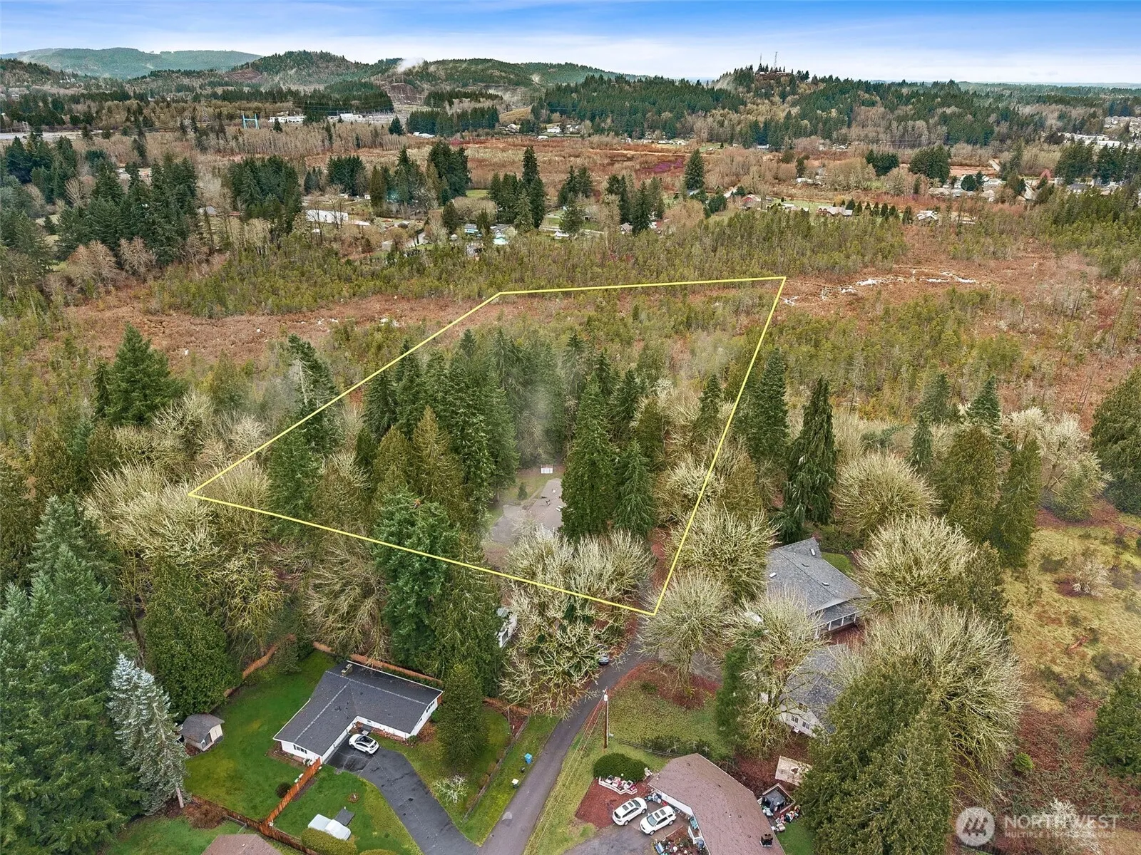 A rare opportunity to own in-town acreage in Tumwater. This tri-level home sits on 5.7+ acres on the end of a quiet drive. Nature lovers will appreciate the fruit trees, wild blueberries, trails & serene wooded setting. The home features a large living room with abundant natural light, gas fireplace & skylights that brighten the space. The kitchen is inviting to the dining room with French doors to patio. Enjoy your morning coffee, summer barbecues, or evenings under the stars. Upstairs, the primary bedroom with its own ensuite, two additional bedrooms & 3/4 bath. The lower-level offers a spacious family room centered around a wood fireplace insert, creating a cozy environment for movie nights, gatherings or relaxing. With its own private entrance, 3/4 bath & 2nd kitchen, the space could function well for MIL unit, guest quarters, or potential rental opportunity. Features include a shed with power, tankless water heater, salt water hot tub, EV charger, wired for generator & RV parking. All without HOA restrictions. Minutes to shopping, freeway access & Tumwater schools, close to Costco & Starbucks.