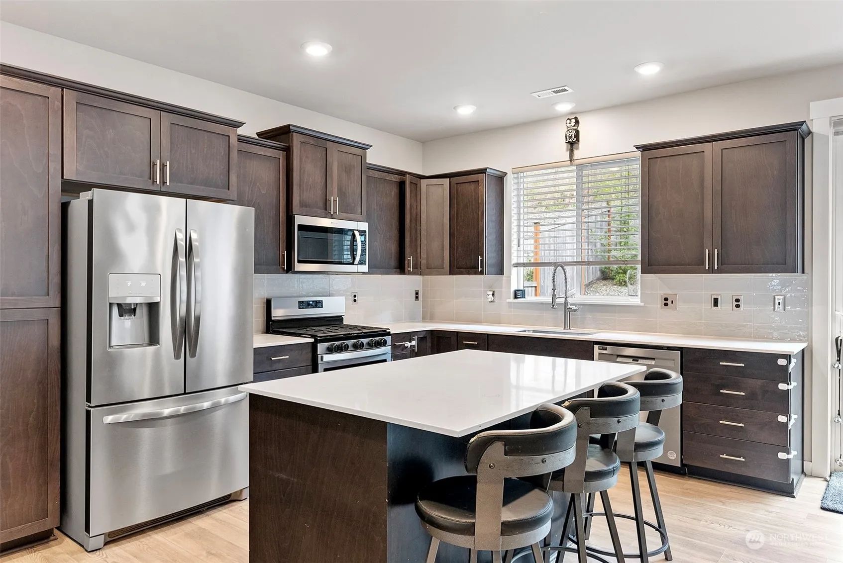 Welcome home! This well-cared for 2400 sqft, 5-bedroom home is ready for new owners! The large formal dining space is perfect for entertaining guests and the huge open concept great room is made for those special game day events. The kitchen offers quartz counters, stainless steel appliances, & tons of cabinet space. The main floor has beautiful laminate flooring throughout. Upstairs, you’ll find a spacious primary bedroom, walk-in closet, and adjacent ensuite bathroom. With 4 added bedrooms and an additional full bath, there is room for everyone. New AC system installed. The fully fenced, private backyard provides easy maintenance with terraced garden beds. A commuter’s dream-just off 272nd with the light rail coming soon!