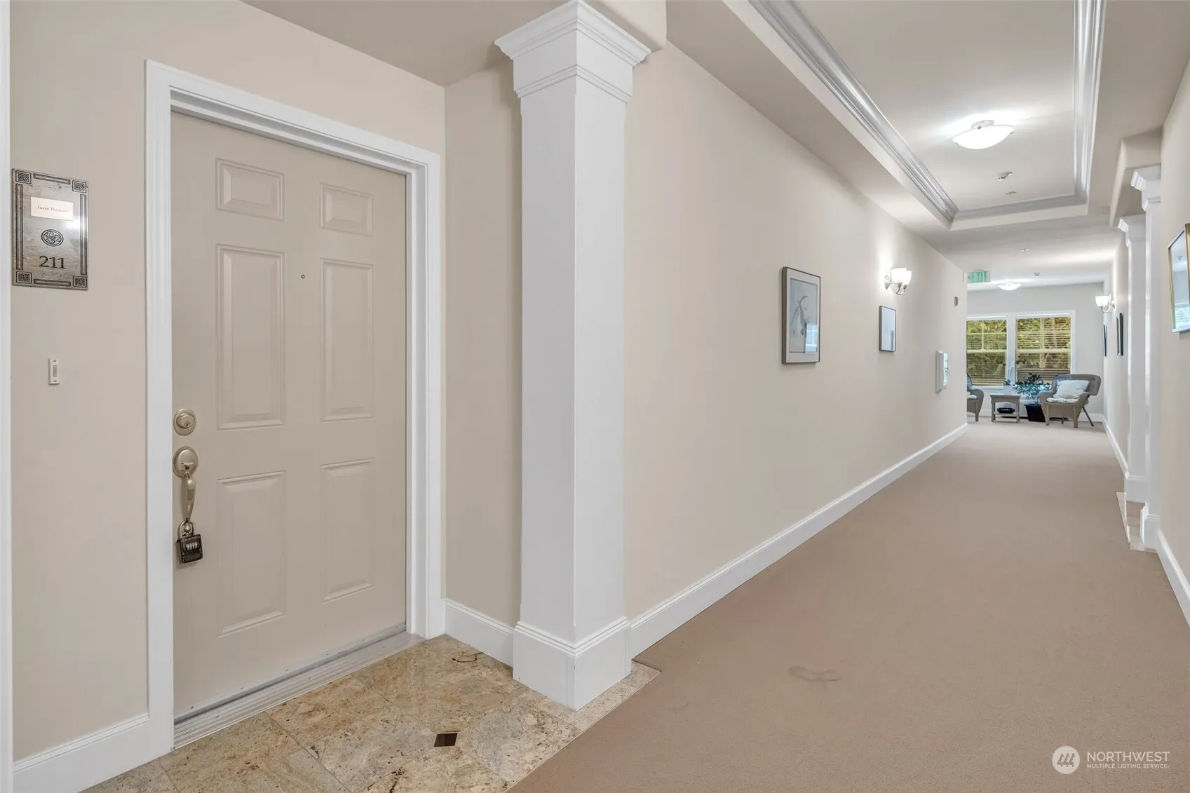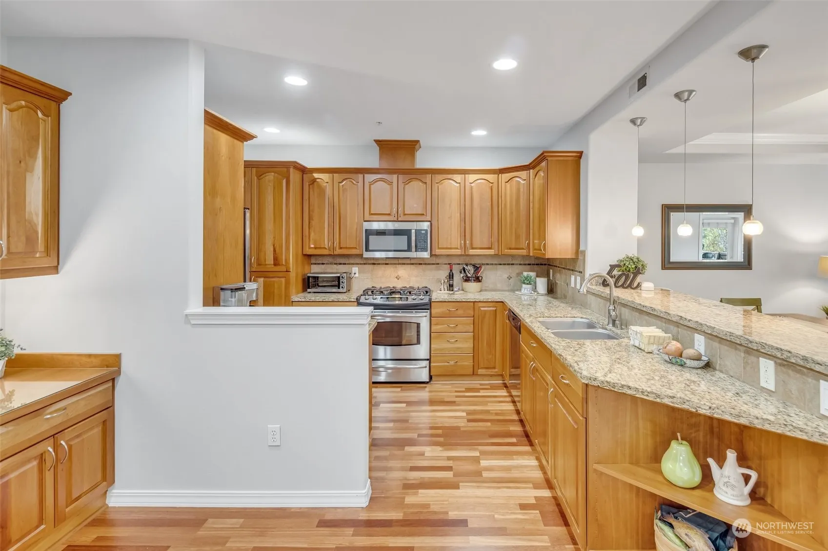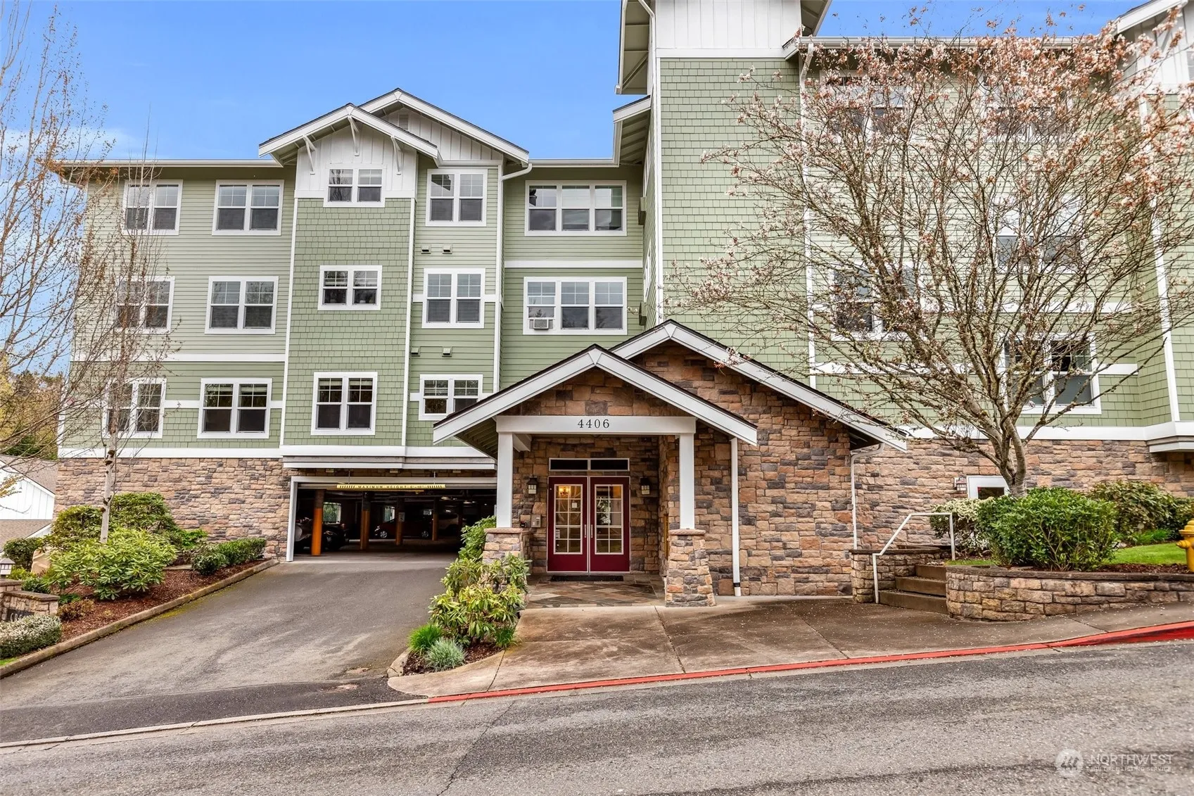 Incredible 2 BD/2 BA/media room/2 car parking/Central AC! Beautiful open kitchen w/stone counters, SS appl & large built-in office+nook space. Open design dining & living w/coffered ceiling, built-in hutch, elegant gas fireplace & beautiful green views. Private deck off LR & large media room w/French doors. Spacious primary suite w/huge WIC, 3/4 bath & double vanity. Guest bedroom boasts WIC. Full bath located across the hall. Full size laundry w/utility sink & storage. Close to garage elevator; extra storage room located on same floor. Live independently in a vibrant community of amenities & social activities incl: indoor pool, clubhouse, classes, tennis, pickle ball, putting green, pea patch, trails, social/cultural & sporting events.