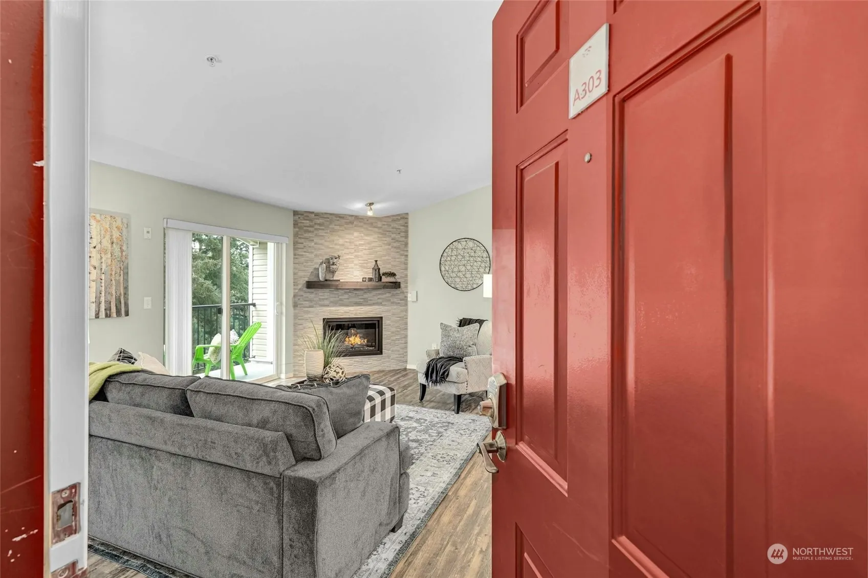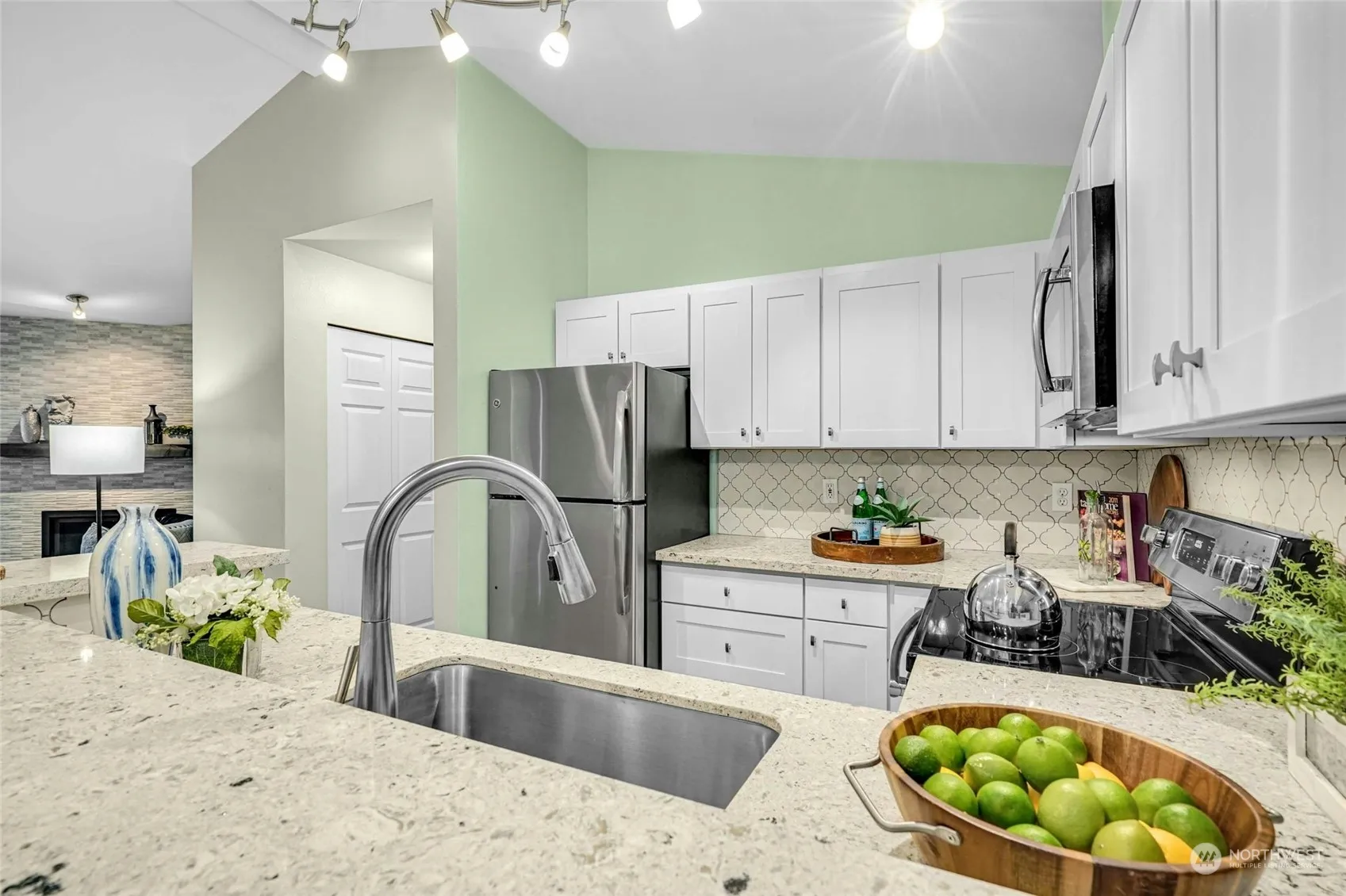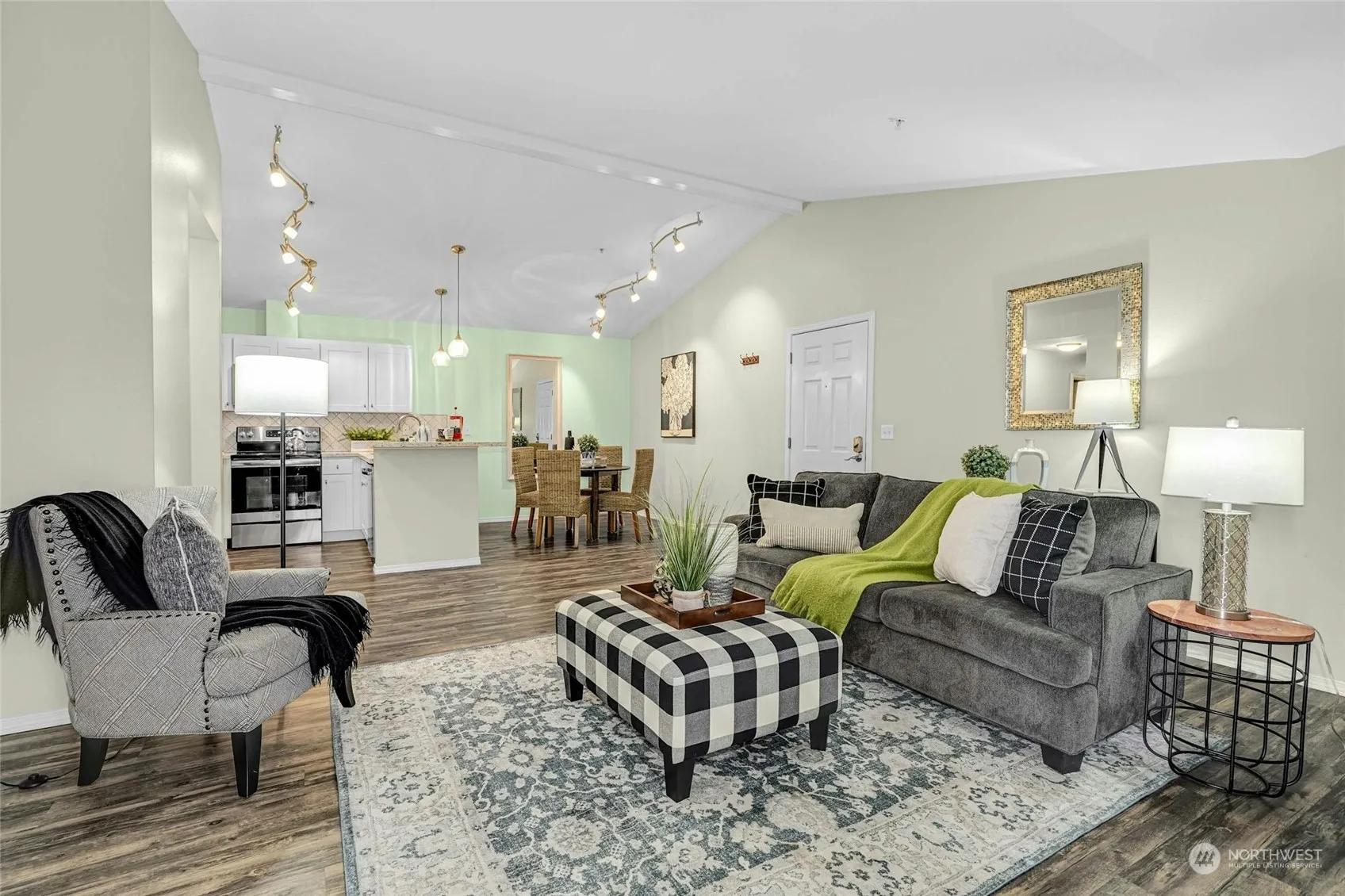 Downtown Bothell right out your front door. Stroll Main Street for great cafes, pubs and retail therapy, bike the Sammamish River Trail, or take a class at UW Bothell Campus. It’s a picture-perfect location w/southern exposure from this penthouse level, fully refurbished & stylish condo. Vaulted ceilings, bright interiors, laminate hardwood flooring throughout, tile clad gas fireplace in the great room, custom white cabinetry w/stainless steel appliances & slab countertops in the spacious kitchen. Two full baths w/crisp, fresh finishes. In unit full washer and dryer. Outdoor deck with territorial and city views. Extra storage, private garage as well as uncovered parking for two, no rental cap and don’t forget pets are welcome here too!