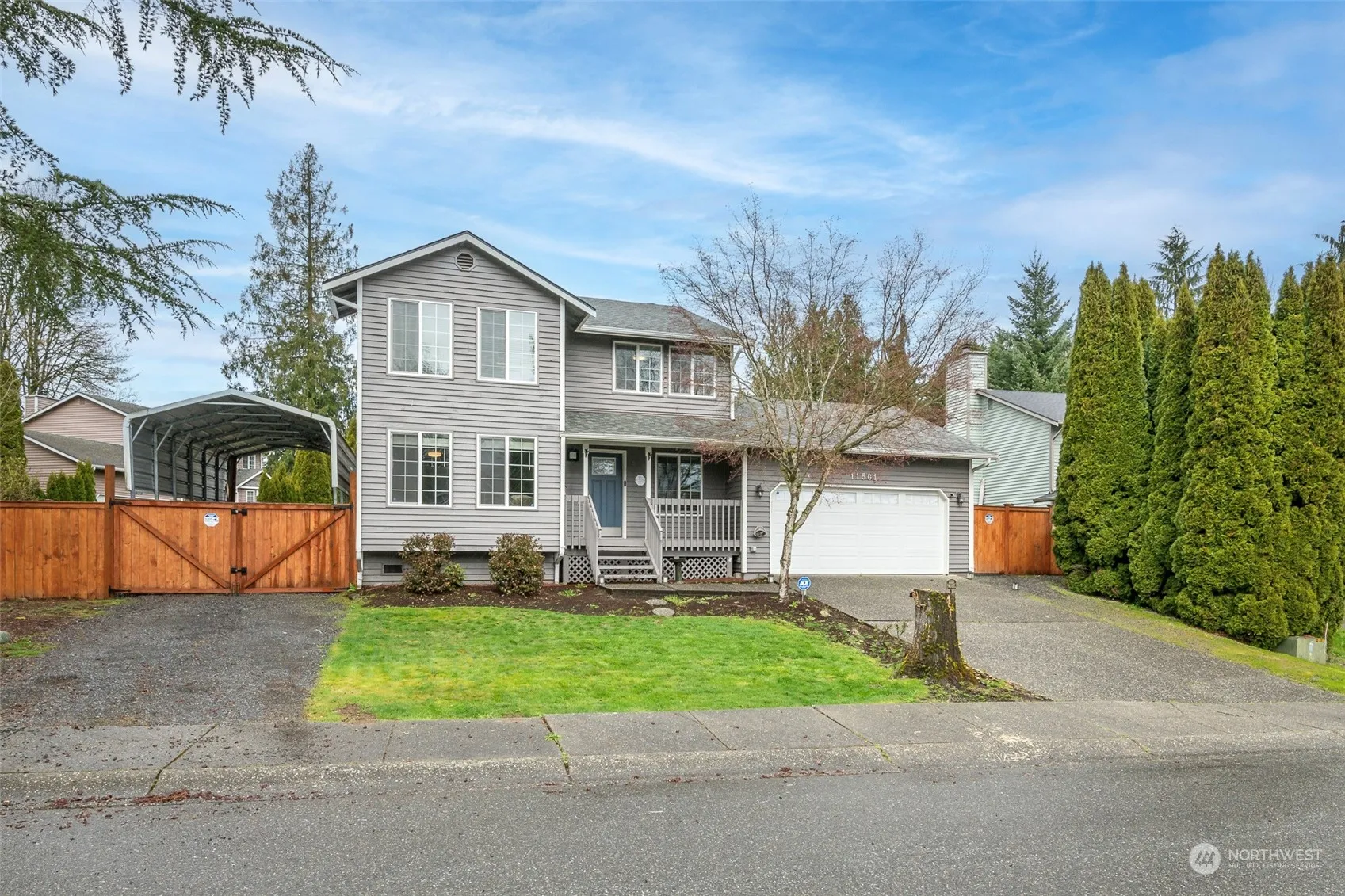 Beautiful 5 Bedroom, 2.5 bathroom Lake Stevens home with tons of natural light from every room! Downstairs features a formal living & dining room that flow right into the gorgeous Chef’s kitchen with large island, Quarts Countertops & Stainless Steel appliances – opens to your family room with a fireplace (TV & sliding mount convey with the home), & Office/Bedroom on the main! Upstairs features 3 large secondary bedrooms, and a very spacious primary suite with mountain views on a clear day & primary bathroom attached. BRAND NEW DECK (half covered for those rainy days), 2-3 Car carport, large 1/4 acre lot, fully fenced backyard, patio & A/C! Gate installed on back fence line to enjoy the walking trails! You won’t want to miss this one!