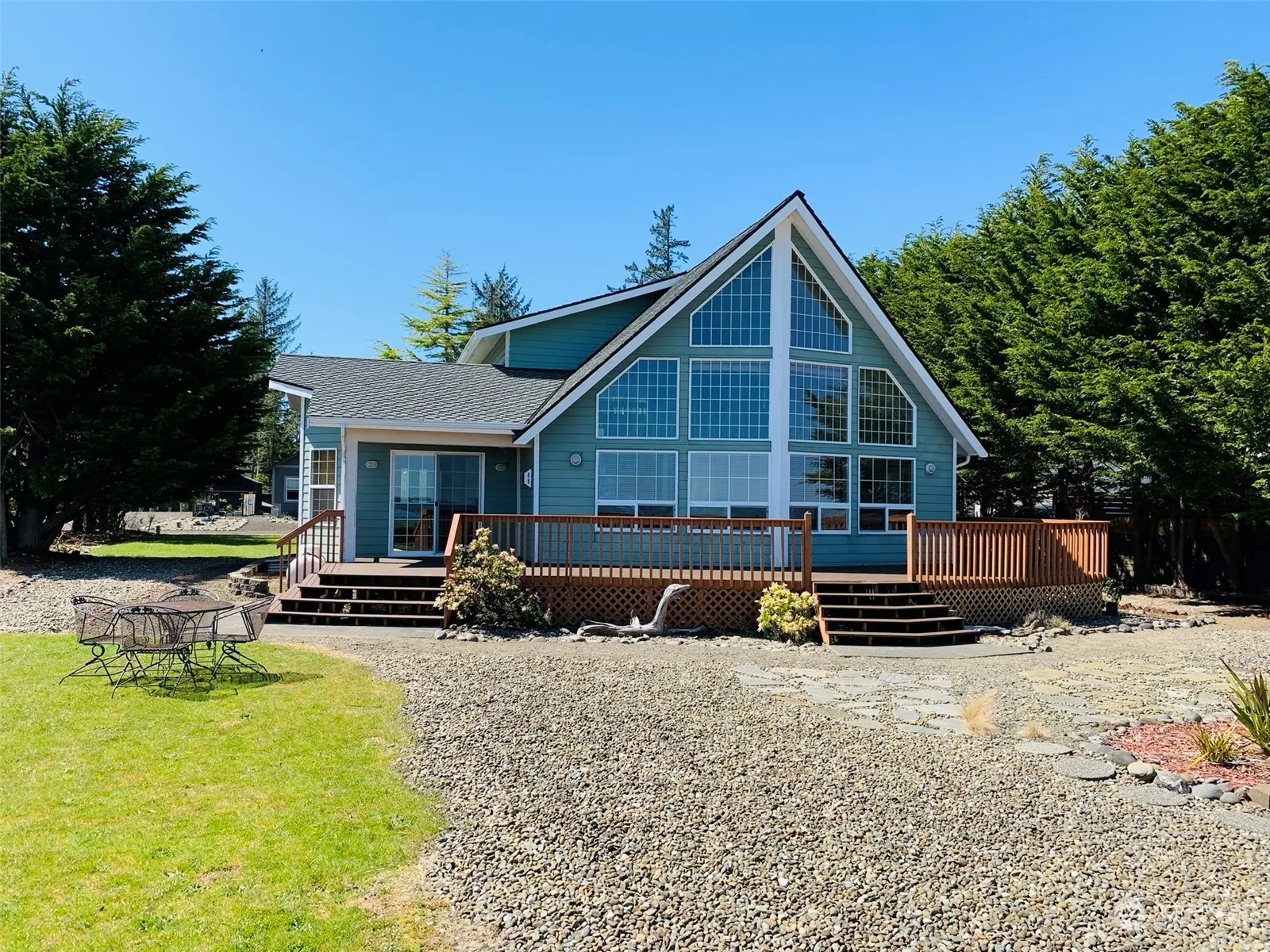 Amazing Bay Front Views! Watch beautiful sunrises and the abundant wildlife from the privacy of your very own Bay Front home! This charming Chalet style home sits on 1 1/2 lots and is beach living at its best! The 1,808 sq ft main house features: Wall of windows overlooking Grays Harbor Bay and Mt. Rainier ~ 1-bedroom 3/4 bath, Kitchen ~ Dining Room ~ Living Room ~ Laundry area ~ beautiful extra bonus room/sunroom or office ~ and propane fireplace on the main floor ~ Upstairs Loft consists of Primary suite w/full bathroom and outstanding Bay views! Large wrap around deck for entertaining ~ 2-car detached garage with an adorable 288 sq ft 1Bdrm, 3/4 Bth apartment located above, perfect for guests.