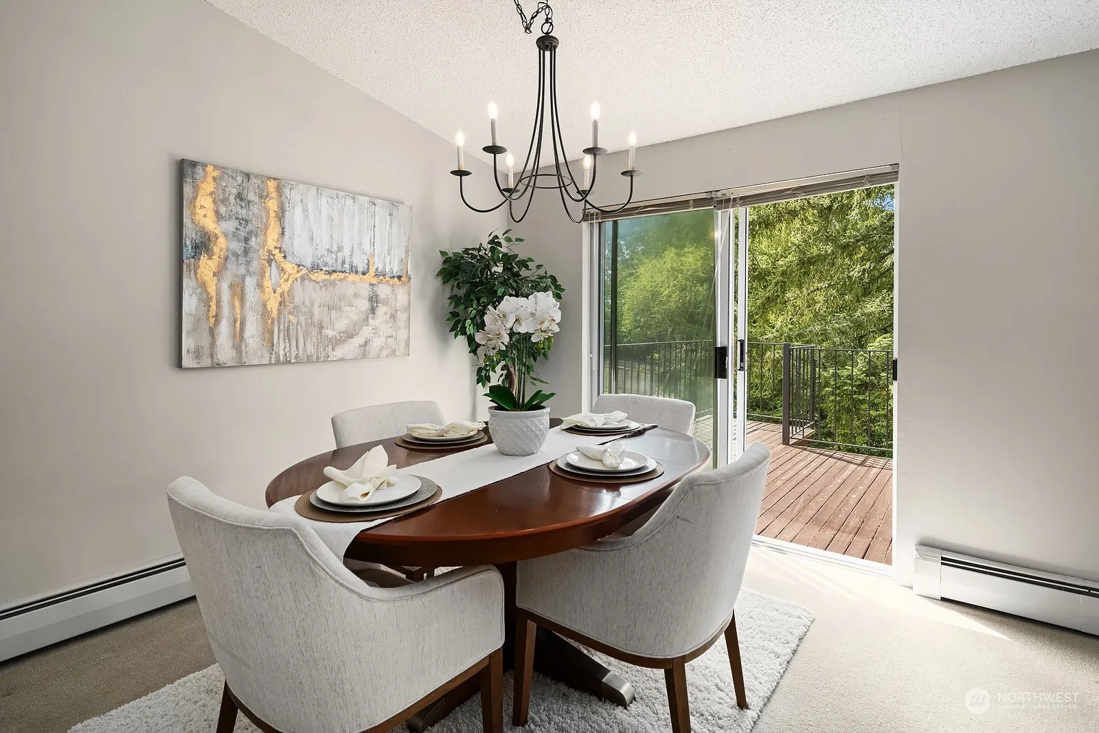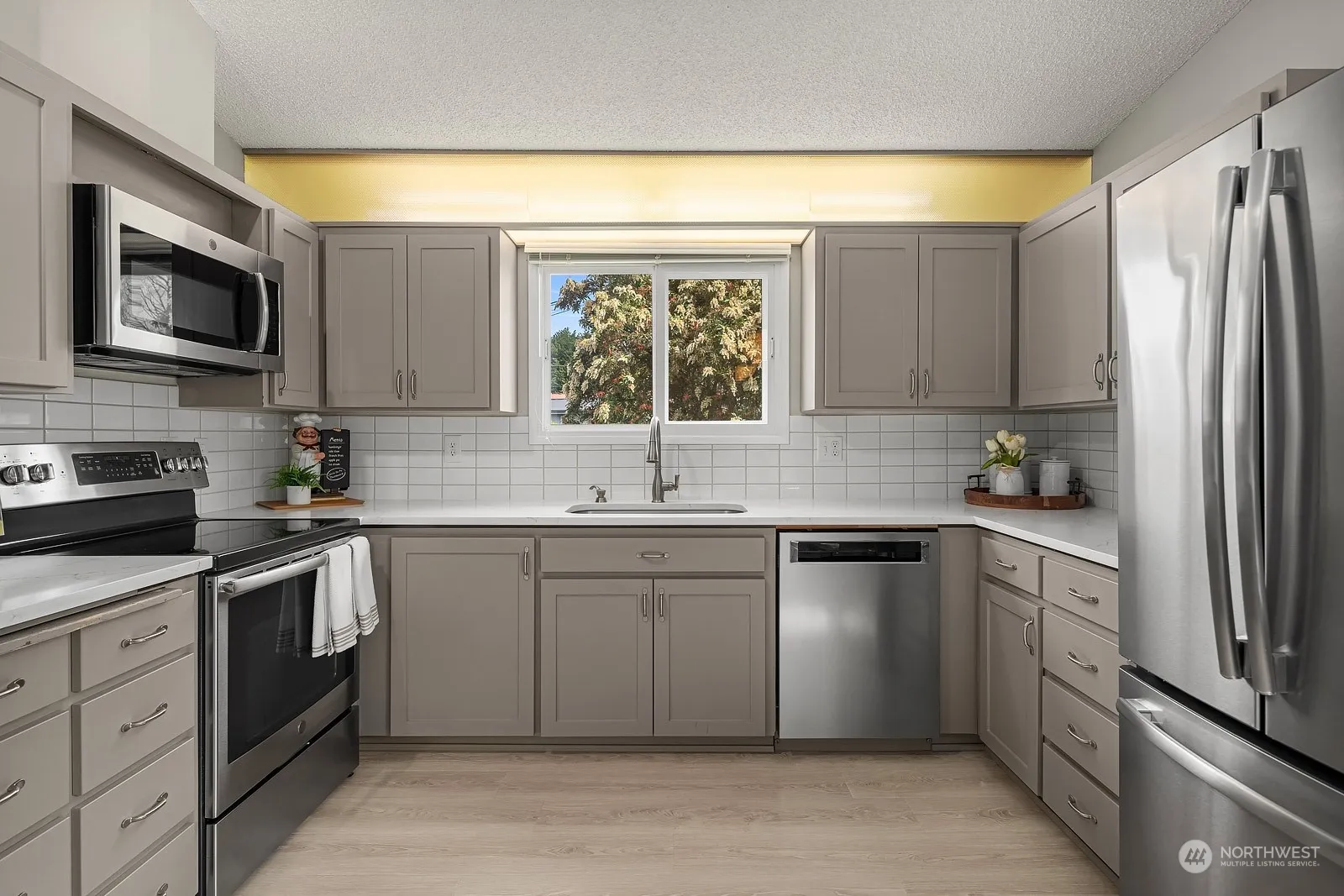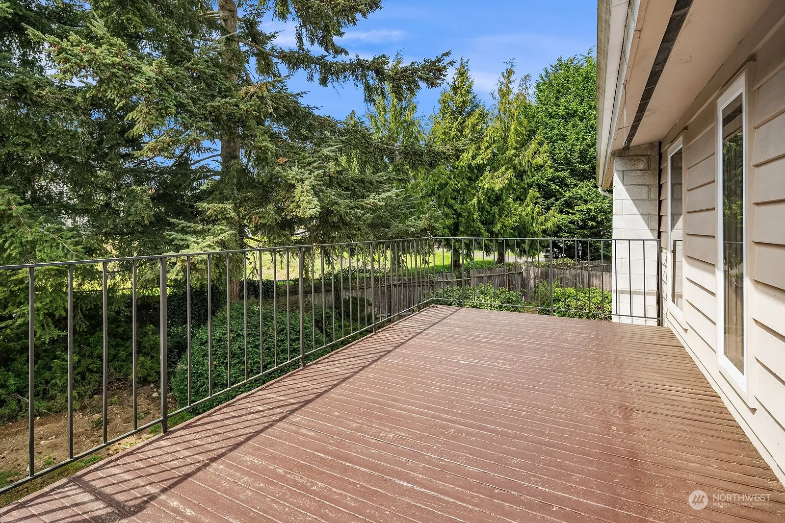 Charming and spacious home shows pride of ownership. Located in a cul de sac setting in quiet neighborhood with landscaped privacy. Vaulted ceilings and large picture windows create a light and bright environment. Updated kitchen with stainless steel appliances, quartz countertops, and ample cabinets. Dining and living room offer a pleasant backyard view with access to roomy deck. Generous primary bedroom with attached bath offers a space to unwind and relax. Daylight basement with spacious family room and cozy gas log fireplace. Large laundry room is also great for additional storage space. Large backyard for outdoor activities and garden space. Exterior painted in 2022. Radiant gas heat. Convenient access to freeway for commuting.