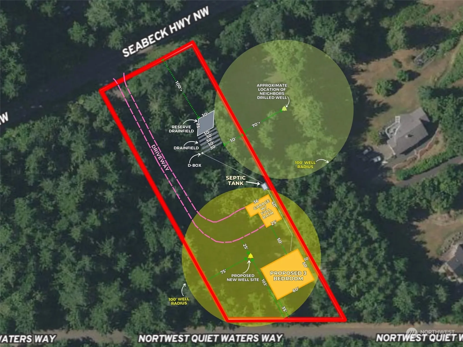 1.44-acre building site w/ western views of Hood Canal & Olympic Mountains! Lots of preliminary work completed: Building Site Application for large home + garage w/ full bath, 3-bedroom gravity septic system design, proposed well site, & soil study. Building & garage sites are cleared. Punched-in driveway w/ concrete approach off Seabeck Highway NW to county standards + potential access off Quiet Waters NW. Power is in-street. Close to Scenic Beach Park, Boat Launch, & Seabeck Marina. Central Kitsap School District. Once you cut down some trees, the view will be even better! Topography is most favorable for construction designs that incorporate a daylight basement though there are several other options that should work. Waterview lot.