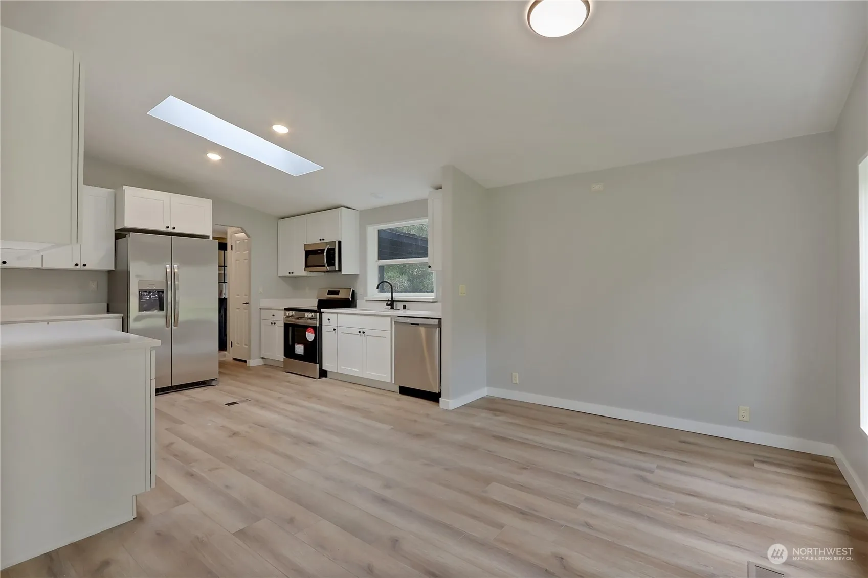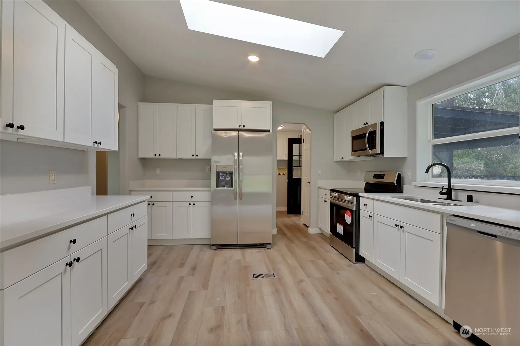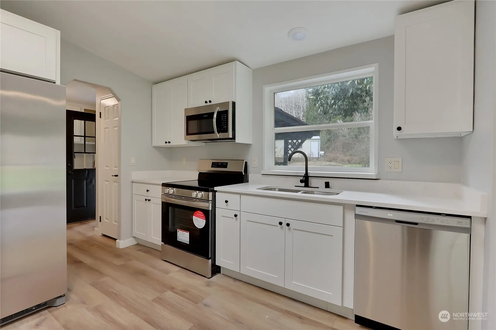 This charming 2-bedroom plus den home, nestled by a serene creek in the Lake Arrowhead community, boasts an open layout with a spacious living room, a modern kitchen adorned with white shaker cabinets, quartz countertops, and stainless steel appliances. Enjoy the elegance of luxury vinyl plank flooring throughout. The expansive primary bedroom features an ensuite 5-piece bathroom with a soaking tub, dual sinks, and a walk-in closet. Outside, a large wrap-around deck and a 240 sq ft outbuilding/cabin enhance this property’s appeal, along with ample parking space.
