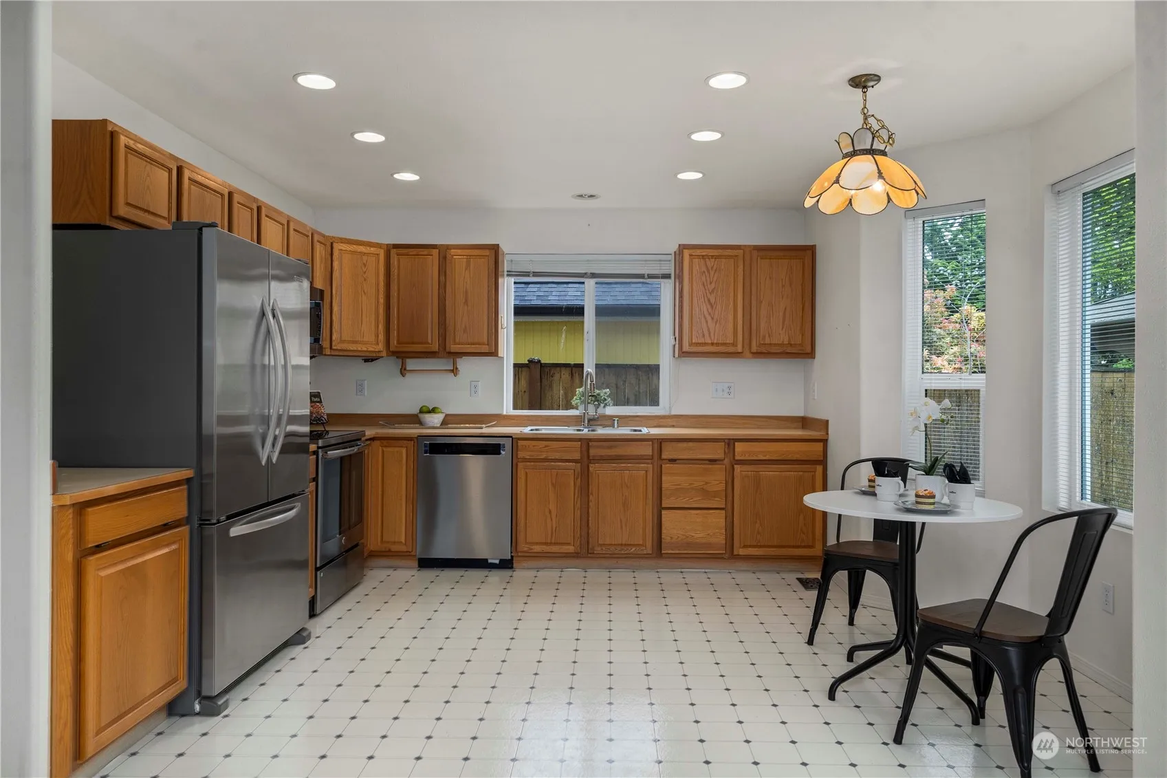 The perfect blend of location and comfort in this charming Maple Valley home! Nestled near Lake Wilderness, it offers convenient access to the lake, park, boat launch, and more. Move-in ready, it features a quiet street setting with mostly lakefront properties. Enjoy peek-a-boo lake views from the nice-sized yard and patio. Inside, the living room boasts a cozy fireplace and hardwood flooring, while the kitchen opens to the family room. Upstairs, the primary suite offers an attached bath, with good-sized bedrooms and a main bath completing the layout. Newer metal roof from 2022 ensures durability, and a heat pump provides air conditioning. Don’t miss out on this gem in the sought-after Tahoma school district!