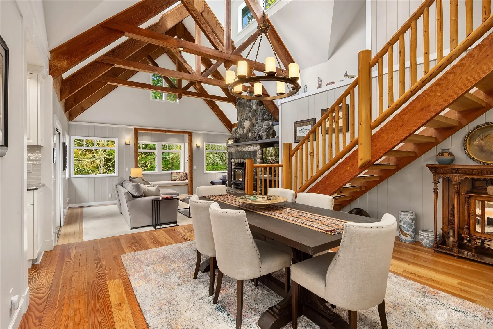 An enchanting covered walkway welcomes you home to this private oasis on 1.37 acres with a pond, waterfall, decks, and sauna. Custom crafted timber-frame style home with exposed beams, soaring cathedral ceilings, centerpiece river rock fireplace with bronze surround and alcove. Upgraded kitchen with granite counters, subway tiled backsplash, Sub Zero fridge and Wolf Range. Primary suite on main with a cozy gas fireplace and private back deck. Main floor office or den with wood built-ins. Another bedroom and flexible loft space upstairs. Finer details throughout like handcrafted doors, custom cabinetry and fir flooring milled from trees on the property. A two-car detached garage with plans for an ADU. A wonderfully private island package.