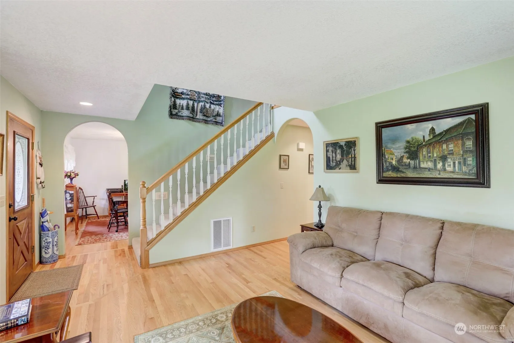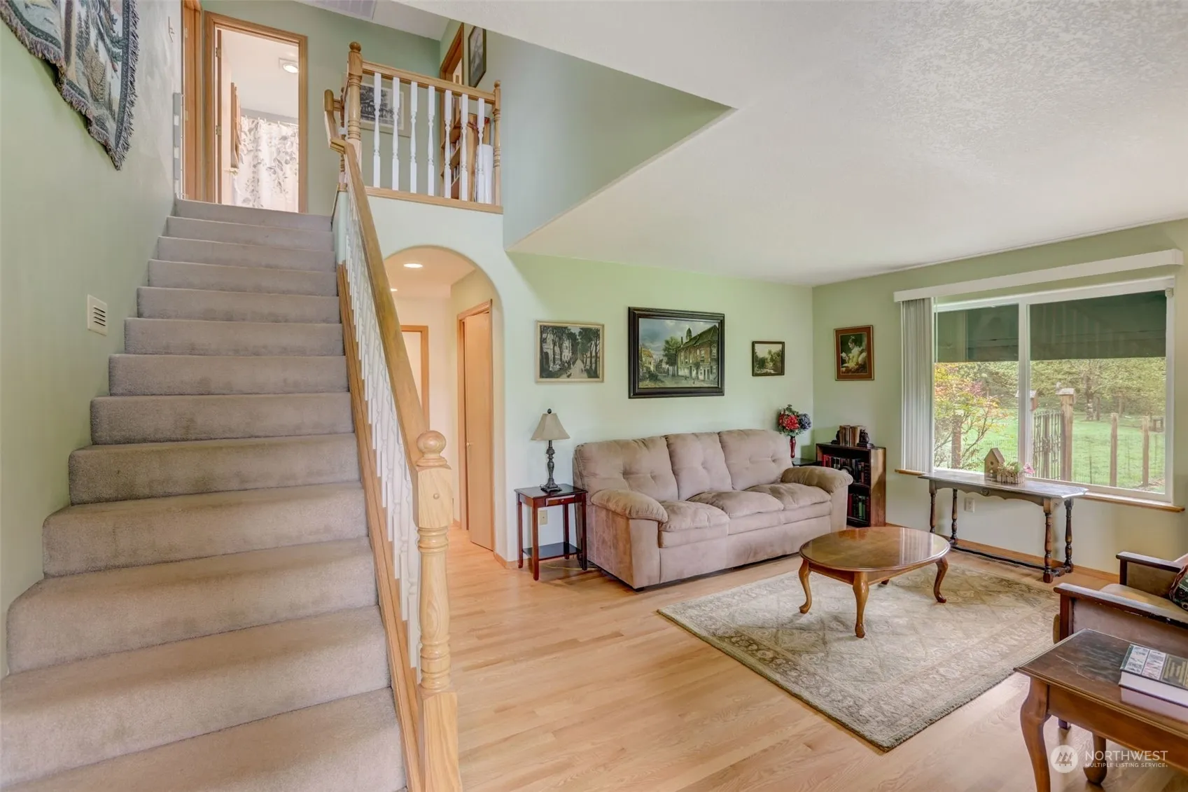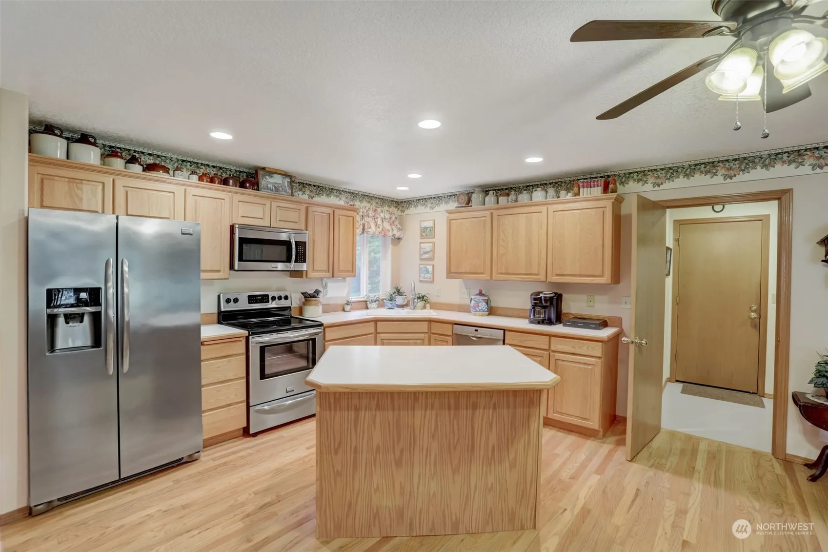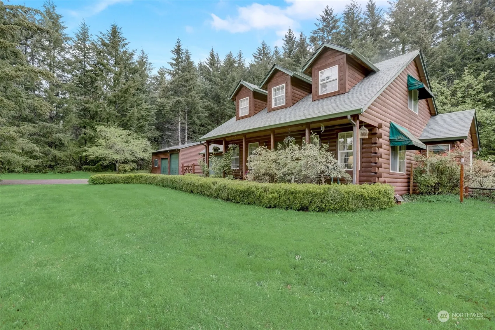 Beautifully cared for home w/ Primary Bedroom & Bath on Main Level for Multi-Generational Living, sitting on a Private and Park like 5 acre parcel w/approx 1.5 acres Fully Fenced. Main Level has Oak Floors in Kitchen, Dining Room, Living Room w/Cozy Pellet Stove, and Family Room w/Vaulted Ceilings, Picture Windows and Slider to Deck. Upper Level has Two Bedrooms and Full Bath w/Skylight. Big Garage w/Dog Pen & Dog Door to Yard. Fenced Yard: Patio w Koi Pond, 8’x12′ Greenhouse w/Solar Lighting-Vintage Windows-Chandelier, Rainier Cherry, Pear and Apple Trees, and Various Blueberry Bushes. Oversize 24’x36′ Two Bay Detached Shop w/ RV/Boat Parking and a Workshop w/20′ long Workbench. Home has New Heat Pump, Central Heat/AC and a Newer Roof.