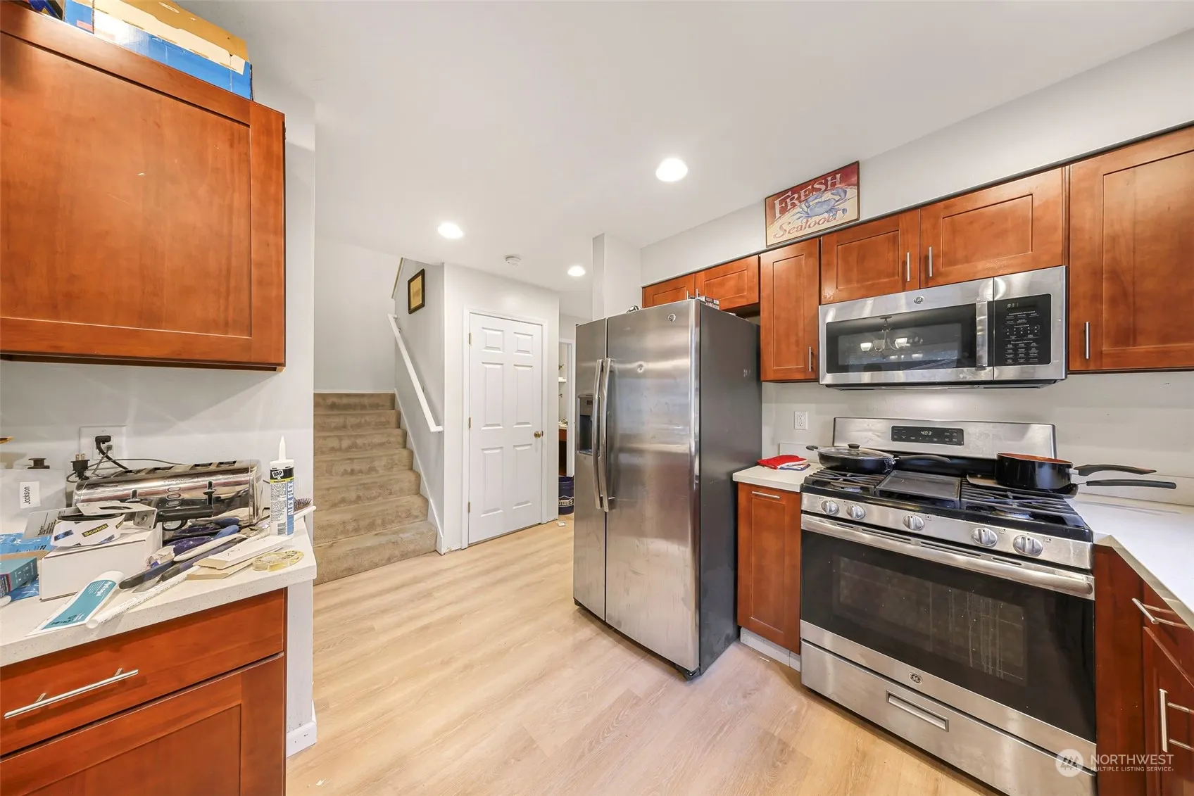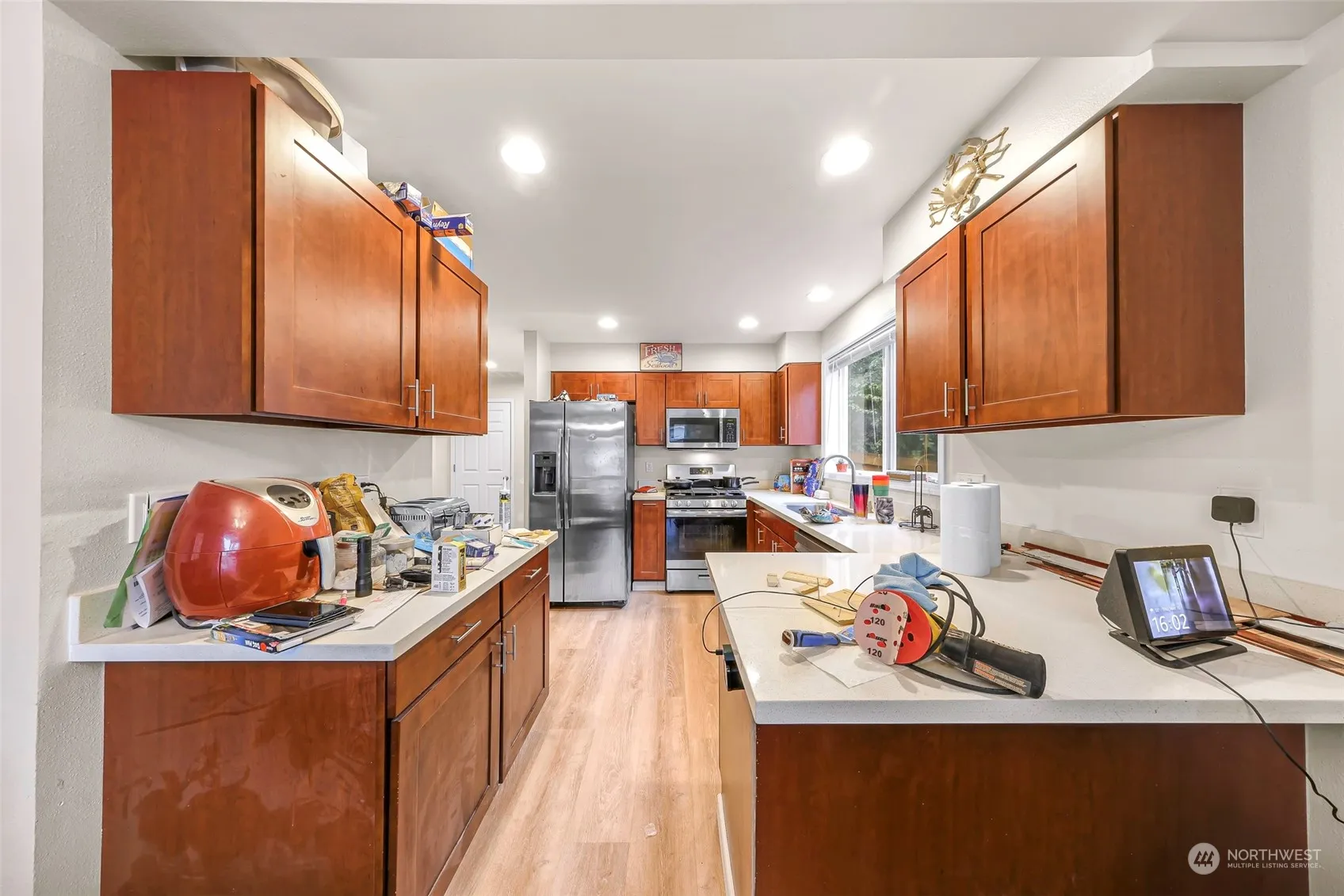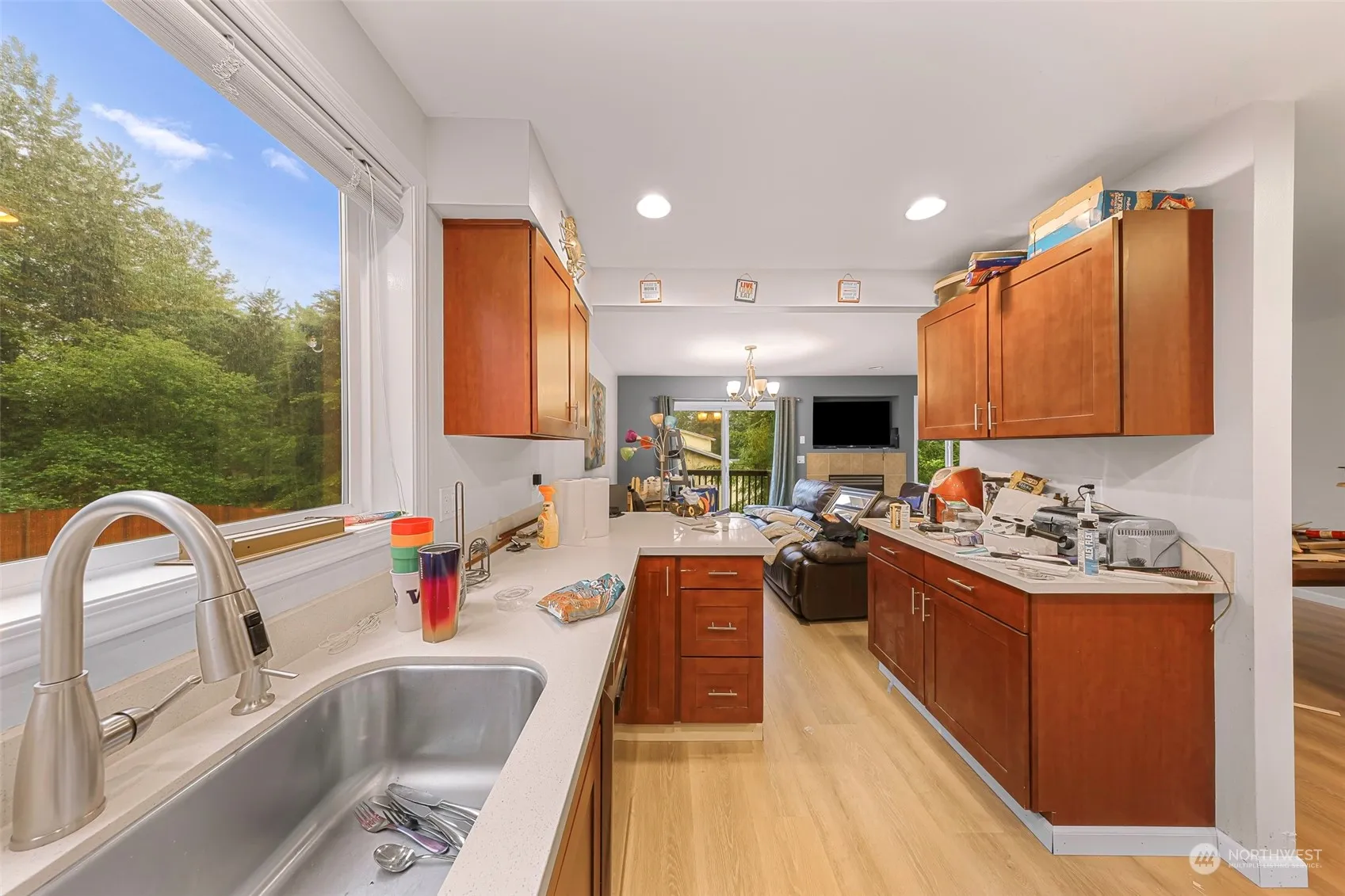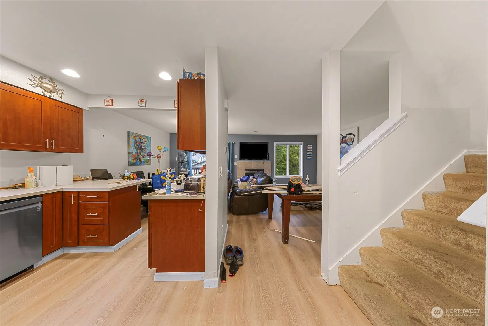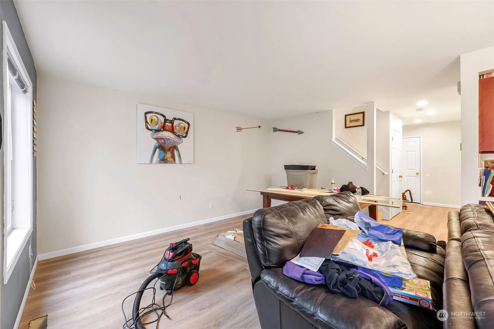 Great starter home on a large lot w/ native growth greenbelt backing on a quiet cul-de-sac. Main floor features Quartz kitchen w/ lots of counter space, bar seating & soft close cabinets, large living room w/ new flooring, cozy gas f/p & dining area. Upstairs find primary suite w/ vaulted ceilings, sky light & 5 piece en suite as well as oversize closet. 2 additional generous size bedrooms, full guest bathroom & full laundry room. Tons of yard space to play & entertain. 2 car garage & driveway parking space. Conveniently located w/ easy access to shopping/dining/hw9/I5 & community playground near by! Desirable Arlington School District.