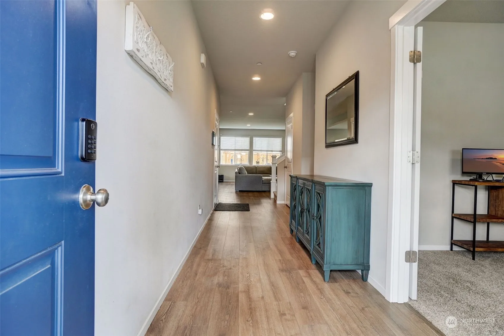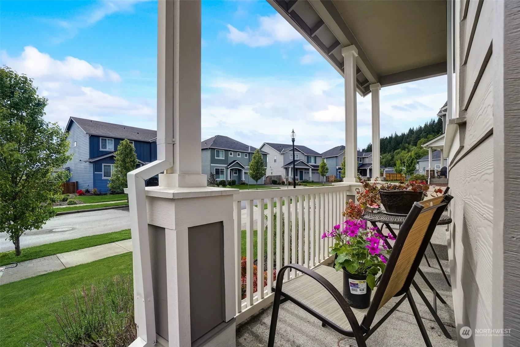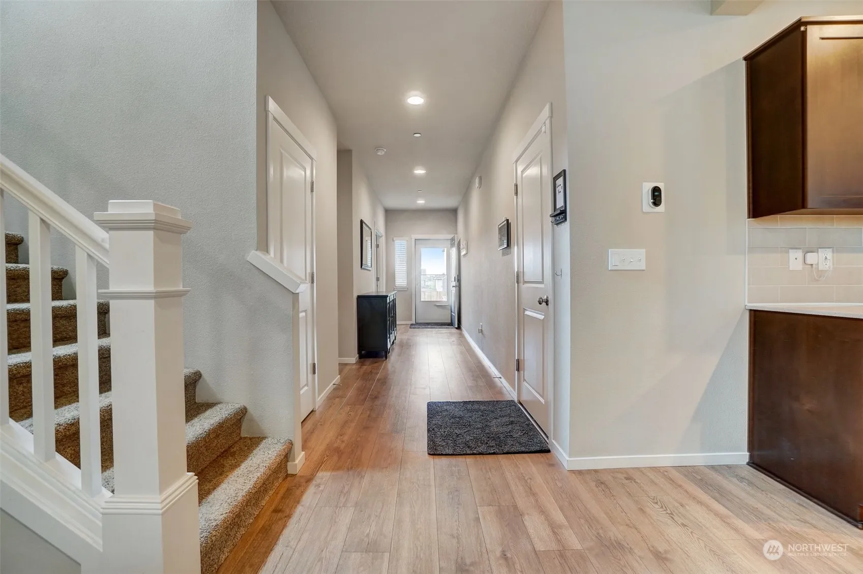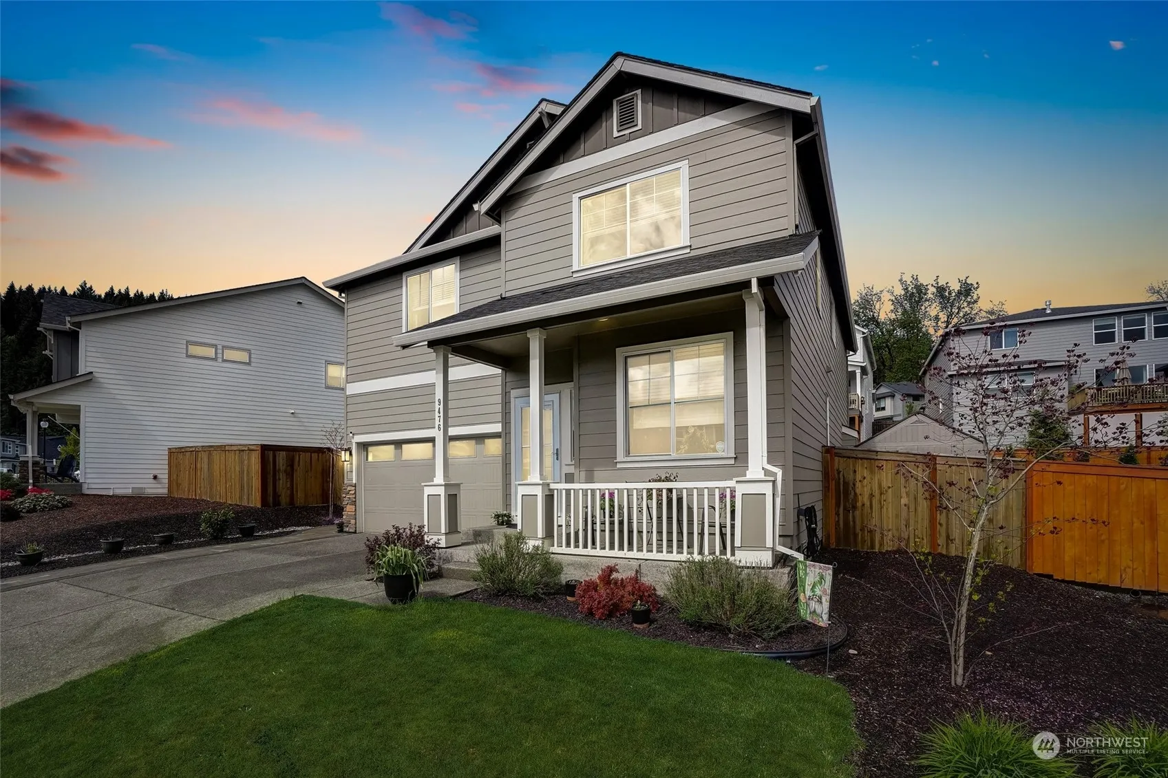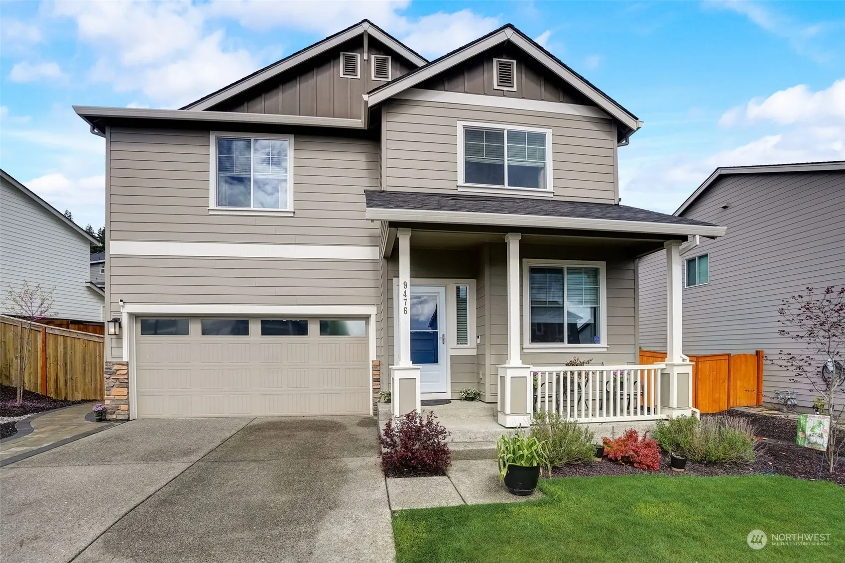 Welcoming covered front porch, storm door and keyless entry, all under high ceilings and laminate flooring. Great room family room offers a gas fireplace, recessed lighting and laminate floor. Gourmet kitchen boasts stainless appliances, quartz counters, subway tile backsplash and walk-in pantry. Dining area leads to covered patio. Upstairs, primary en-suite features a walk-in closet and luxurious bathroom. Three additional bedrooms, bonus room and laundry room complete the upper level. An additional bedroom on main level. Additional features include high ceilings, motion light sensors, fire suppression sprinklers and Wyze smart home features. Outside, enjoy the covered front porch and back patio, landscaped surroundings and 2-car garage.