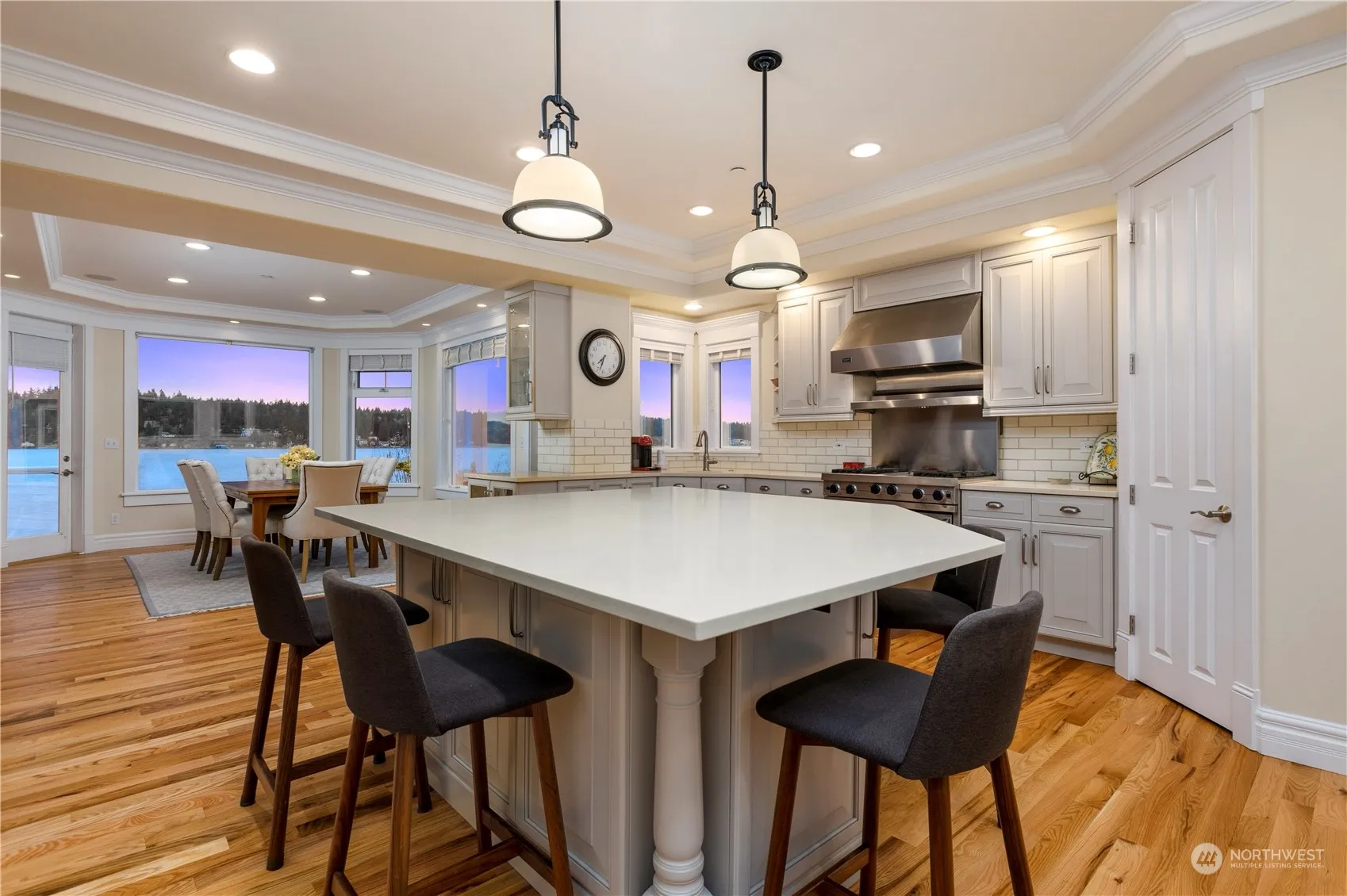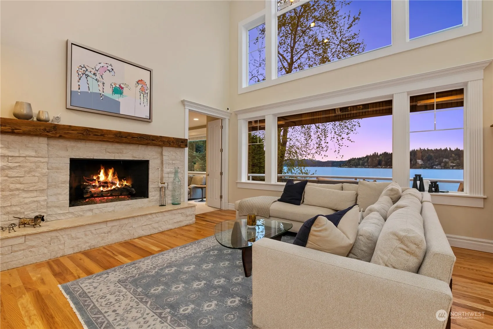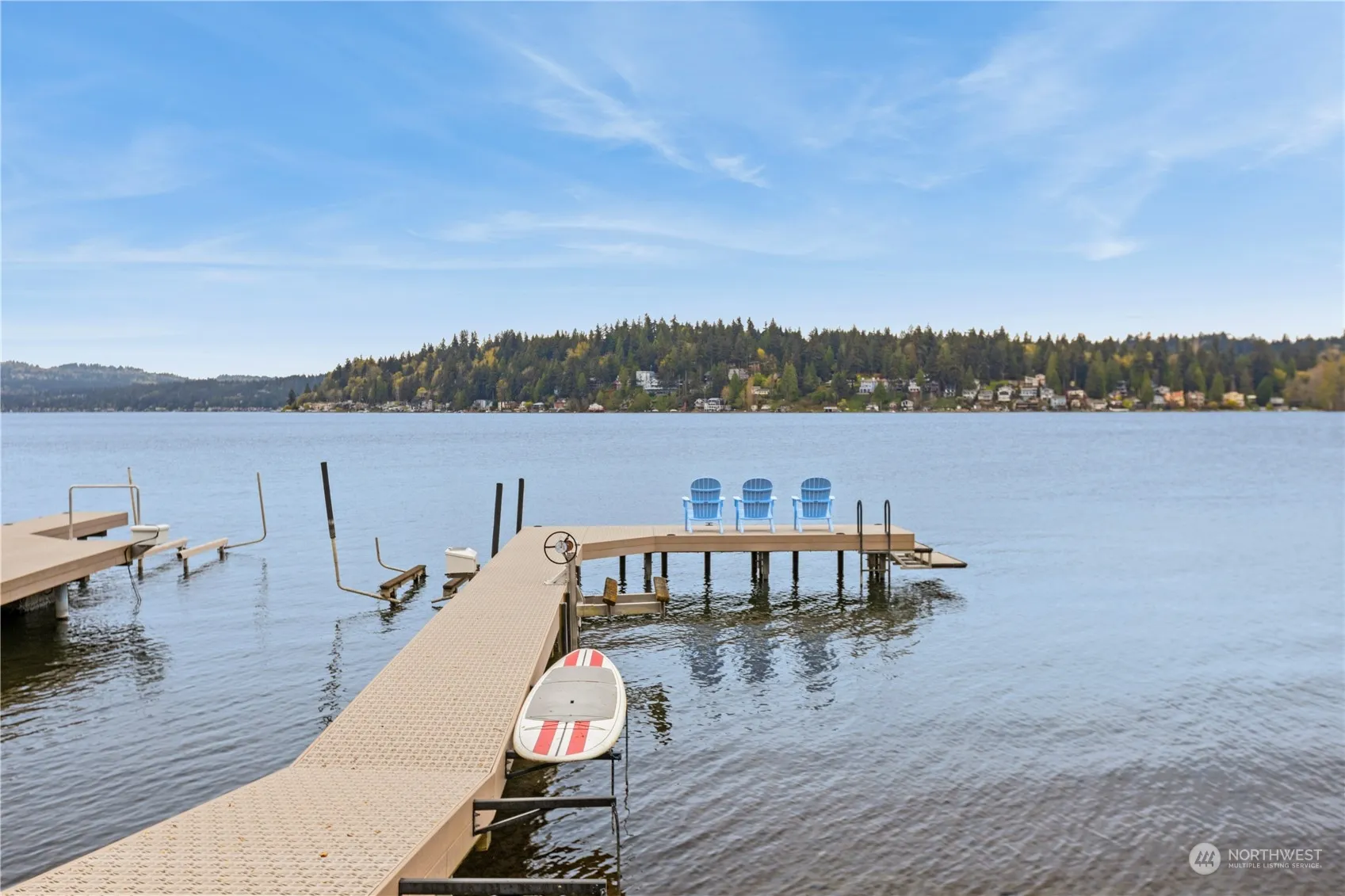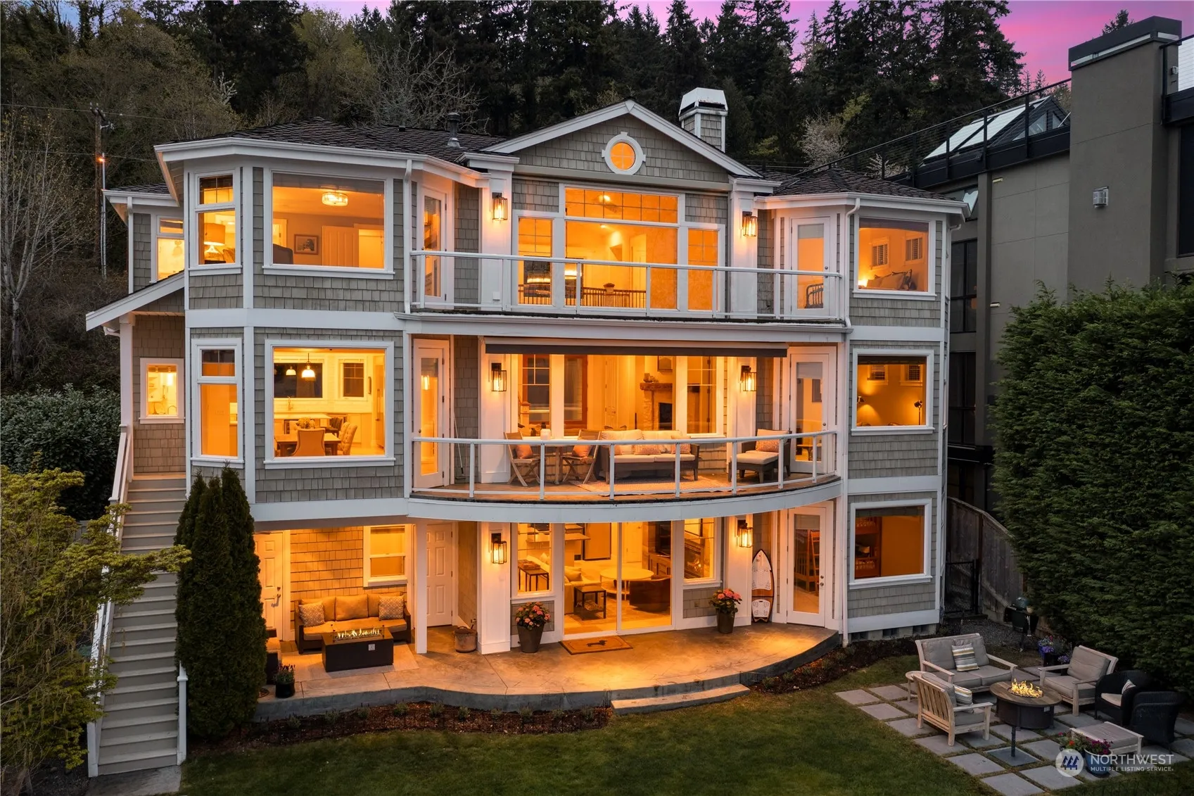 Experience a symphony of water, light and breathtaking views on 65 feet of Lake Sammamish waterfront. This Nantucket-inspired home offers luxurious and peaceful living with stunning lake views, elegant finishes and effortless indoor-outdoor flow. The gentle sound of lapping waves, the warm glow of the setting sun and majestic Mt. Rainier in the distance provide a sensory escape from daily life. With three spacious levels, hardwood floors, crisp millwork, and natural stone accents that echo the surrounding landscape, this home exudes tranquility and sophistication. A complete 2nd kitchen opens to lush lawn, a private dock and boat/jet ski lifts for endless lakefront adventures. Ideally located just steps from the East Lake Sammamish Trail.
