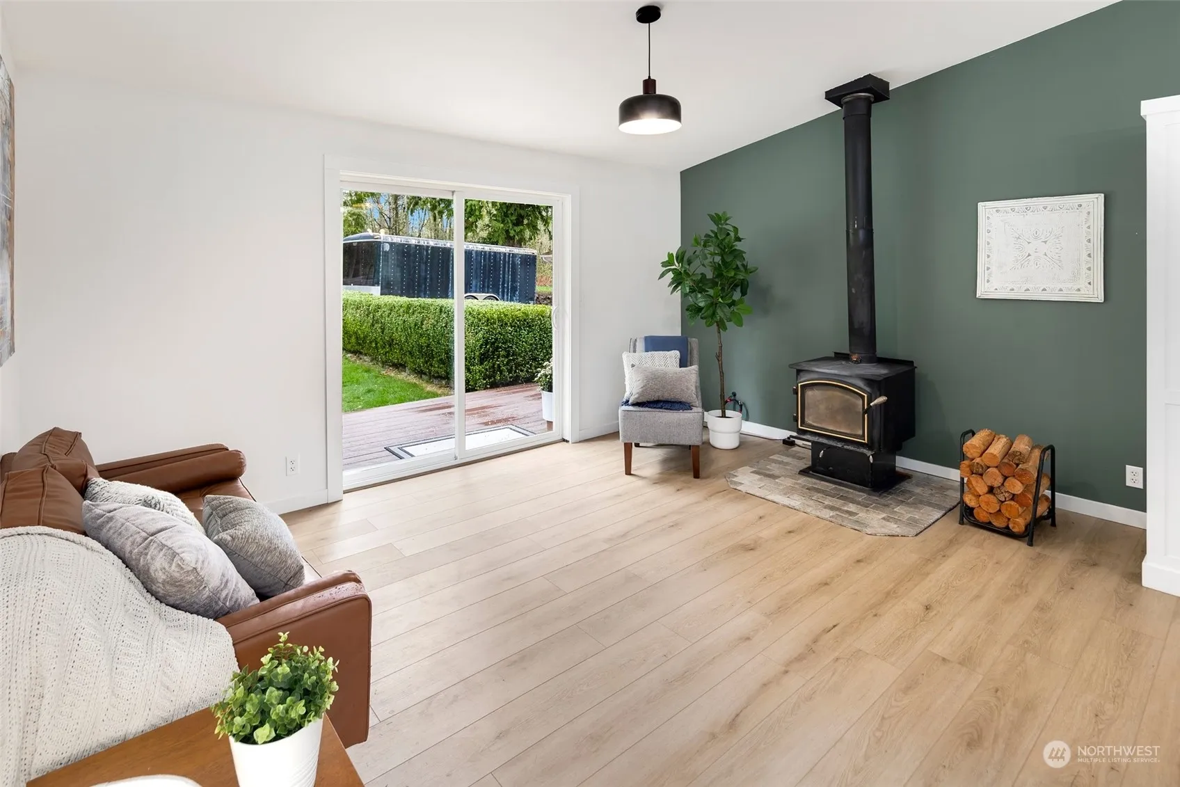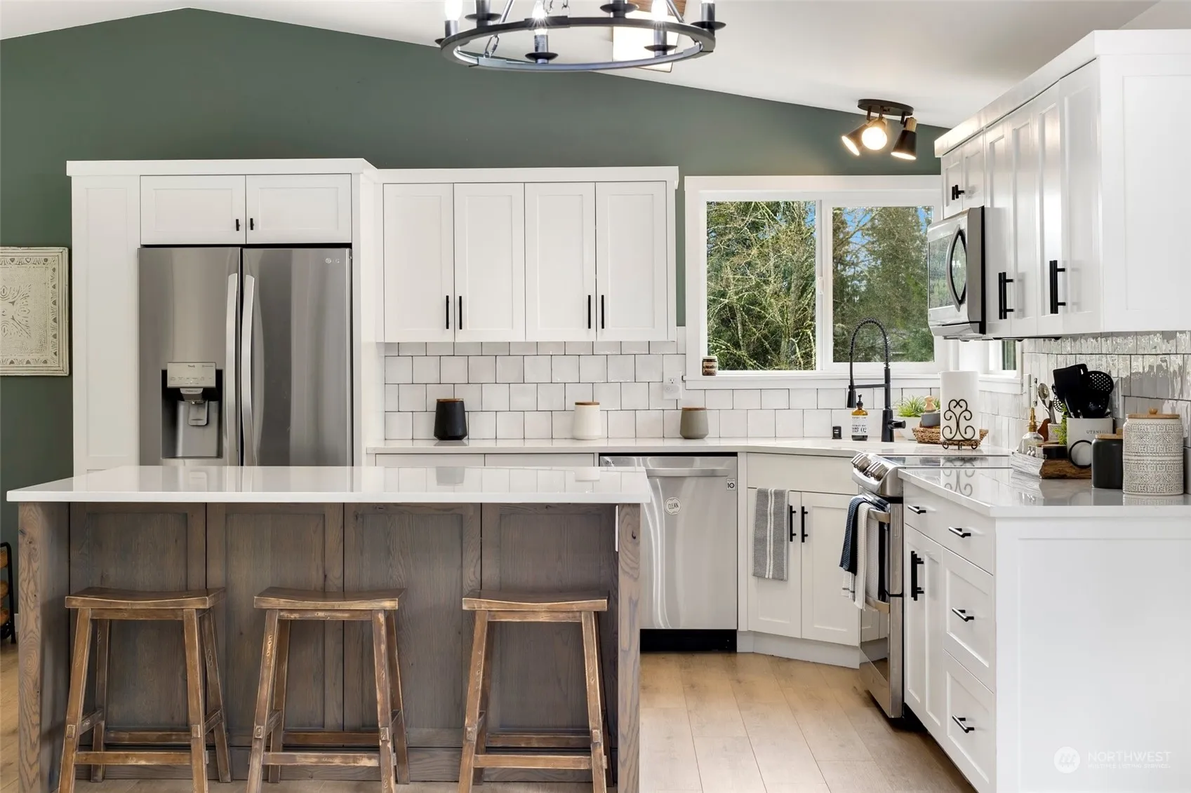 Turn down the private tree-lined lane to your NW sanctuary featuring a phenomenally remodeled, contemporary A-frame style home set on 2.5 acres of flat, park-like, fully fenced property. Open living room-kitchen plan w/quartz countertops, stainless appliances, tile backsplash & huge island w/French doors to enormous deck overlooking the gorgeous yard. New LVP flooring, freshly painted w/dramatic vaulted ceilings. Large living room w/addt’l sliders to deck & office/den. Primary bedroom w/walk-in closet & en-suite bath w/dual vanity. Mudroom/utility room, 3 car garage w/almost 700sf of additional living space above w/kitchenette, bathroom & flex room/office for potential ADU? Long driveway w/ RV parking & space for just about everything!
