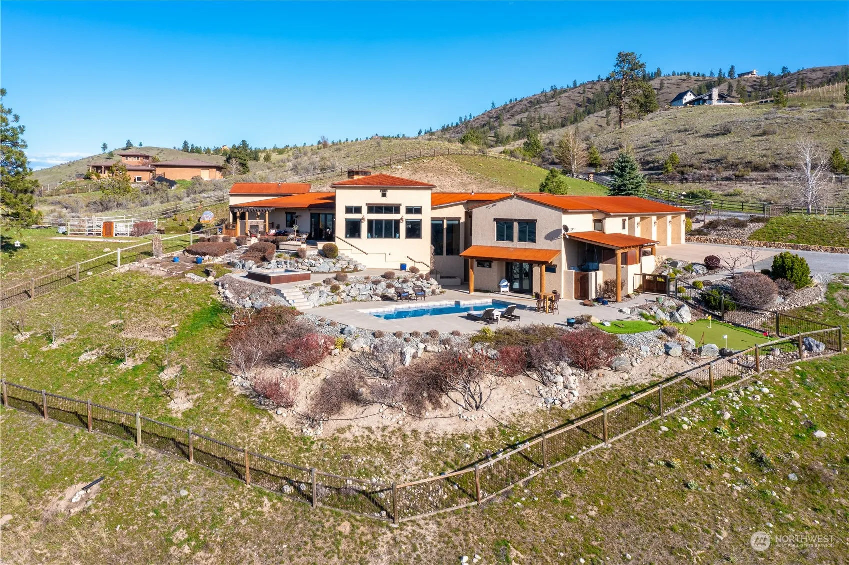 Welcome to 105 Dove Hollow Road at Hawks Meadow! Shy 4400sq’ daylight rambler on a 21+ acre estate property w/ incredible views of Lake Chelan, Bear Mt GC, & surrounding territory! This gorgeous home & property was carefully thought out in design & has it all including saltwater pool, in ground spa, bocce ball court, garden, golf tee & green, & numerous outdoor living spaces. Inside find high quality finishes & features throughout including knotty alder window package, 8ft solid core doors, 3 fireplaces, butler’s pantry, wood fired pizza oven, theater, wine room, & more! The privacy & natural beauty w/in the Hawks Meadow gated community is unmatched! Located just a few miles to downtown Chelan & accessed by all year round maintained roads!
