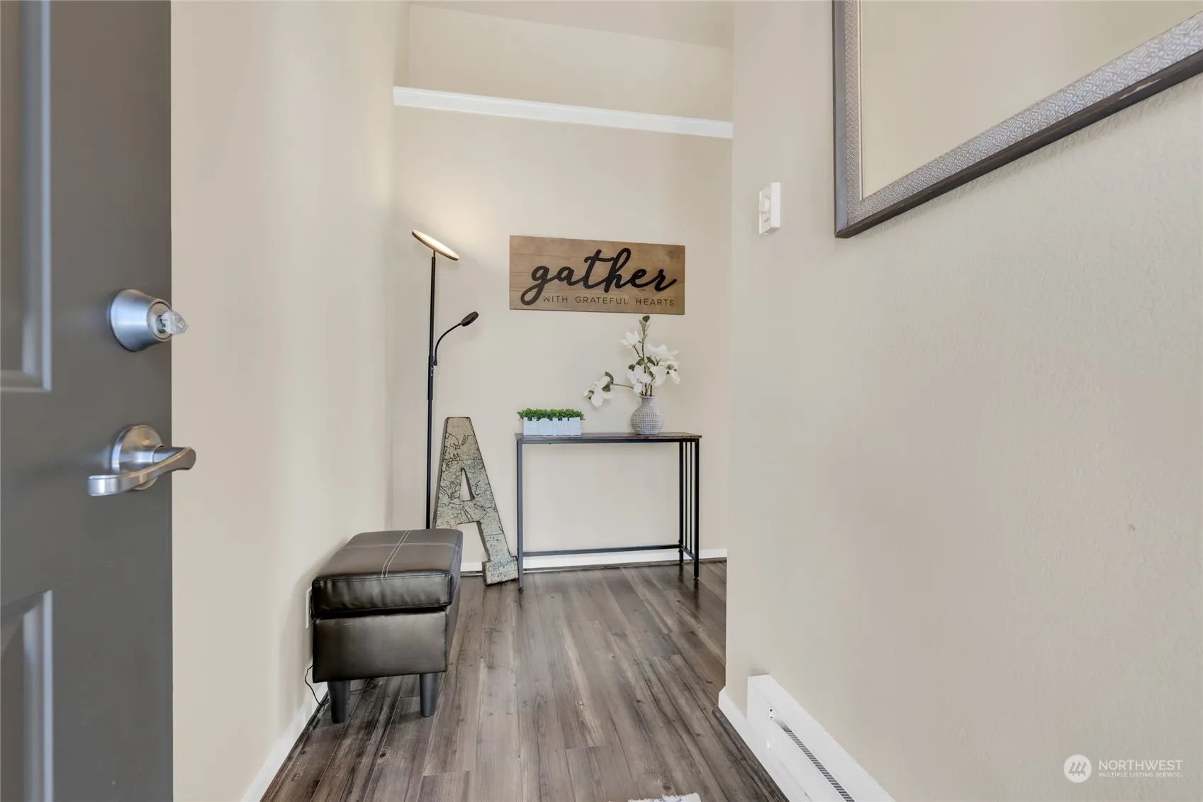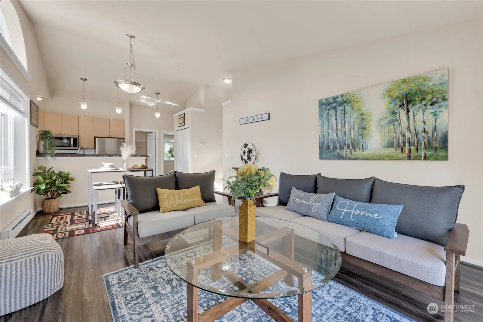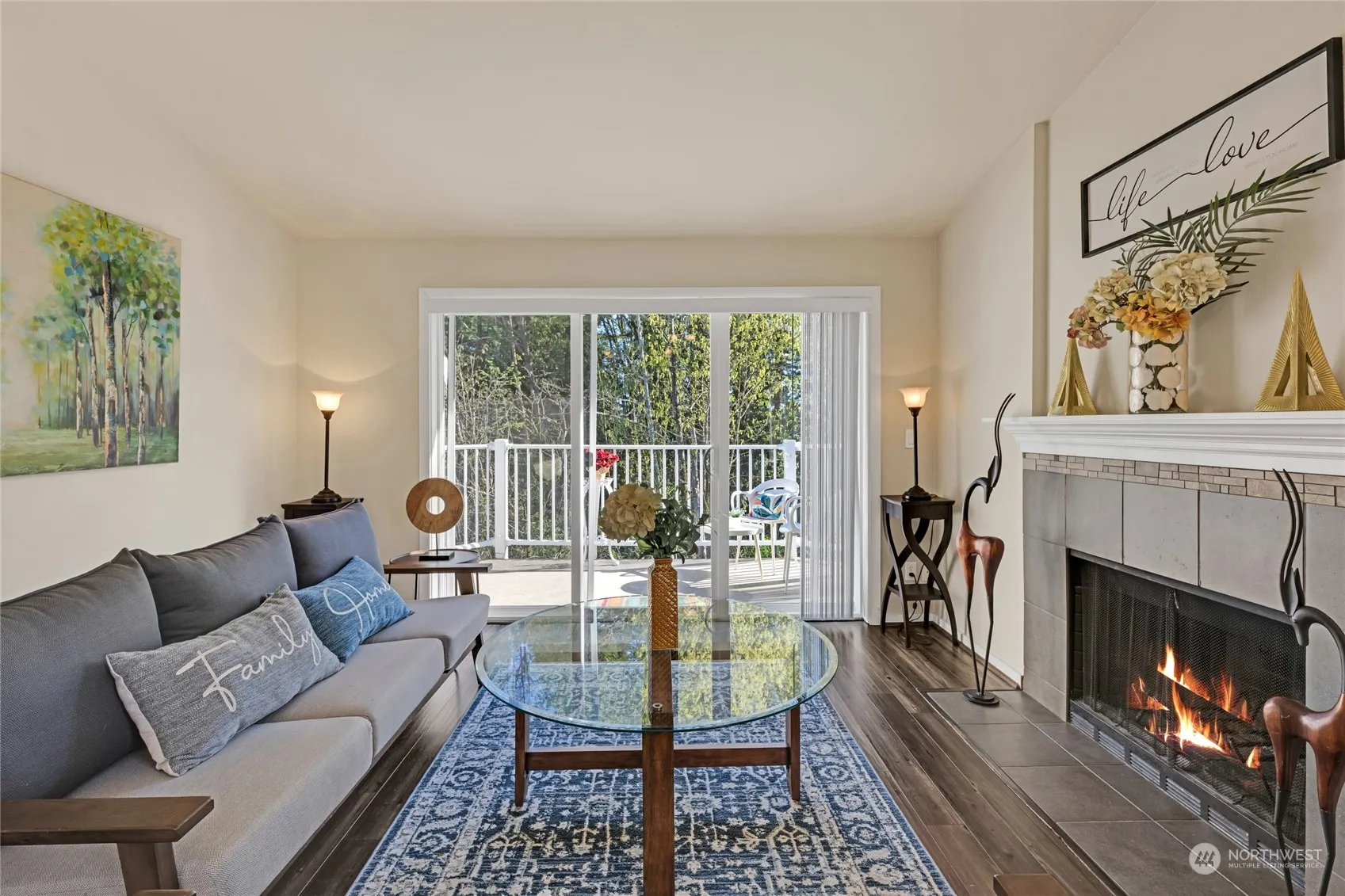 It’s all about the location! This move in ready 3-bed/2-bath TOP FLOOR CORNER UNIT is across from the MCTC, Town & Country Market, restaurants & shops+NO RENTAL CAP. Vaulted ceilings & filled w/natural light this open concept home is warm & inviting. The kitchen has ample cabinet & counter space w/granite & SS appls open to dining area & spacious family room w/FP & slider to your private deck backing to green space. Large Primary w/ensuite full bath is private & peaceful w/views of the greenbelt. 2 more good sized beds & full bath. 2 assigned parking spaces-1 covered.Extra storage on patio. Enjoy the amenities:Pool, Cabana/clubhouse w/kitchen, entertaining area & fitness center. Commuters dream- Just mins from I-5 & I-405. HOA covers W/S/G.