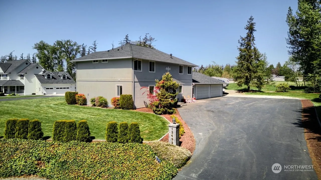 Calling all car buffs! 2983 sq ft, two-story w/ 4 car attached garage in the desirable Bayview neighborhood of Bridgewater Estates. Design an outdoor haven on the 1.2 acre nestled against a treed back drop providing room to breathe & more country setting to enjoy. Main floor Primary Bdrm w/sitting area, propane FP in Living room leading to deck offering hours of relaxation & is the perfect place to take in the Padilla Bay views. Large eat in kit w/newer appliances. Upstairs can accommodate work from home w/den/office loft, large family room w/balcony. 2 bdrms upstairs both w/ensuite baths, plus flex room & addtl full bath. New roof 2021, furnace in 2023. Create your ideal setting w/room to roam, ever-changing vistas plus Padilla Bay views.