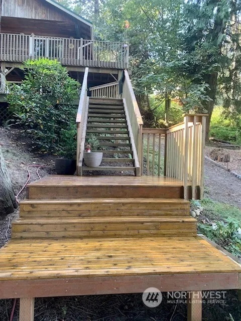 Totally furnished ready to occupy secluded Two Bedroom Two Story Cabin with Many, Many Extras. Surrounded by tall old Island Cedars, Owls and Eagles. Located in private island community that has marina, golf course, parks, athletic court, beaches and more. Views of mountains and sound.