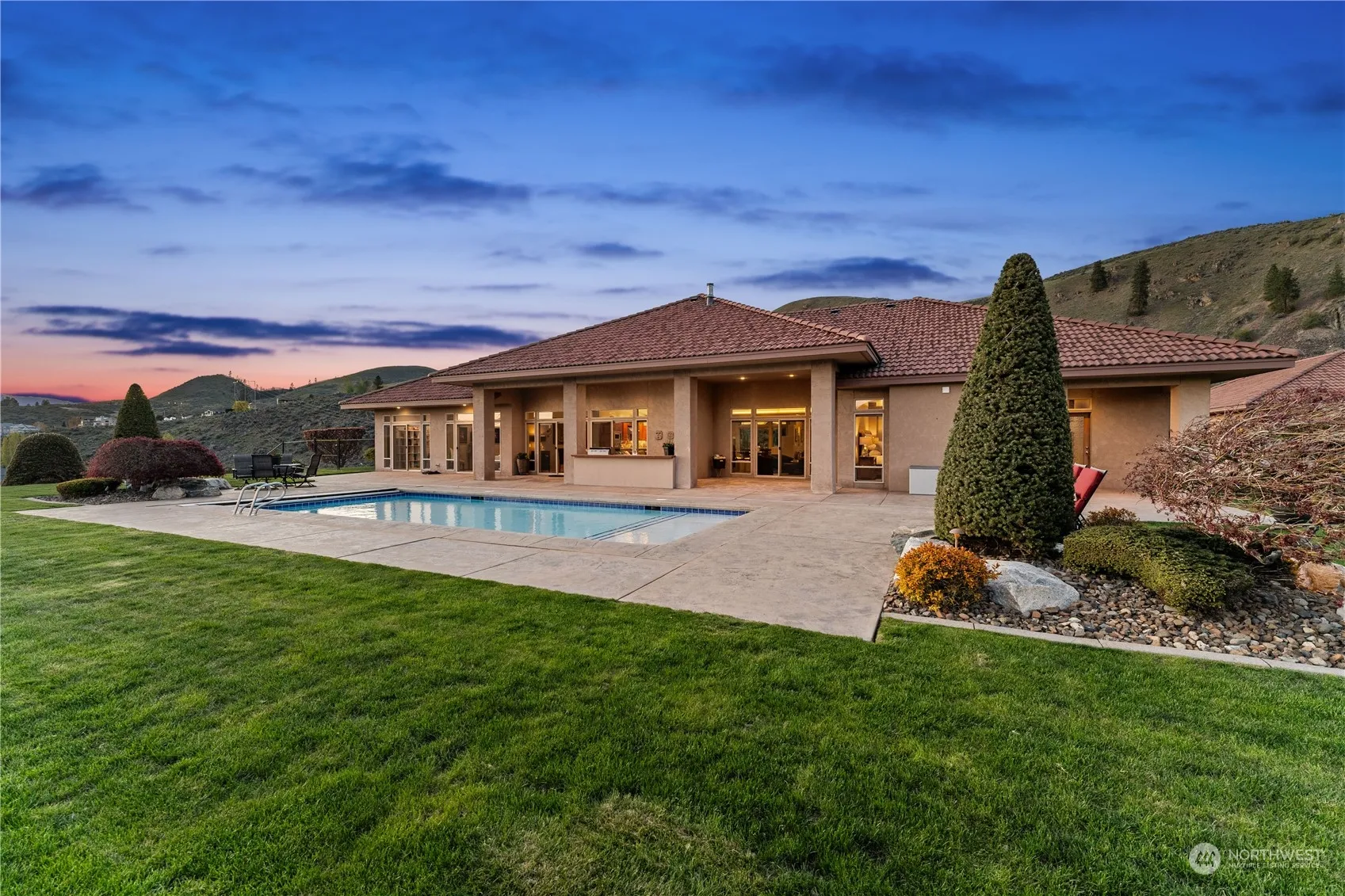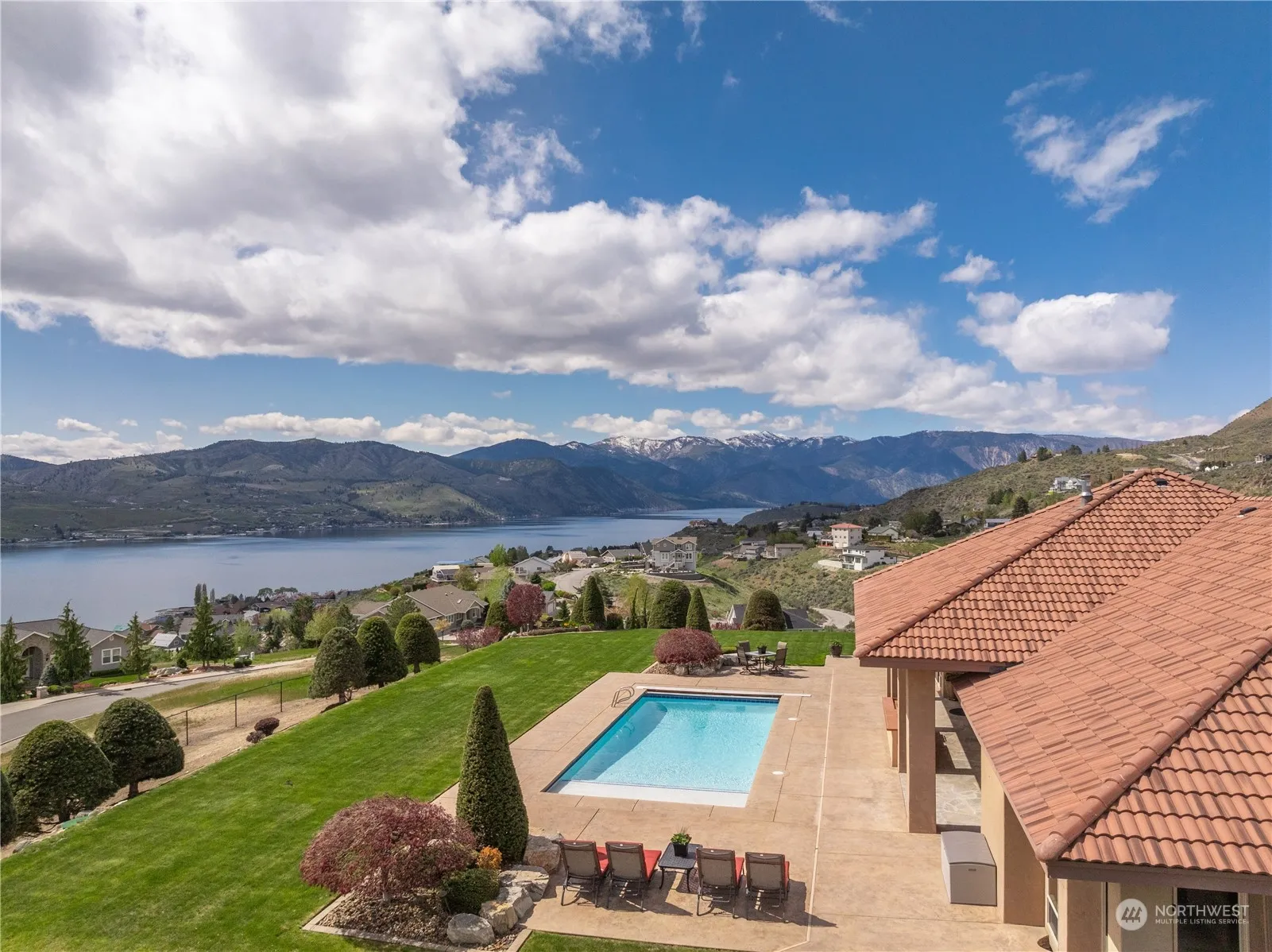 This spacious four bedroom home is nestled above neighboring homes which provides complete privacy. Large windows throughout allow ample light to fill the rooms & offers stunning views of Lake Chelan from every angle. The interior is elegantly designed w/high end finishes, creating a comfortable & luxurious living space. With unobstructed sweeping views of Lake Chelan from Chelan to Manson, take in breathtaking sunsets from your sprawling backyard which features an in-ground swimming pool, fully fenced yard, covered patio & built in cooking area for entertaining. Garden space to grow, 5 garage spaces w/RV parking & ample space for toys. This idyllic retreat offers the perfect blend of luxury, comfort & natural beauty. Includes adjacent lot.