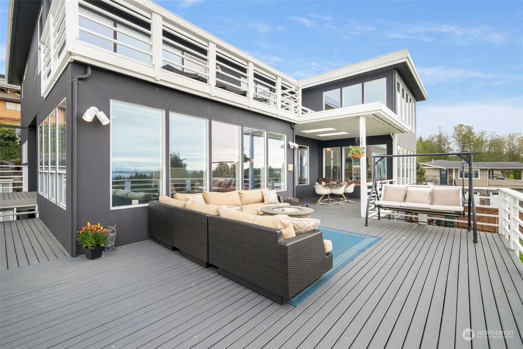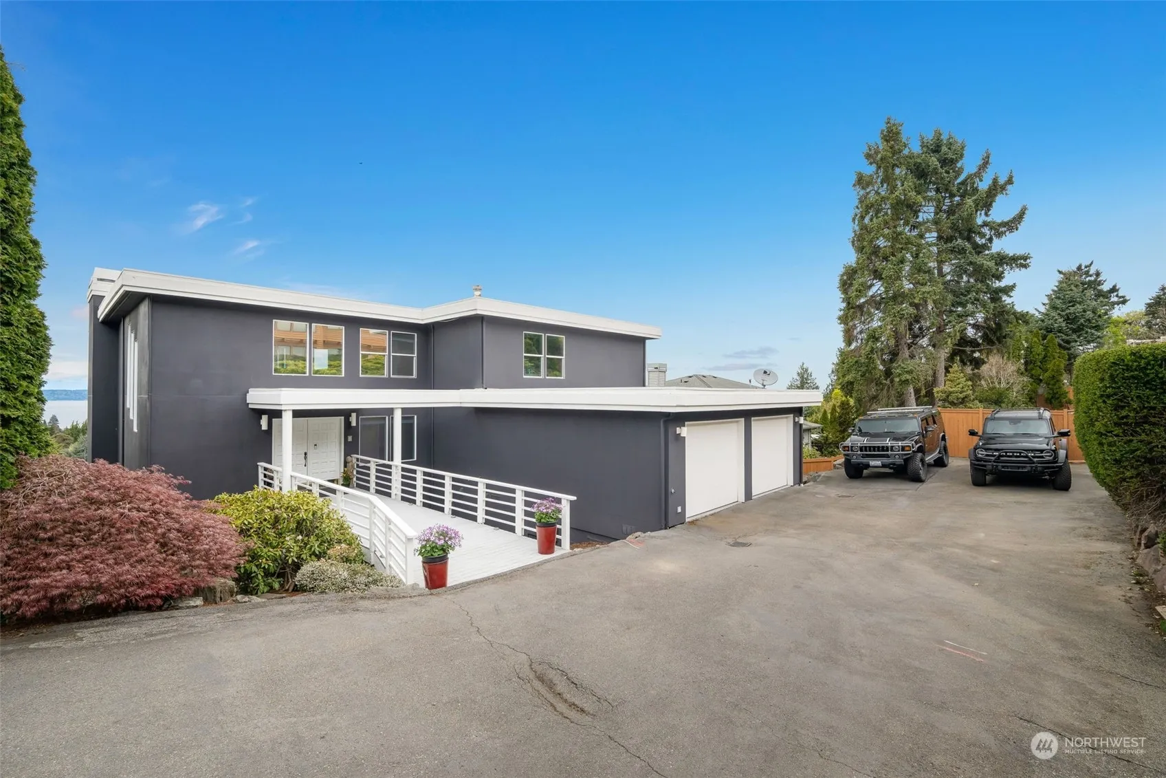 Perched at the summit, this sensational contemporary home offers panoramic vistas from every angle. A captivating water feature beckons you inside, while floor-to-ceiling windows adorn the western wall, bathing the space in natural light. Designed for seamless entertaining, an open floor plan flows effortlessly, complemented by multiple decks strategically positioned to capture the breathtaking scenery. Indulge your culinary aspirations in the chef’s kitchen, boasting high-end stainless appliances, refinished hardwoods & a walk-in pantry. The dynamite primary retreat features an en-suite bath & a private view deck. Completing the picture-perfect setting is a rare level & sun-kissed backyard. Welcome to luxury living at its finest!