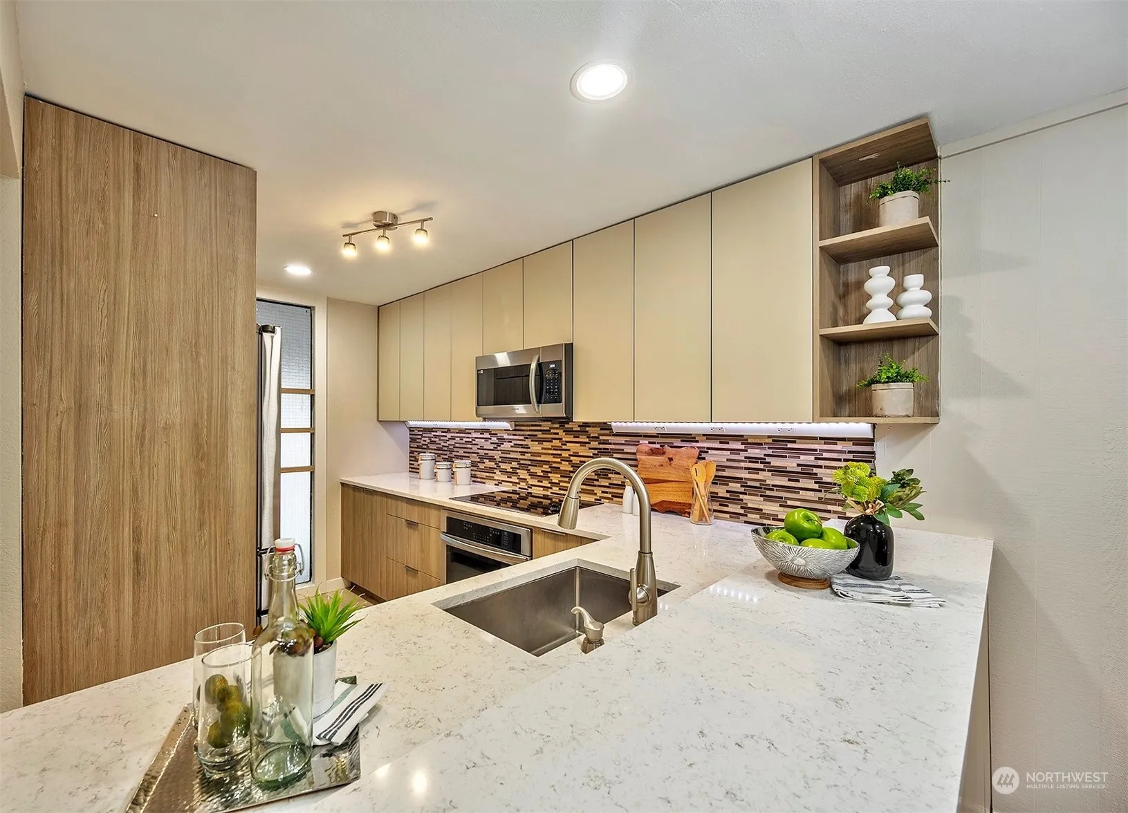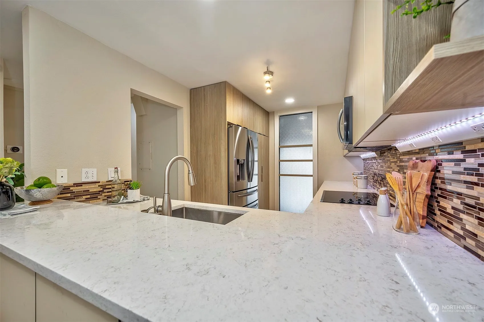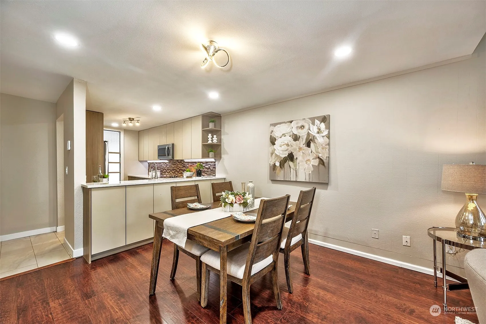 Come live on the lakes of Sixty-01 in Redmond. This completely updated 2-story townhome boasts 2 beds & 1.25 baths. The kitchen is a chefs dream, with quartz counters, plenty of cabinetry & pull-outs, SS appliances & even heated tile floors! The bright, open concept living spaces boast engineered hardwood floors, vaulted ceilings & a wall of windows flooding the space with natural light. Enjoy your private oasis from the deck backing up to one of the 3 lakes. Upstairs, you will see 2 beds & a beautifully updated bath with a granite-topped vanity, tile-surround shower, & a washer & dryer. Close to 520, 405, Microsoft, parks, & shopping. Amenities include 4 pools, clubhouse, sauna, rec room, garden space, tennis courts, & more. No rental cap.
