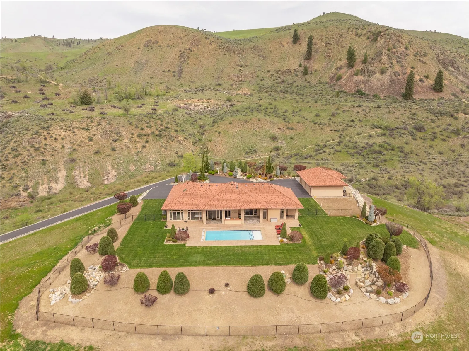 This spacious four bedroom home is nestled above neighboring homes which provides complete privacy. Large windows throughout allow ample light to fill the rooms & offers stunning views of Lake Chelan from every angle. The interior is elegantly designed w/high end finishes, creating a comfortable & luxurious living space. With unobstructed sweeping views of Lake Chelan from Chelan to Manson, take in breathtaking sunsets from your sprawling backyard which features an in-ground swimming pool, fully fenced yard, covered patio & built in cooking area for entertaining. Garden space to grow, 5 garage spaces w/RV parking & ample space for toys. This idyllic retreat offers the perfect blend of luxury, comfort & natural beauty.