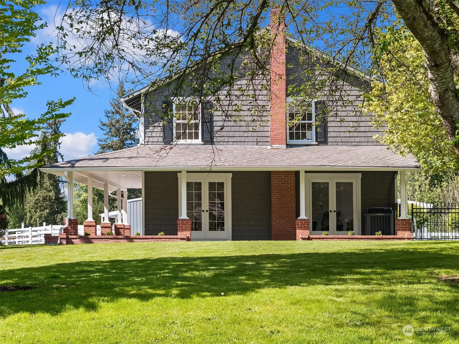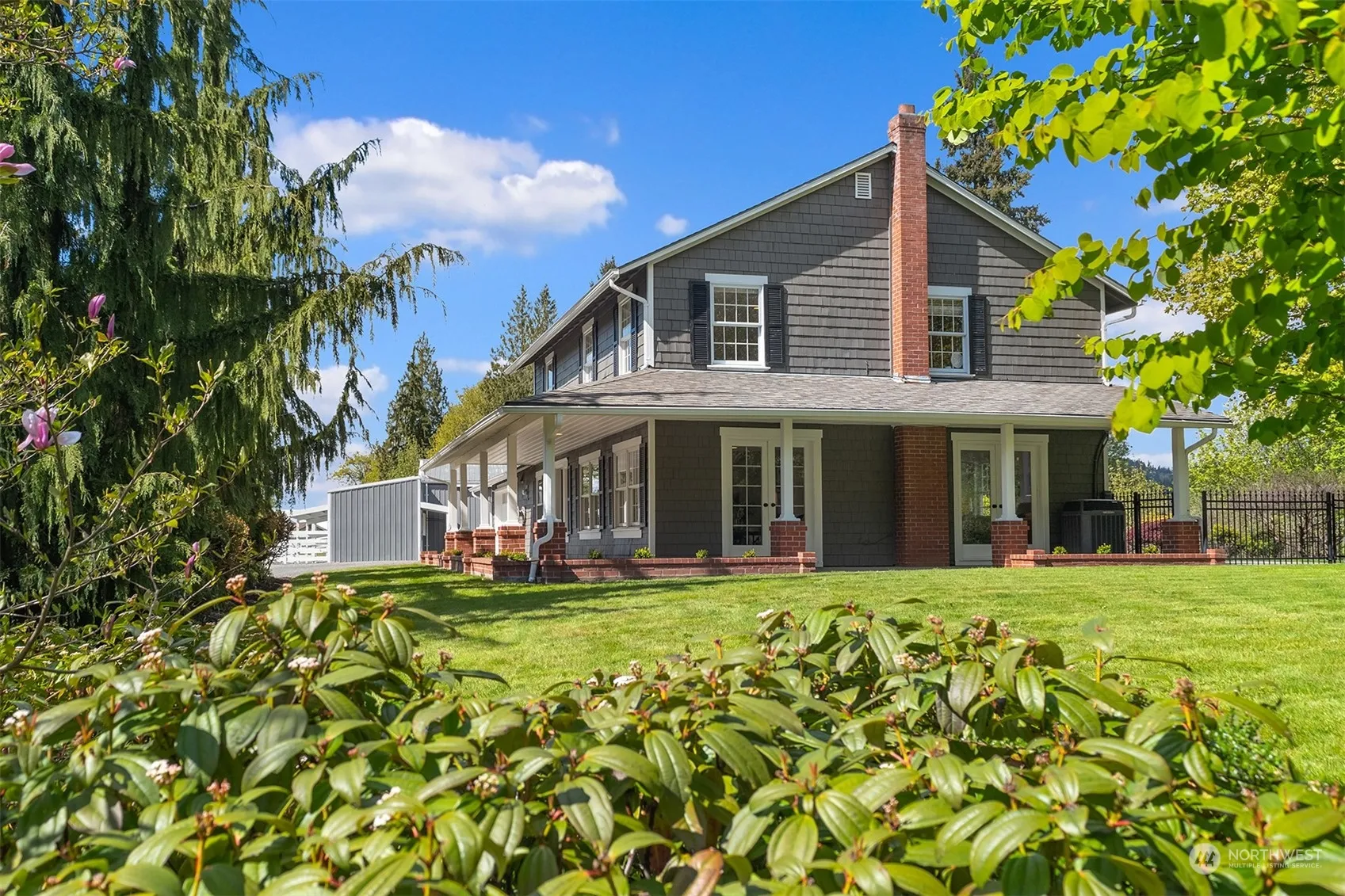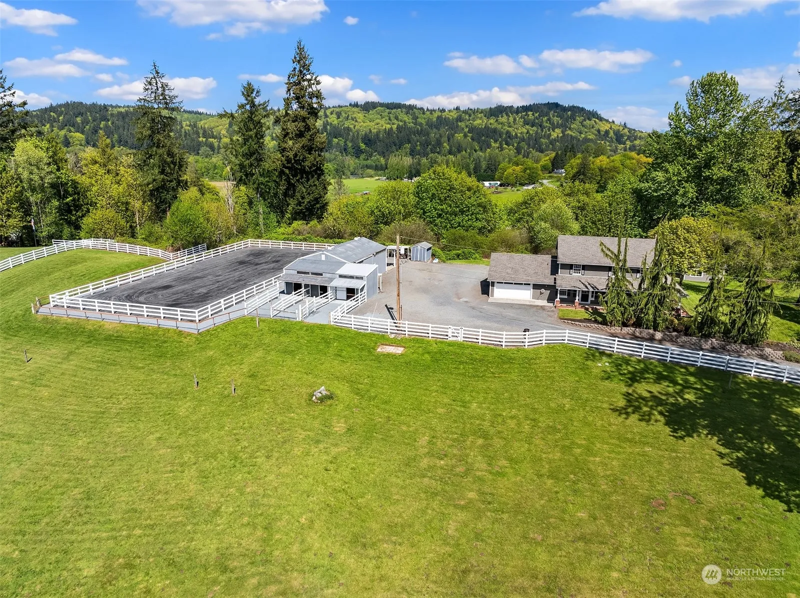 Grey Horse Farm, A storybook equestrian setting nestled in an enclave of Country Estates. Desirable Fales Road location, picturesque New England influenced home boasts a grand wrap around covered porch with lovely pastoral vistas. Fresh interiors include stained hardwoods, Quartz kitchen with adjoining dining, French doors, new paint and carpet throughout & grand scale primary suite with Freestanding tub. Fenced rear yard with firepit, room to roam with sprawling lawns and grounds. Pool with decking and detached pool house with gas Sauna, and space for in-home office. 3-stall barn with shop, covered parking, gravel paddocks off stalls, tack room and year-round use 66 x 144 outdoor arena. Gorgeous pastoral setting, vinyl fencing throughout.