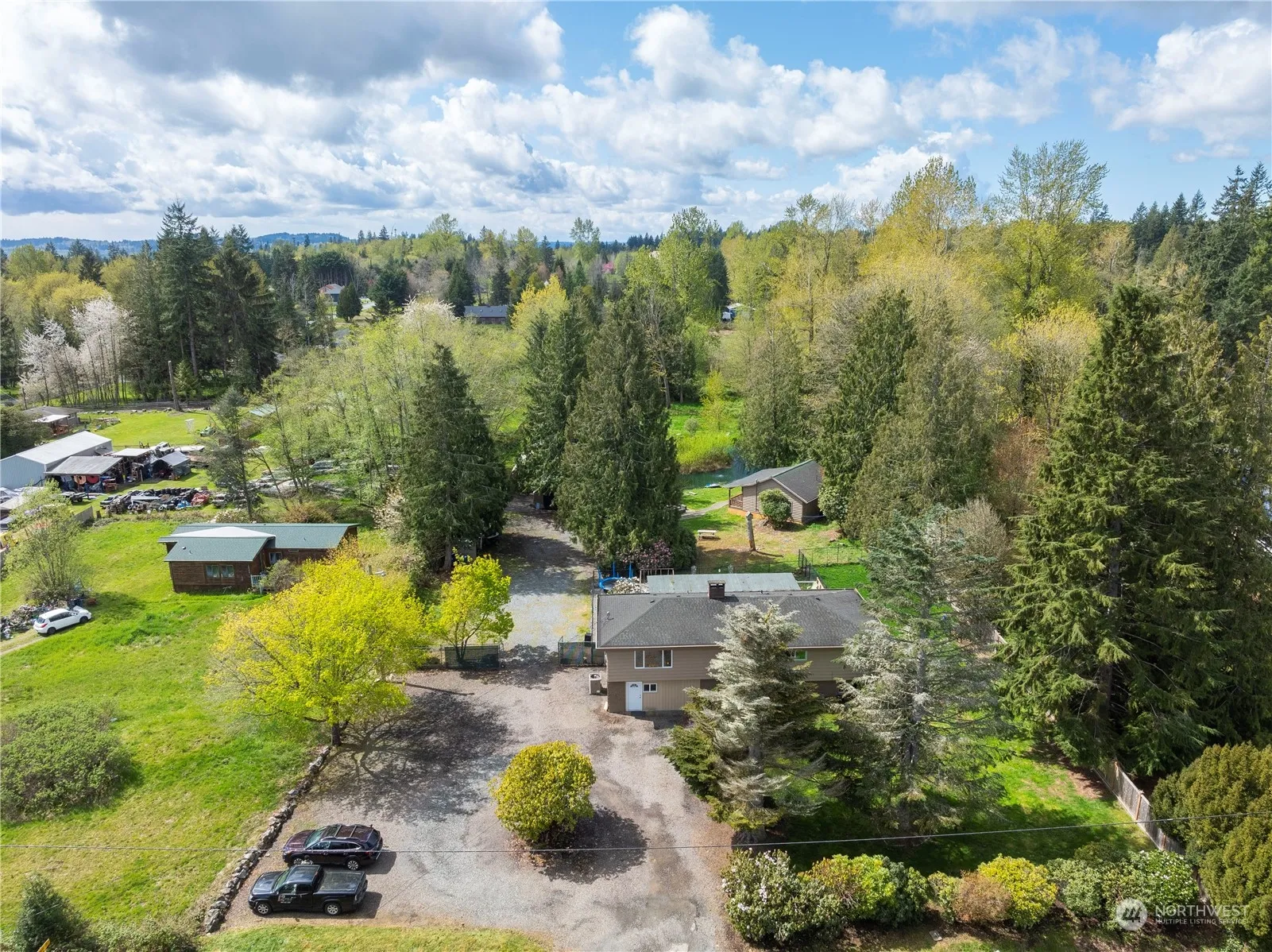 Live grand in this 2 home 7 bed 4 bath gated compound featuring practice fishing pond & massive 4 car shop. Primary home is 5 bedroom 2.25 bath The Guest DADU has 2 bedroom 1 bath overlooking aerated stocked pond with Trout Coy & Blue Gill. The level 1.6 acre lot feels much larger. This home has fenced pasture for goats, chickens and multiple dog runs. The ultimate entertaining complex boasts endless parking, a massive pagoda and stately slate fire pit. So much love and attention lavished on the essentials featuring 2 new septic tanks with updated drainage field. New roof on the gigantic 4 car shop. Limited showing times available due to number of pets and inhabitants. Come be charmed by a residence that truly has it all.