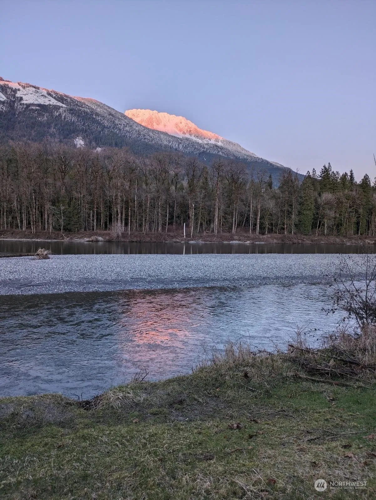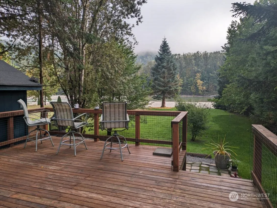 MAGNIFICENT MT SAUK VIEW .36 acres on Skagit river. 90 MIN COMMUTE to Everett or work remotely. STEPPED TERRACES: fish from river; large, parklike play area or garden. ABOVE FLOOD level: house; 16×16 BBQ DECK; pumphouse. DETACHED WORKSHOP/BUNGALOW. Used as third bedroom, craft shop. Lots of UPGRADES where it counts: ADA Accessible; sweet water well with insulated lines; 80g compression tank; updated septic system. REMODELED OPEN FLOOR PLAN for allergy free cleaning, pets and wheelchair: limestone core vinyl flooring; LARGE KITCHEN with pantry. HOME OFFICE. Video studio or craft area. Wood stove. GORGEOUS VIEW at Master bed and bath: low rise shower. PARKING- 7 VEHICLES. 300 gallon rainwater tank; covered boat storage; generator pad.