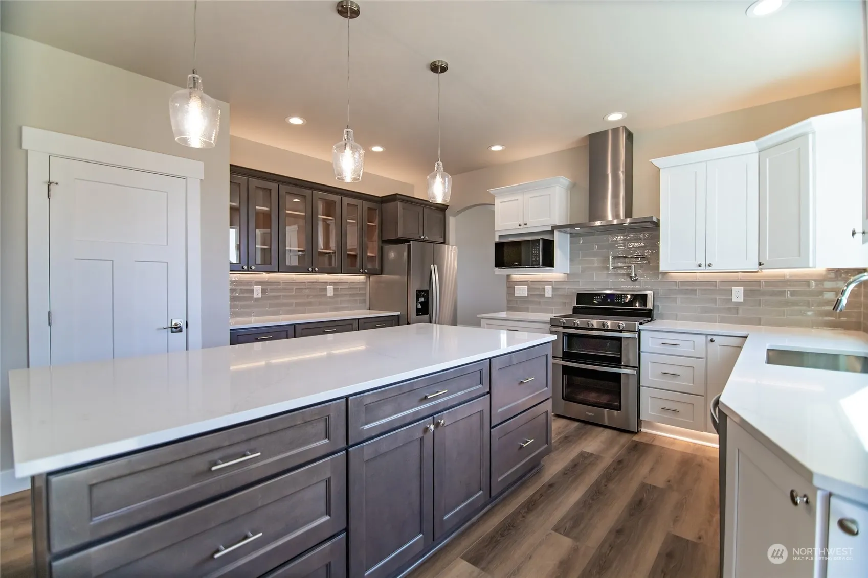 This new construction home has a suite on the lower level with a primary and 4 large bedrooms upstairs. The lower level has a large kitchen and living room area that leads out onto a spacious patio with fully fenced and irrigated yard. Our largest floor plan, this home also has a secondary living room space and potential formal dining area. This builder spends time and effort on details such as motion sensor lighting in bathrooms with tile and custom shower doors, over and under cabinet lighting in the kitchen, quartz counters and custom shelving in every closet and pantry just to name a few. The large three car garage includes smart garage door opener and wiring for an electric car. All kitchen appliances are included.