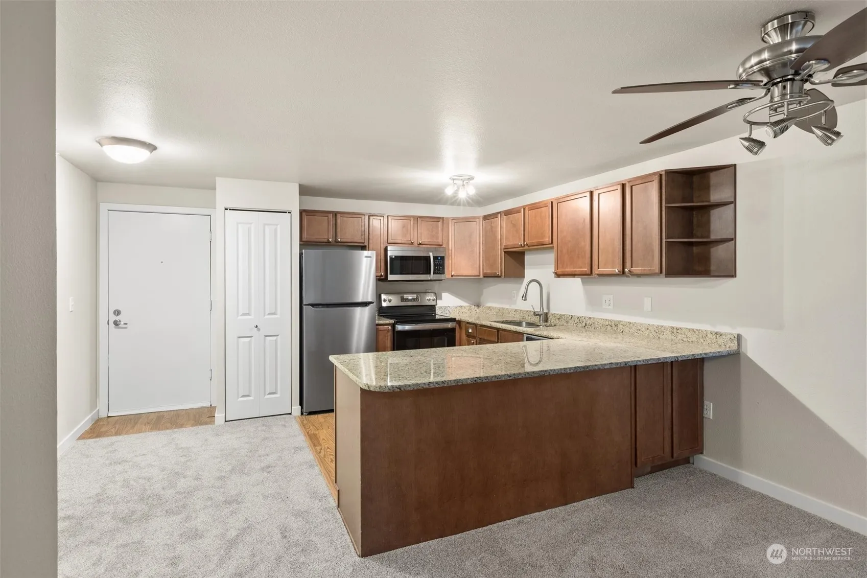 Come home to this beautiful unit at Arrington Place in Issaquah! New carpet, new paint, and new stainless-steel appliances! Gorgeous 2bd/1ba end unit at garden level, flooded with natural light. Huge updated kitchen with slab granite counters, plenty of cabinet space & breakfast bar. The open living space includes dining rm, generous living rm, fireplace, & slider to the south-facing deck. Spacious primary bedroom features corner windows. Updated full bath, nicely sized 2nd bdrm, stackable W/D, extra storage space across hall. Comprehensive HOA. And at Arrington Place you’re just steps from the trails and minutes to I-90 and downtown Issaquah with its shops and restaurants! Don’t miss this combination of comfort, beauty and convenience!