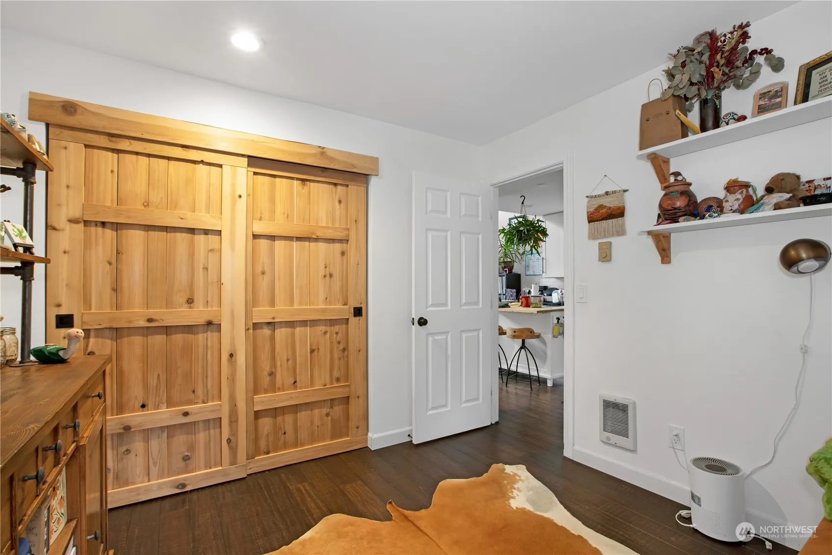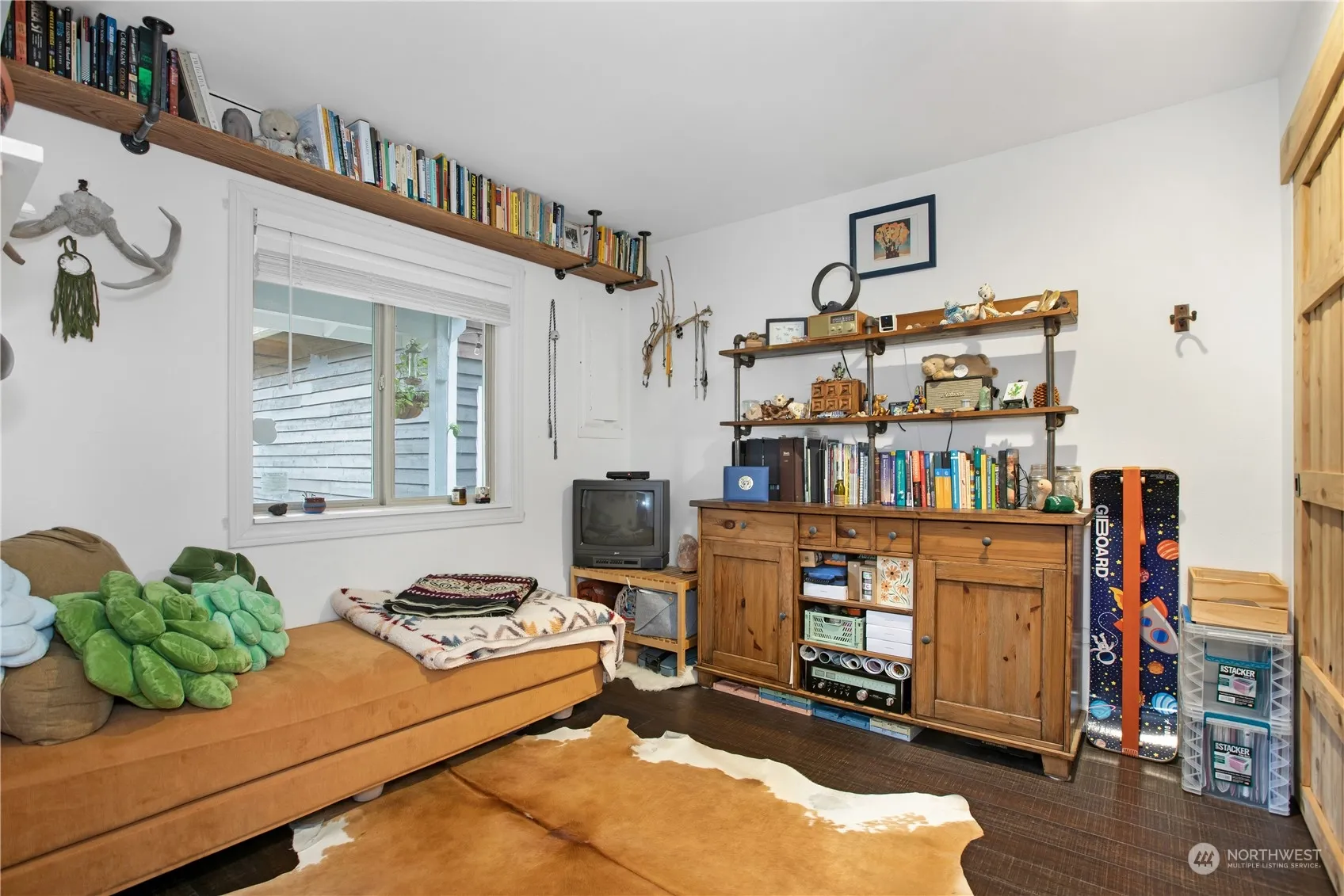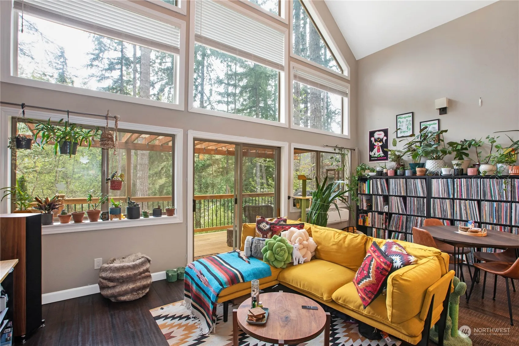 Bright & modern cabin/home w/ community lake access nestled in a wooded Northwest community at Lake Minterwood. The main floor features a bedroom, full bathroom, & laundry room. Desirable open concept great room w/ kitchen, dining & living room. Vaulted ceilings with floor to ceiling windows encompass views of the NW wooded dream. Quartz countertops, stainless kitchen appliances, bamboo/cork floors & newer roof on home. Upper loft-like suite w/ ¾ bath & walk-in closet. Two car detached garage w/ fully finished detached office/studio behind garage. Fruit trees and tons of space to garden. Fully fenced back yard and huge deck great for entertaining & morning coffee. Home has short walking path access to Lake Minterwood & Park Trails.